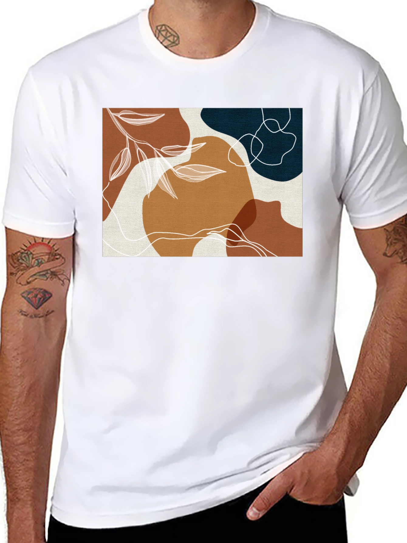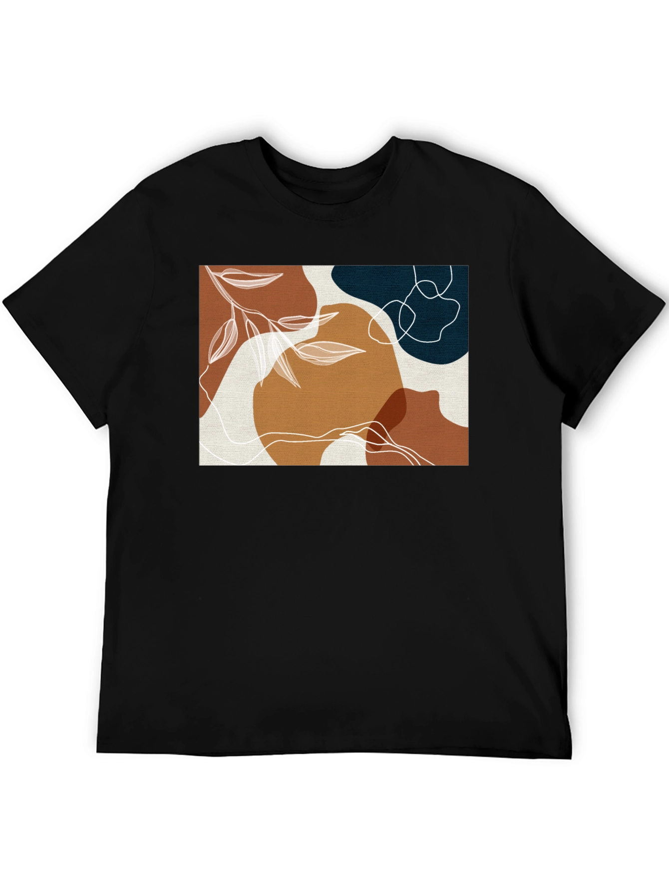 Elevate your style with this striking graphic tee. Featuring an eye-catching abstract art design in a palette of earthy browns, creams, and deep blues, this shirt makes a bold statement. The modern artwork includes organic shapes and delicate line drawings of leaves, creating a sophisticated and contemporary look. Crafted from a soft, breathable fabric, it offers all-day comfort and a relaxed fit. Perfect for casual outings, art enthusiasts, or anyone who appreciates unique fashion. Pair it with jeans or chinos for an effortlessly cool ensemble.