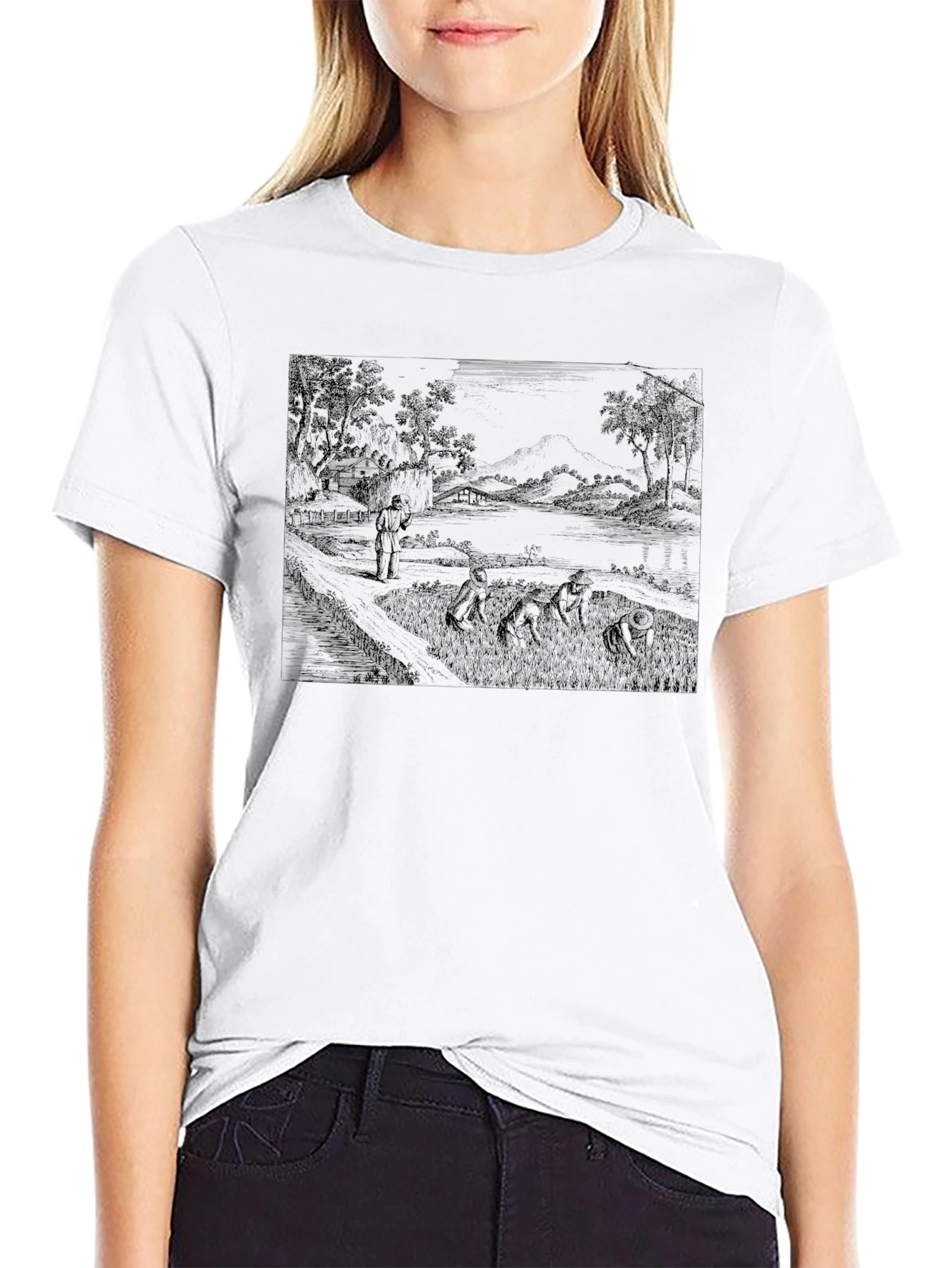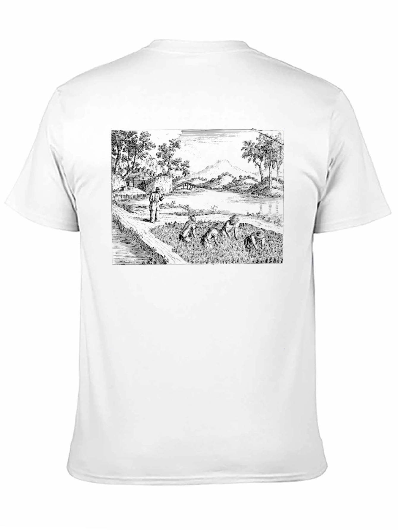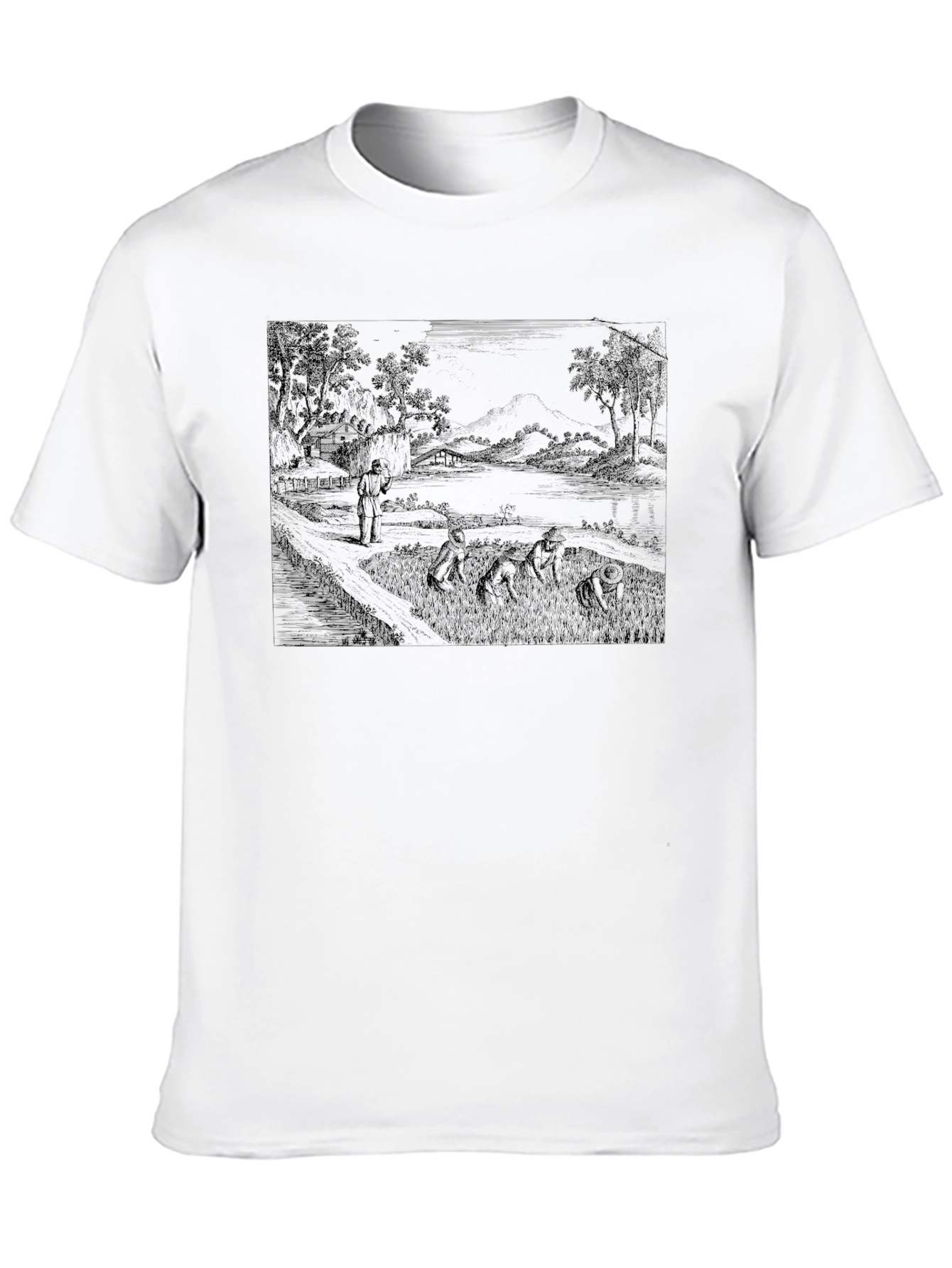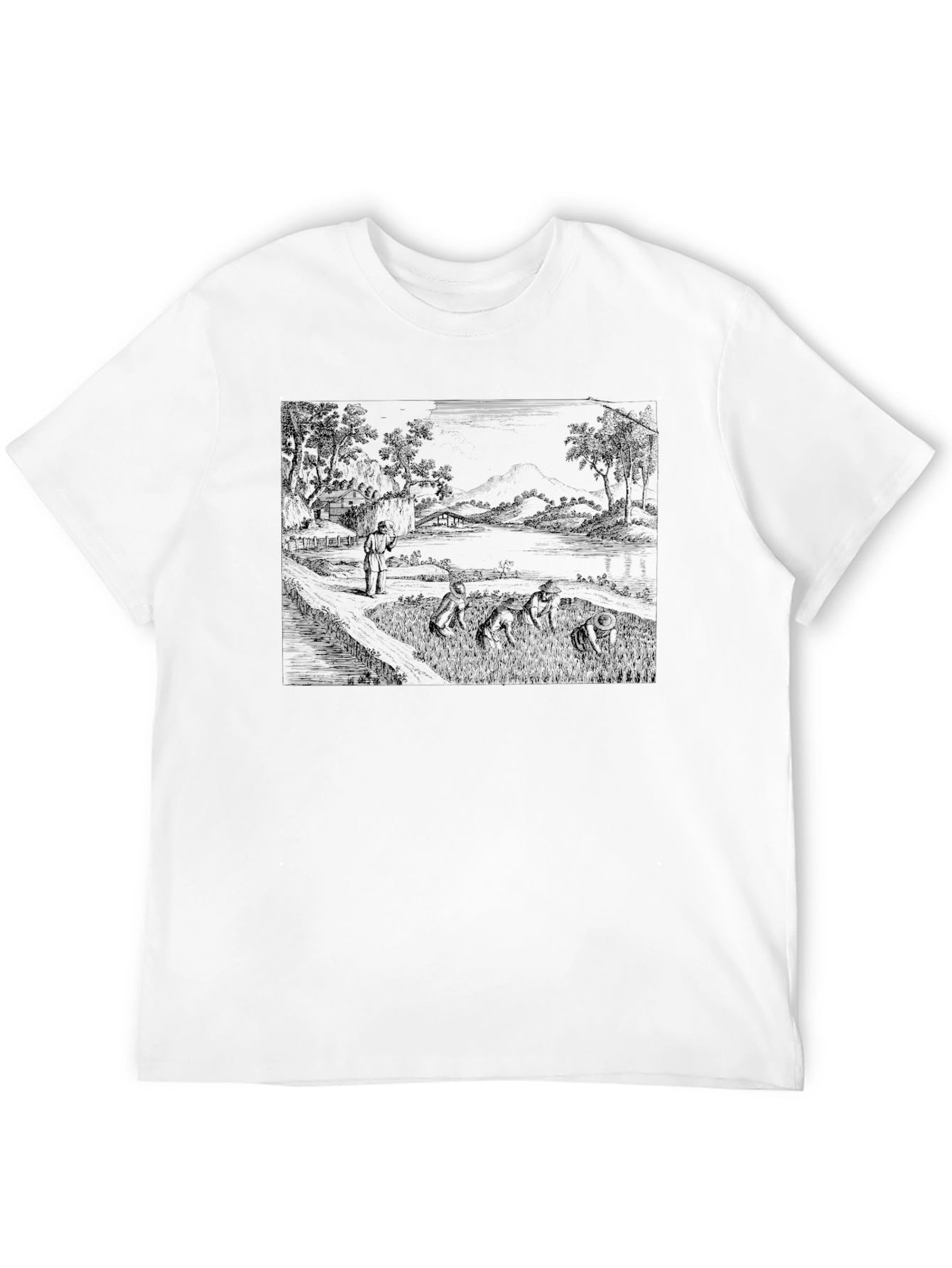 This striking black t-shirt features a unique and intriguing design. The print showcases a detailed vintage-style landscape, possibly depicting a serene countryside scene with figures. The dark print creates a bold contrast against the black fabric. Crafted from a comfortable, breathable material, this tee offers both style and ease. Perfect for casual wear, it's ideal for adding an artistic flair to your everyday look. This t-shirt is a standout piece for anyone who appreciates art. It makes a great gift, too!