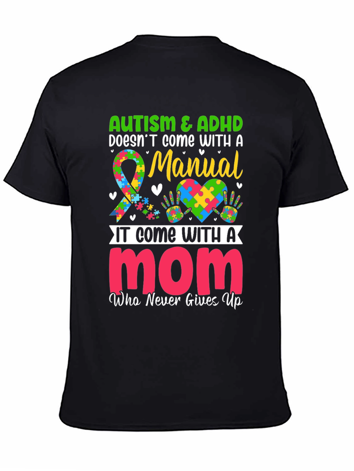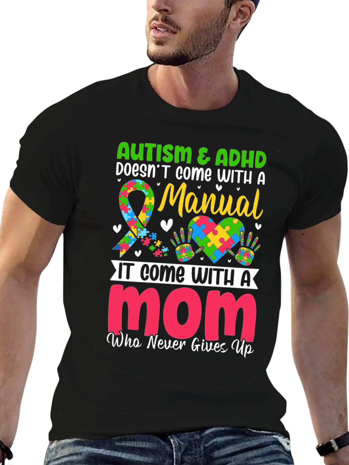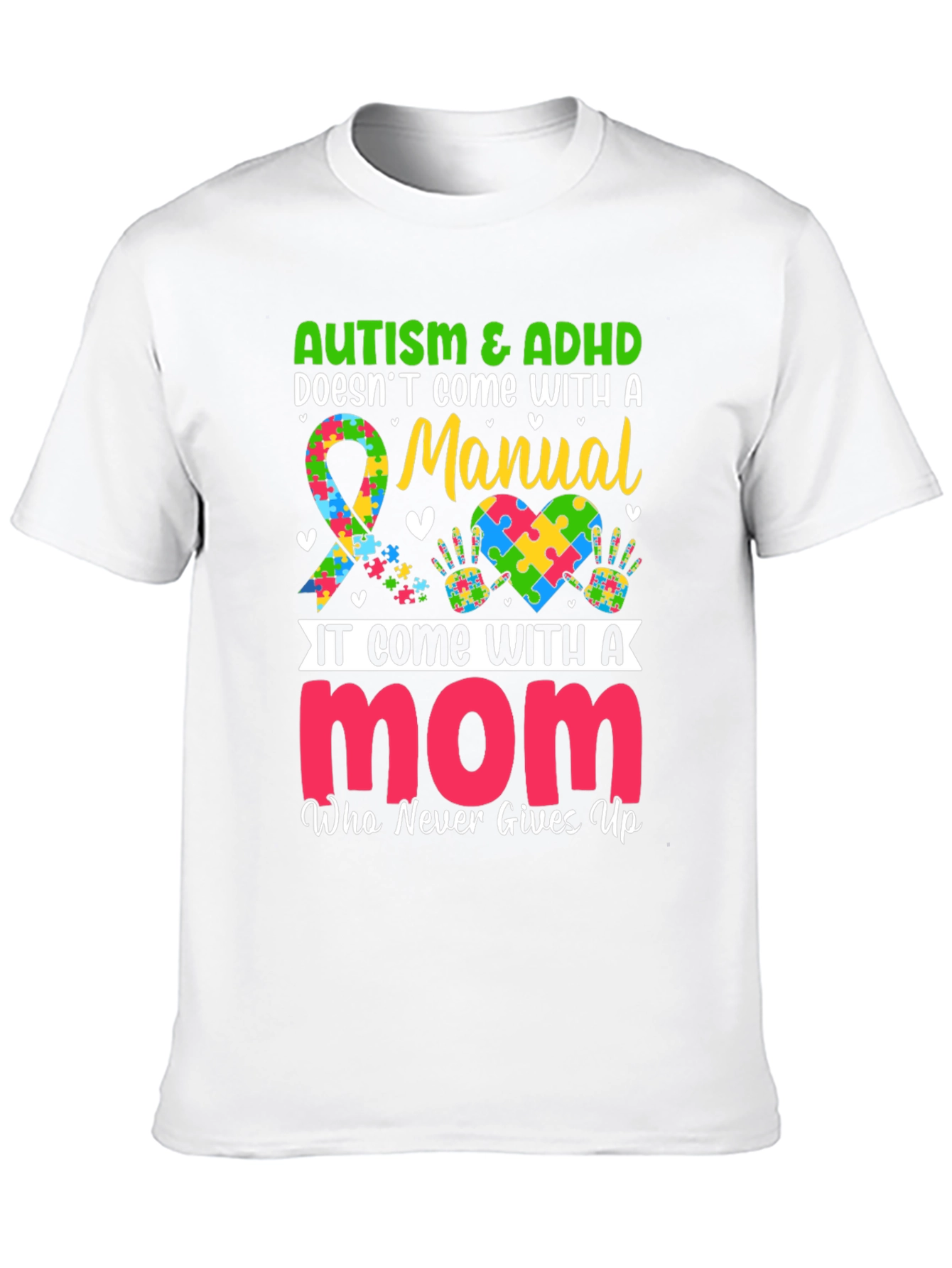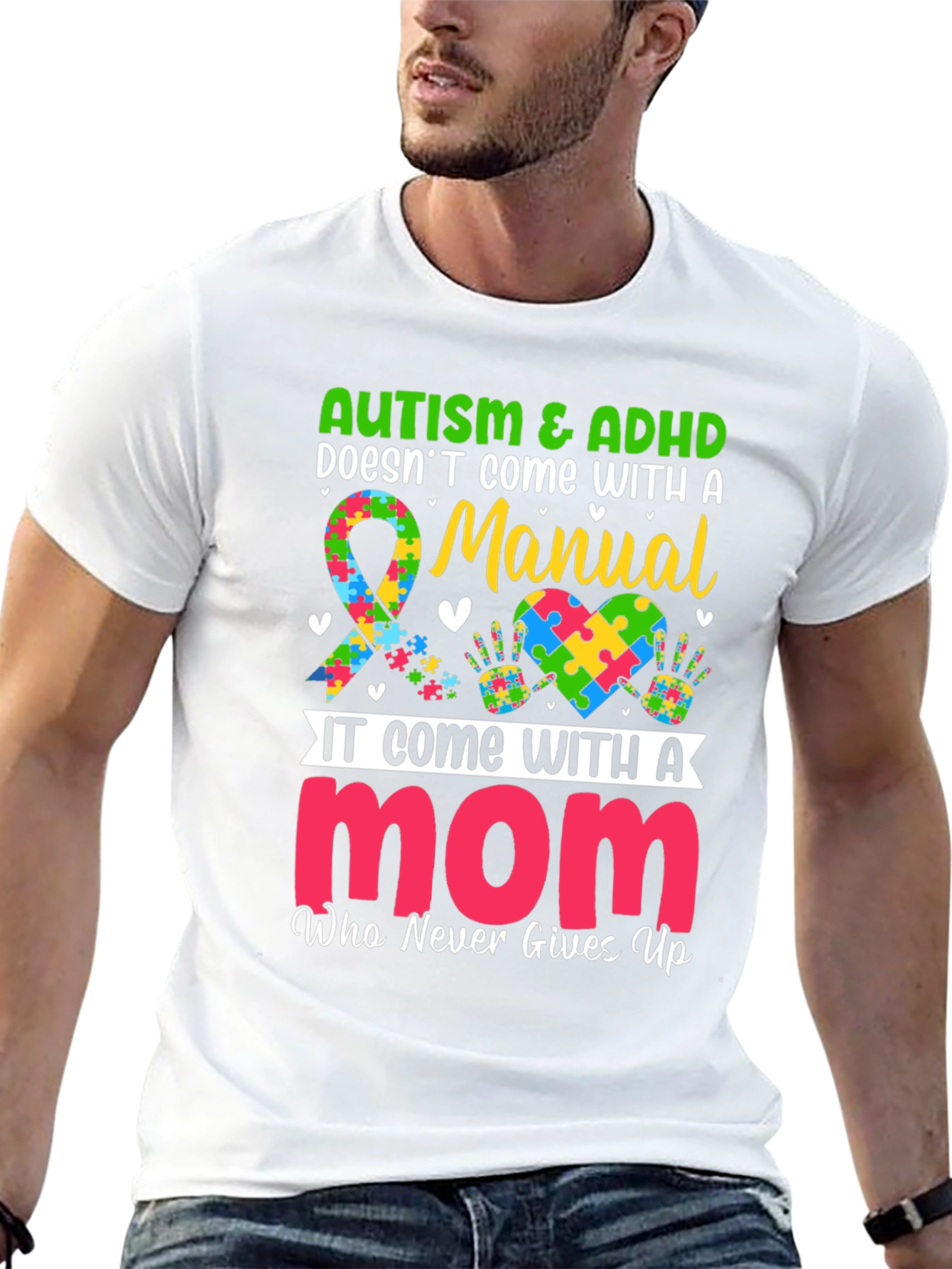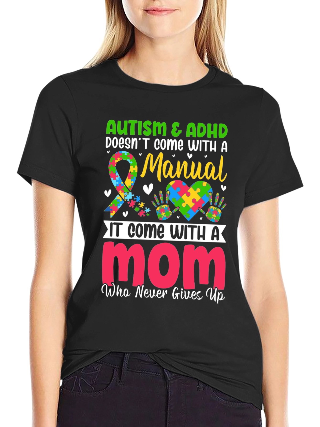 Show your support with this heartwarming Autism & ADHD awareness t-shirt. Featuring a vibrant design with puzzle piece elements symbolizing autism, this shirt proudly declares "Autism & ADHD Doesn't Come With A Manual, It Comes With A Mom Who Never Gives Up". The design incorporates colorful graphics including a ribbon, heart, and handprints all crafted from puzzle pieces. This classic fit tee is perfect for mothers who champion their children with autism and ADHD. Wear it to support groups, awareness walks, or as a daily reminder of your unwavering love and dedication. A thoughtful gift for any special mom!