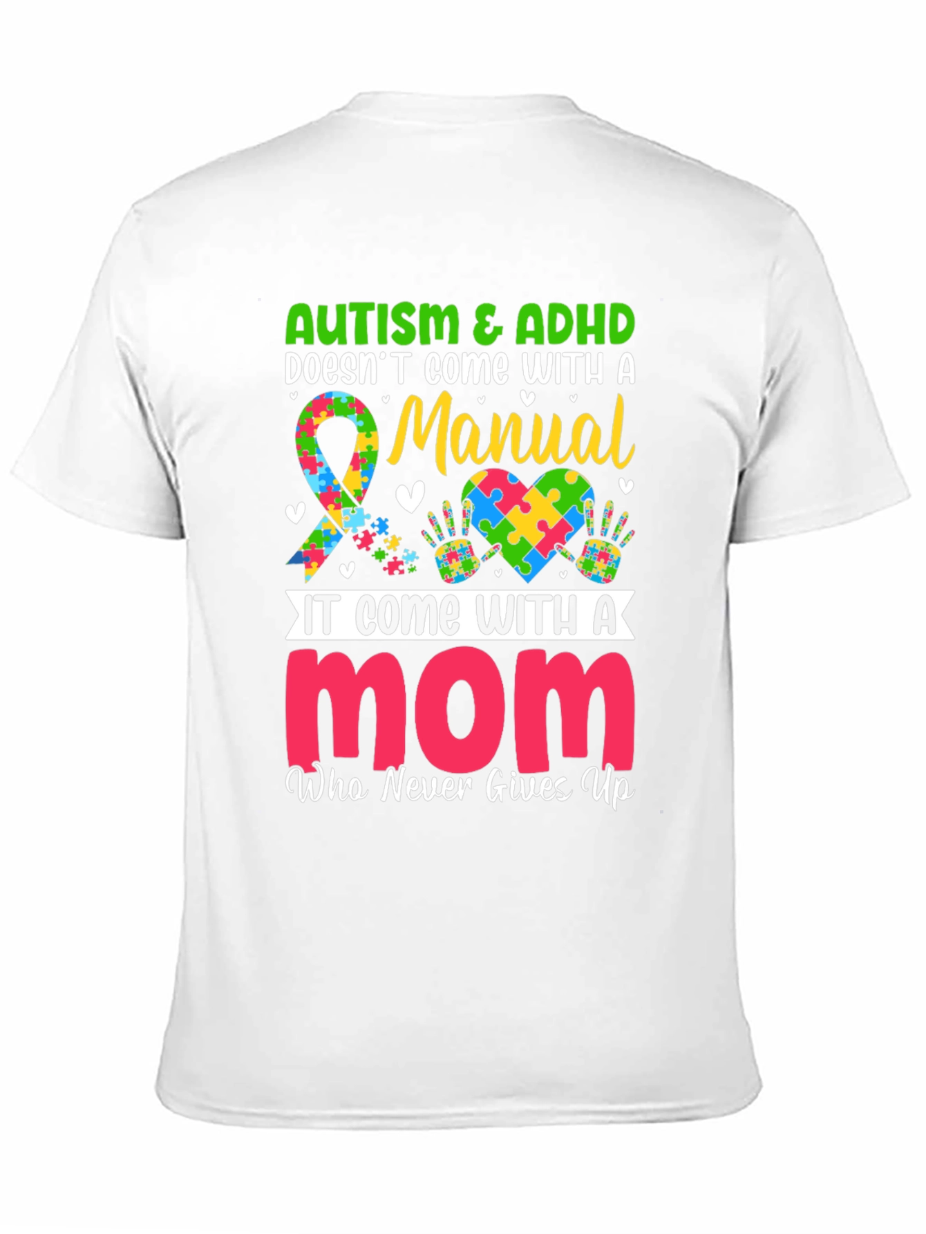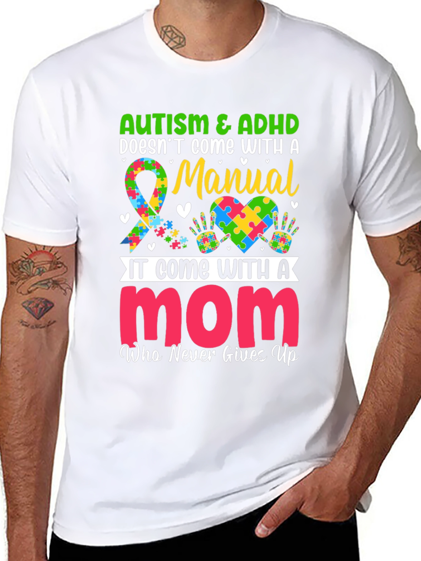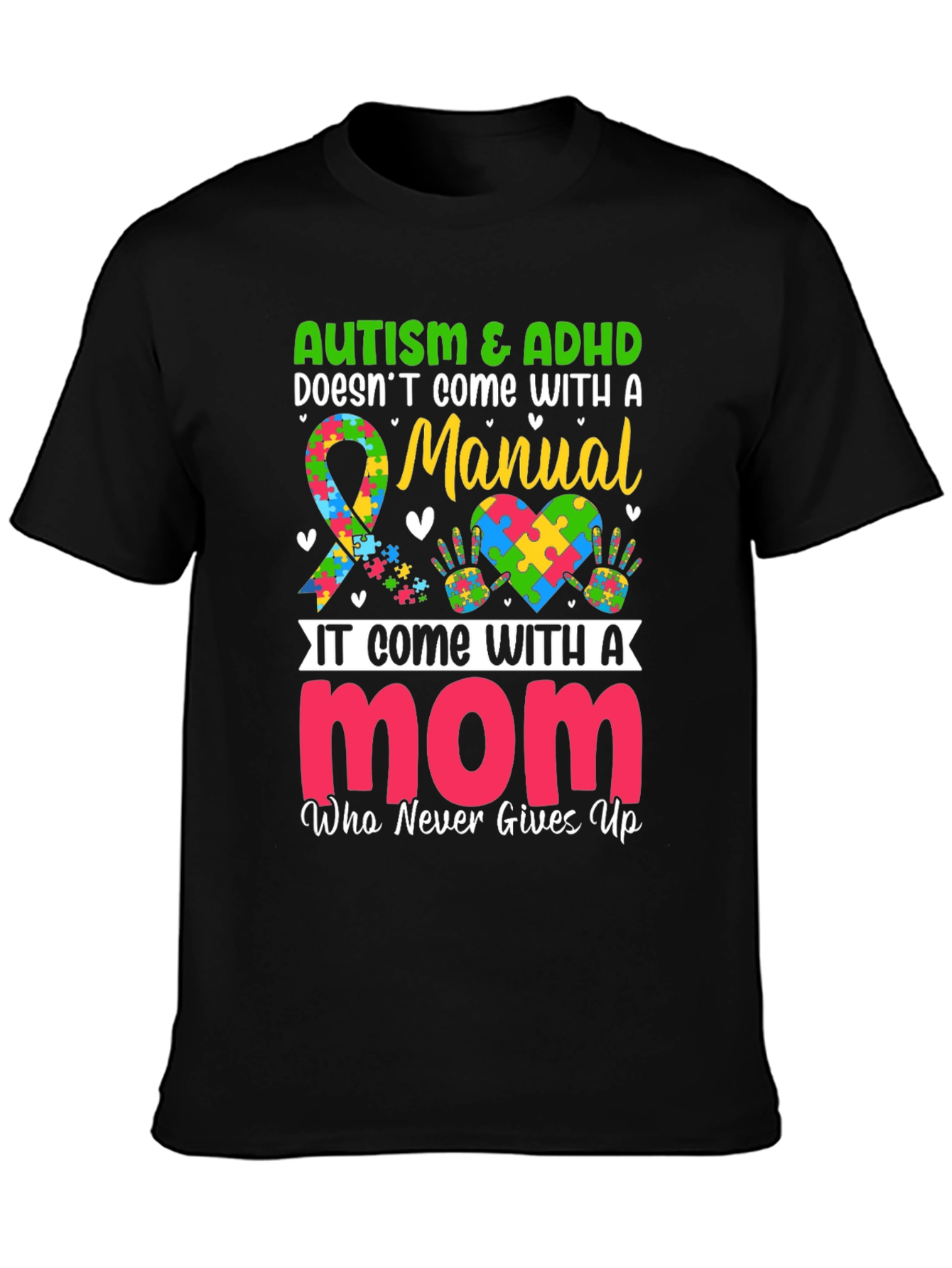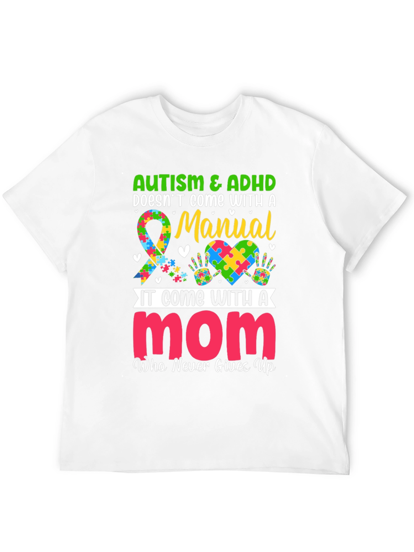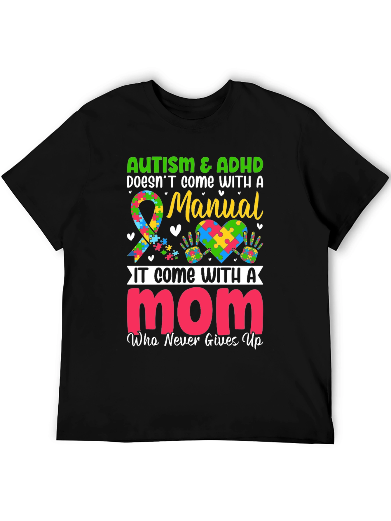Show your support with this heartwarming Autism & ADHD awareness t-shirt. Featuring a vibrant design with puzzle piece elements symbolizing autism, this shirt proudly declares "Autism & ADHD Doesn't Come With A Manual, It Comes With A Mom Who Never Gives Up". The design incorporates colorful graphics including a ribbon, heart, and handprints all crafted from puzzle pieces. This classic fit tee is perfect for mothers who champion their children with autism and ADHD. Wear it to support groups, awareness walks, or as a daily reminder of your unwavering love and dedication. A thoughtful gift for any special mom!