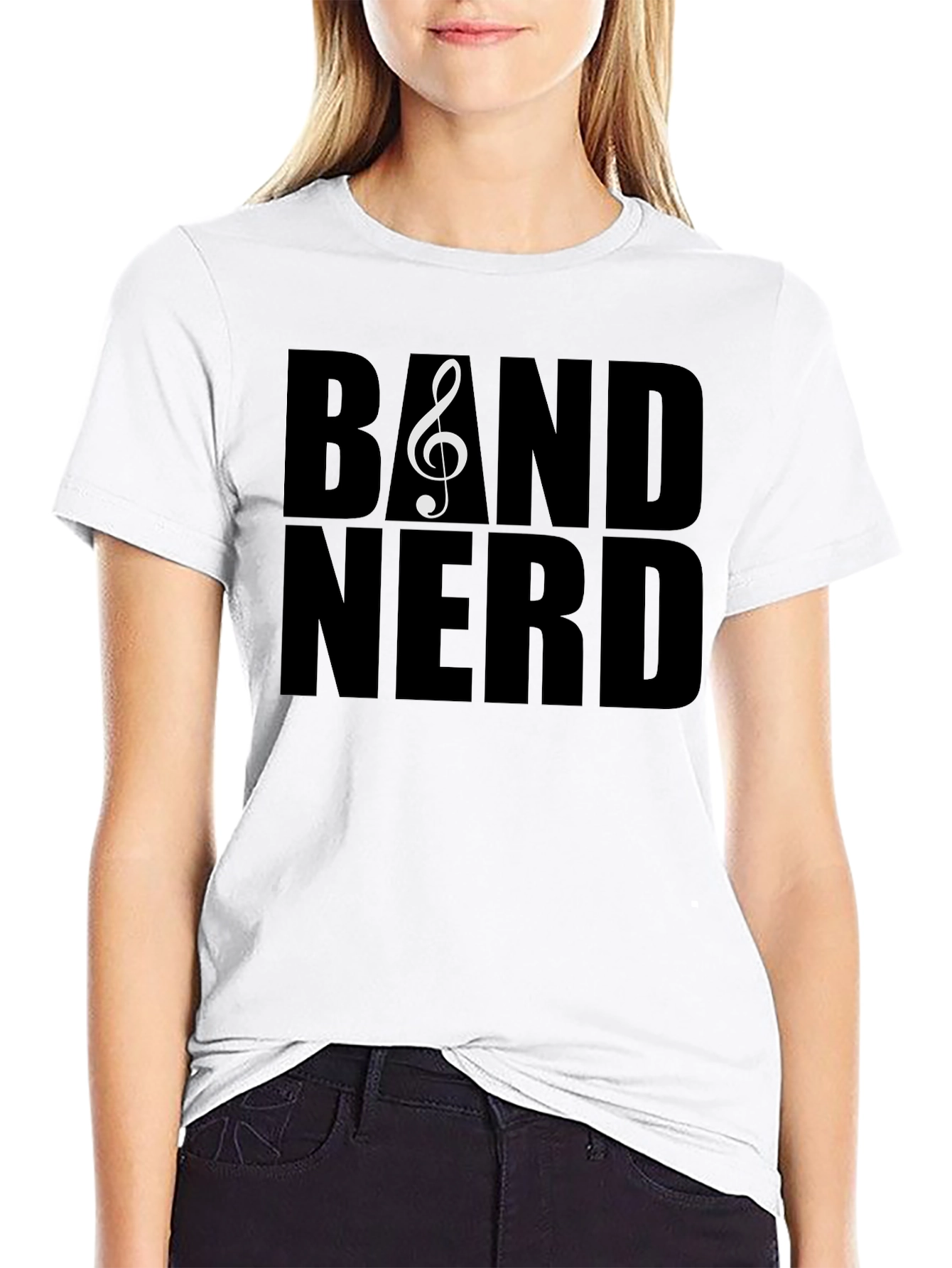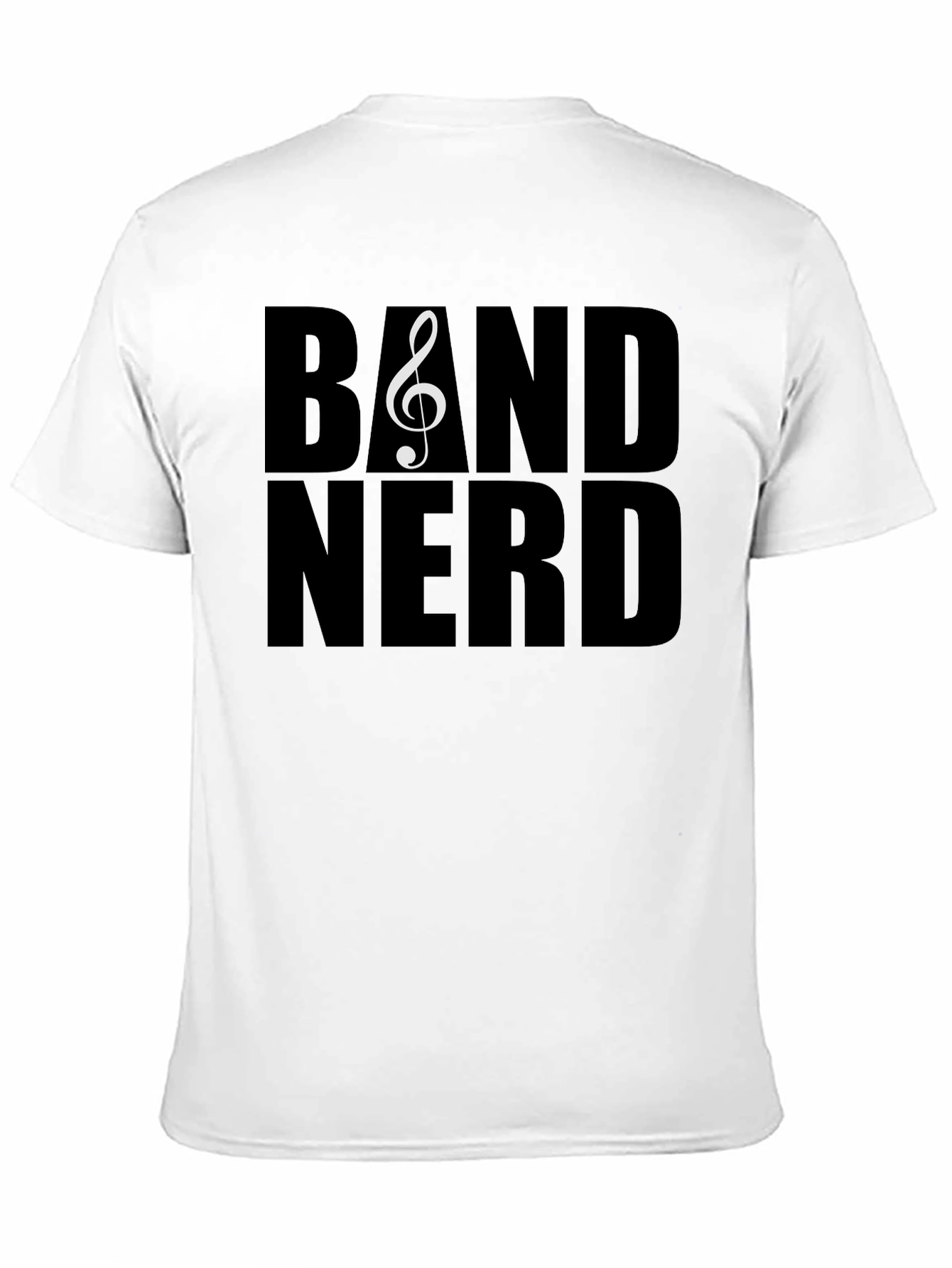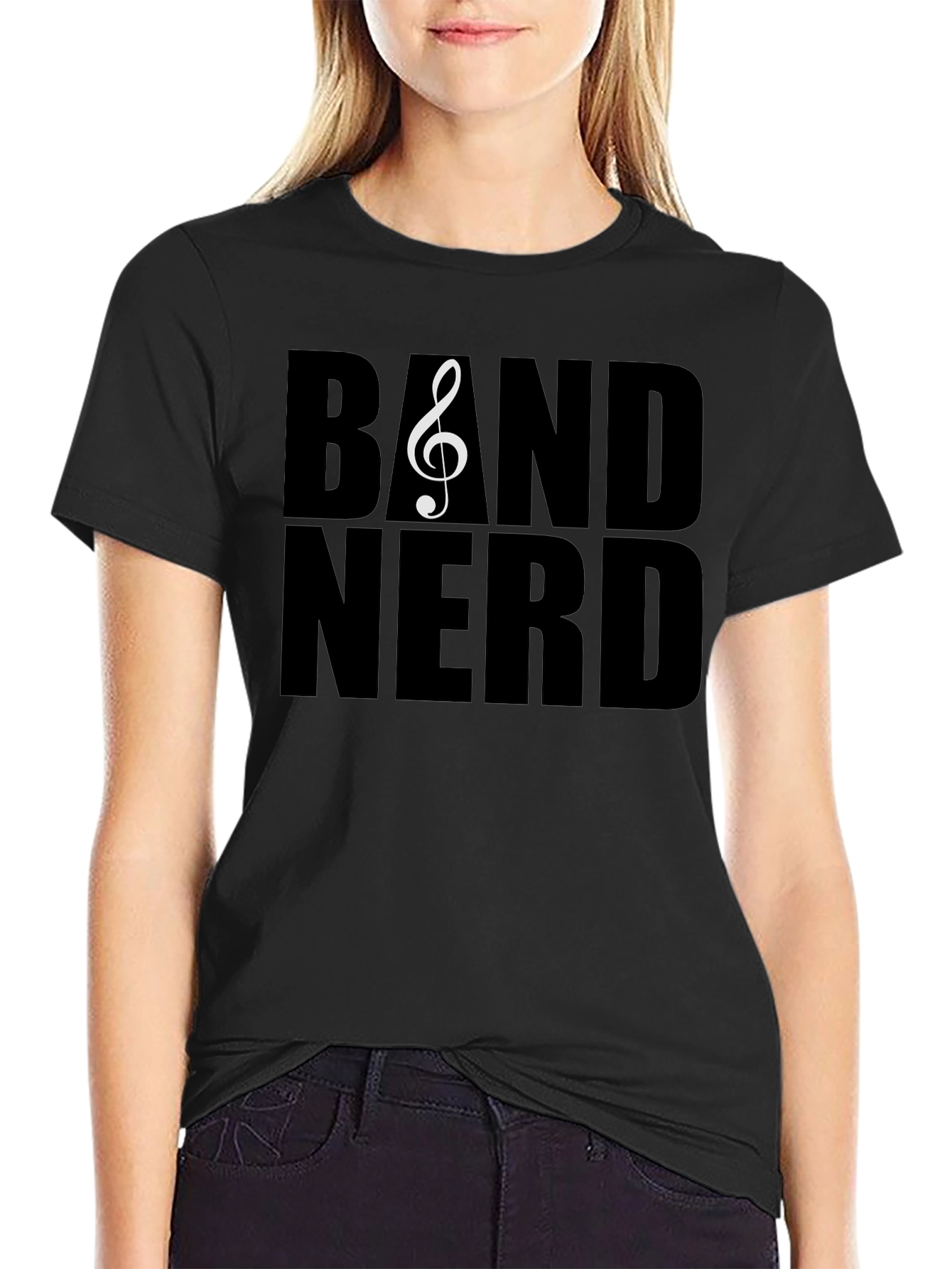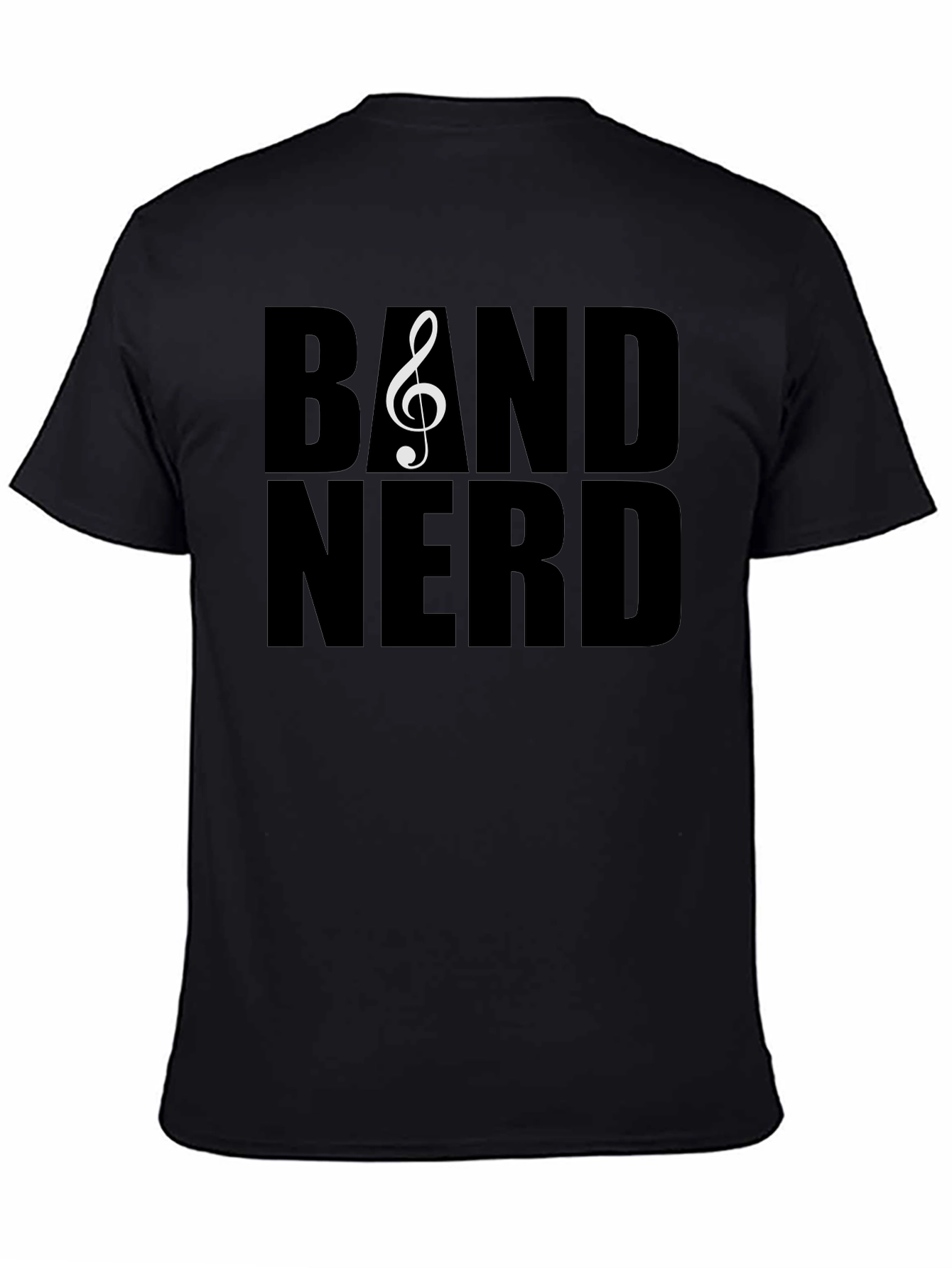 Show off your love for music with this stylish 'Band Nerd' T-shirt! This eye-catching tee features a bold, dark print of 'BAND NERD' with a sleek treble clef symbol. The shirt appears to be made from a comfortable dark-colored fabric, likely cotton or a cotton blend, offering both style and breathability. Perfect for band members, music students, or anyone who appreciates a good tune, this T-shirt is a fun way to express your passion. Wear it to rehearsals, concerts, casual outings, or simply as a statement piece. Grab yours today and let the world know you're proud to be a Band Nerd!
