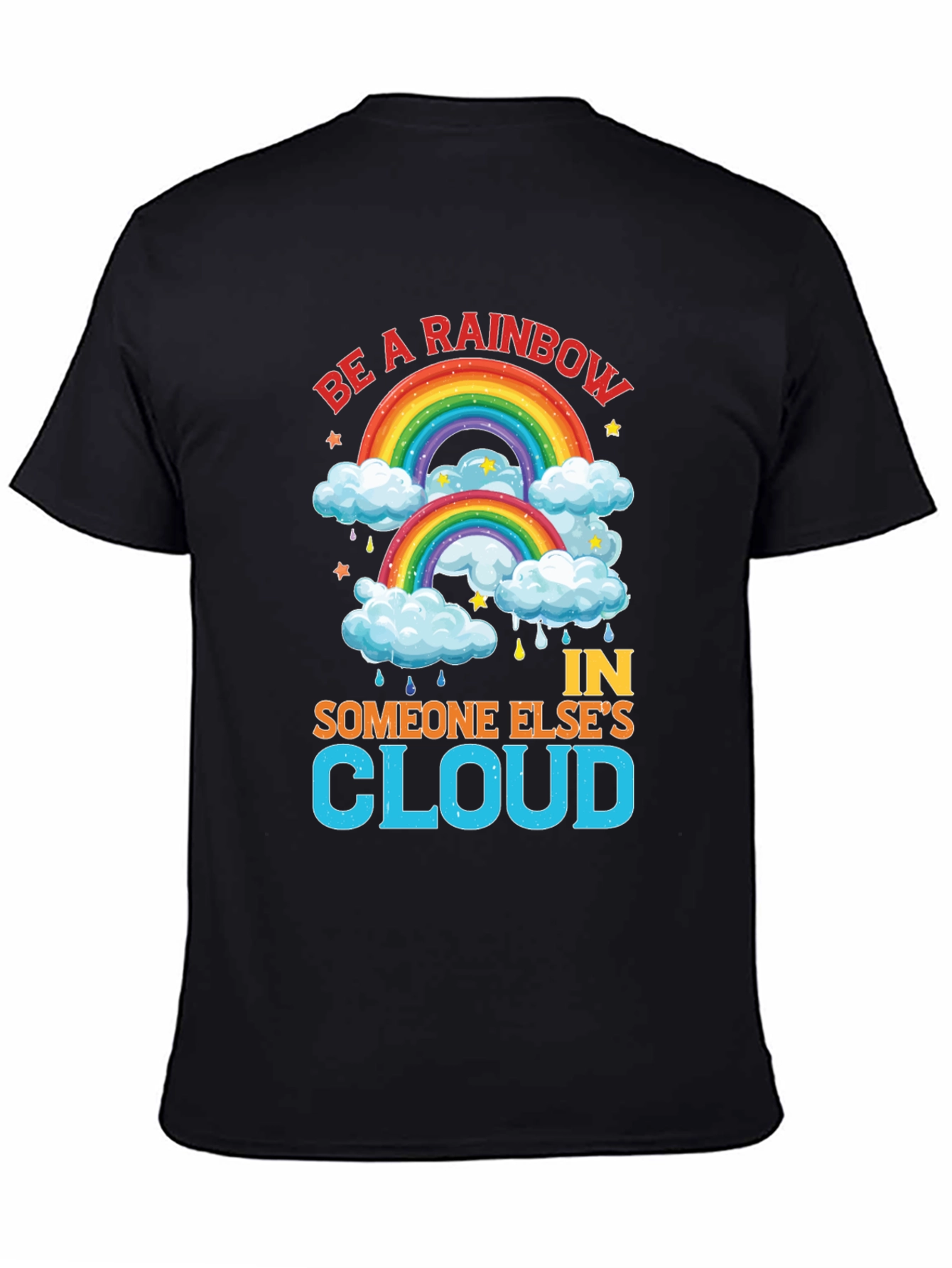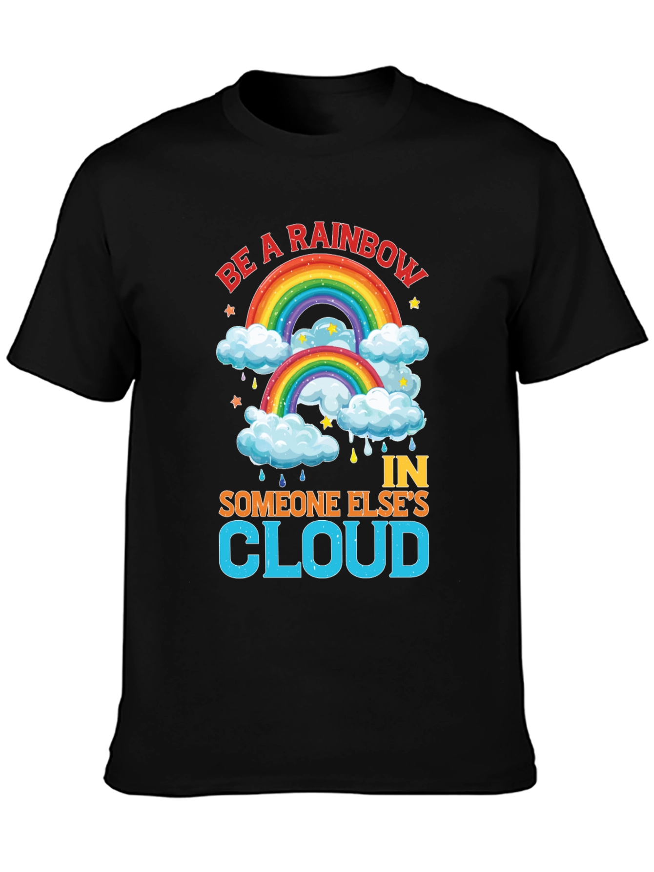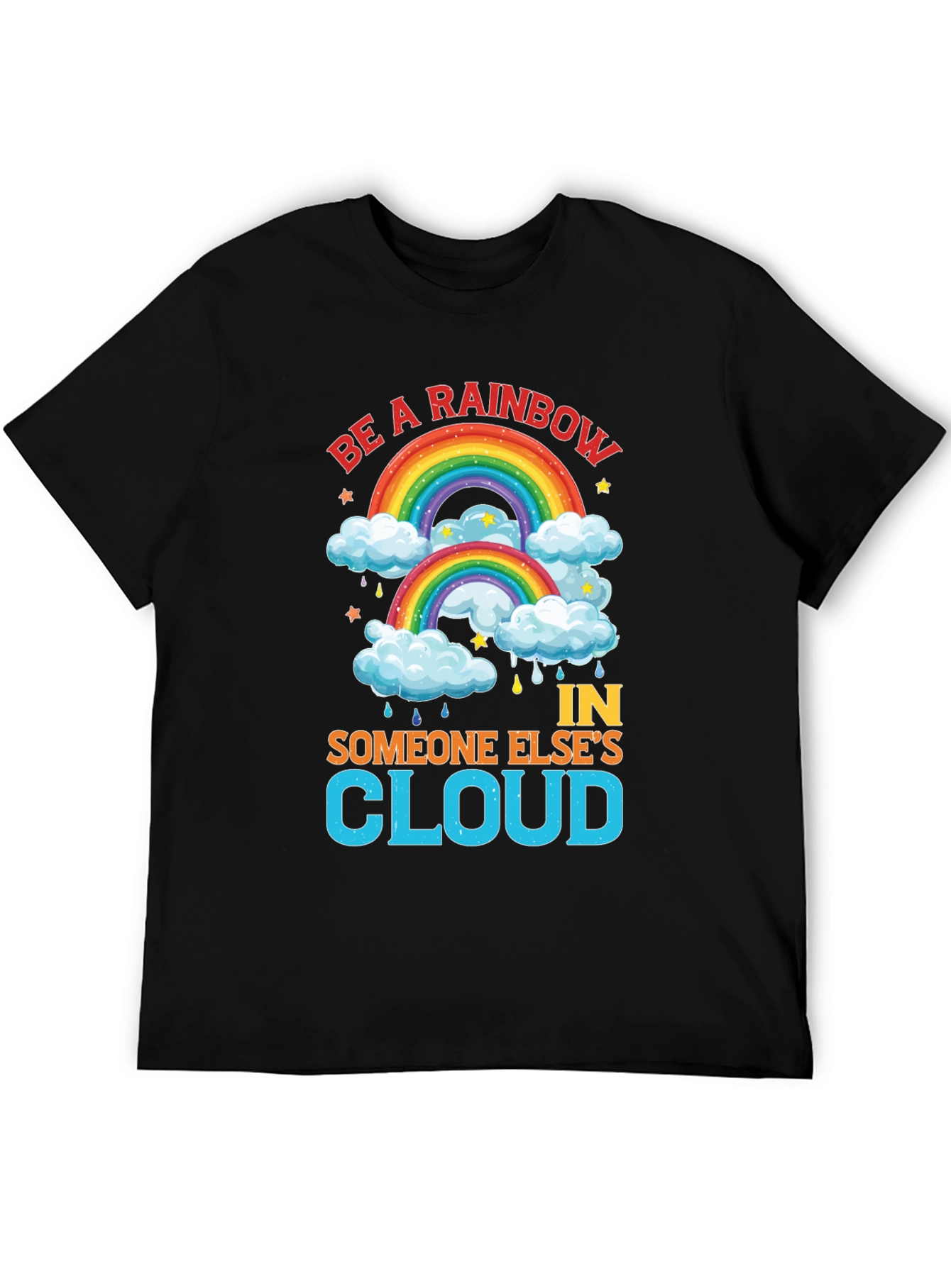Spread positivity with this vibrant black t-shirt featuring a cheerful rainbow design. The shirt displays the uplifting message "Be a Rainbow In Someone Else's Cloud," perfect for brightening anyone's day. Adorned with colorful rainbows, fluffy clouds, stars, and raindrops, the graphic is eye-catching and fun. Made from comfortable-looking fabric, this tee is ideal for casual wear, making a statement, or gifting to someone special. Its bold design and inspiring words will surely bring smiles and spread a message of hope and kindness.