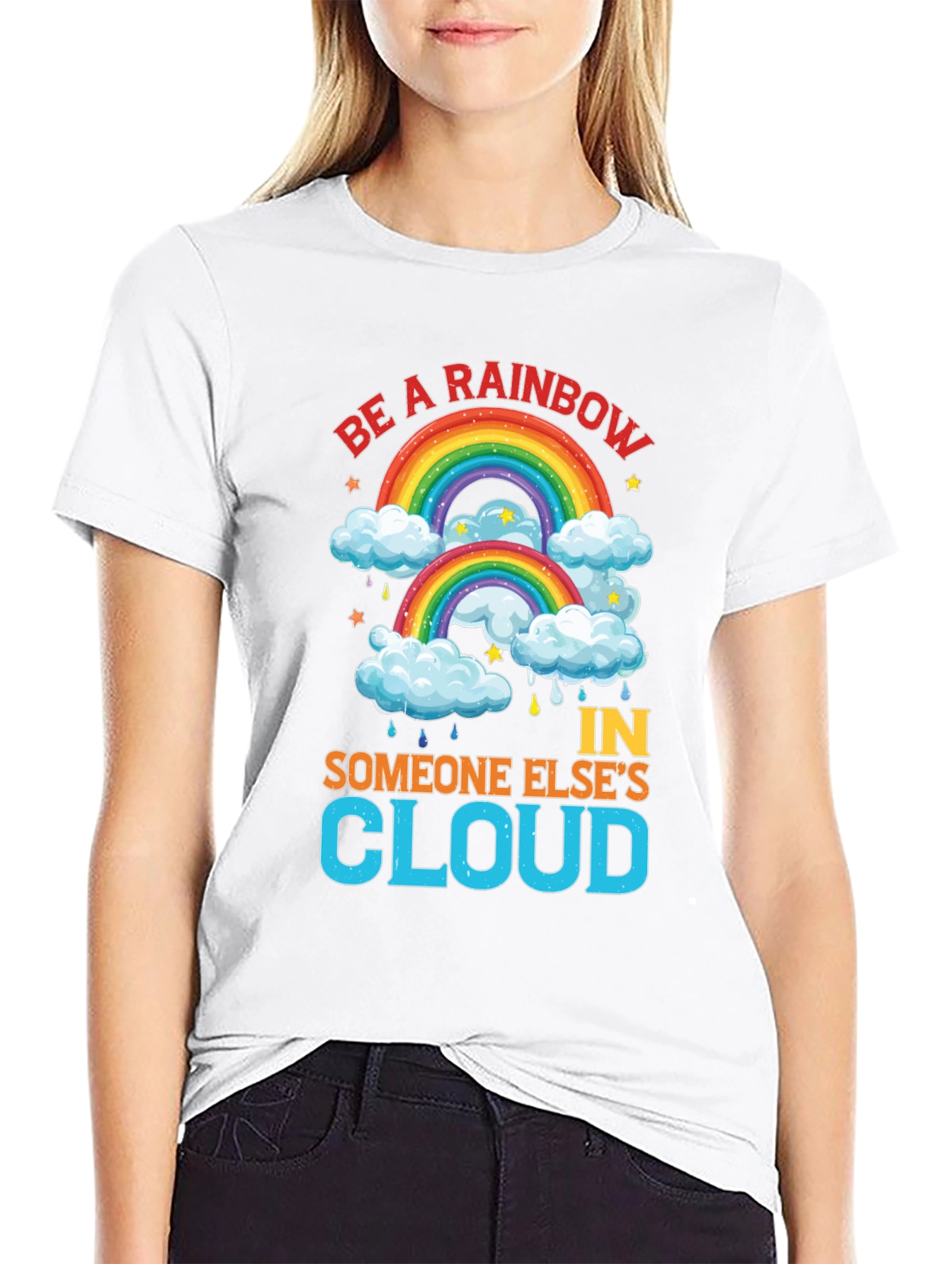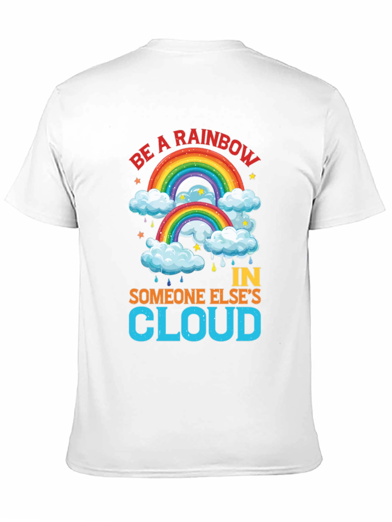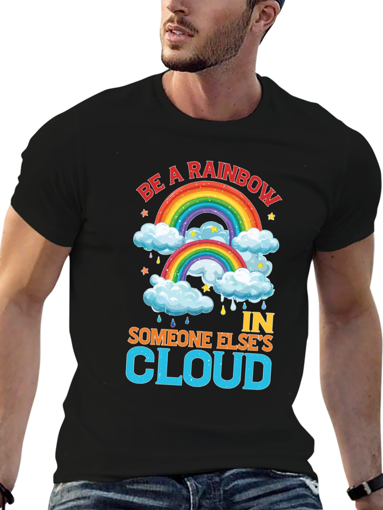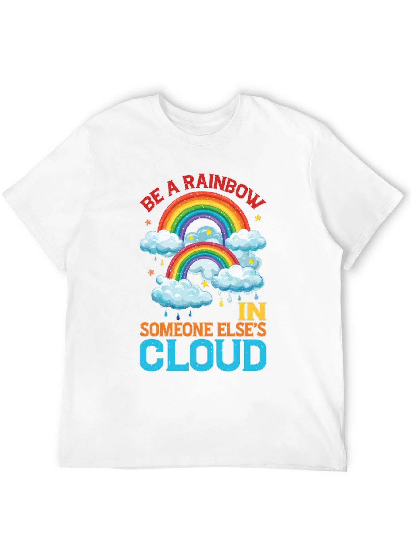Spread positivity with this vibrant black t-shirt featuring a cheerful rainbow design. The shirt displays the uplifting message "Be a Rainbow In Someone Else's Cloud," perfect for brightening anyone's day. Adorned with colorful rainbows, fluffy clouds, stars, and raindrops, the graphic is eye-catching and fun. Made from comfortable-looking fabric, this tee is ideal for casual wear, making a statement, or gifting to someone special. Its bold design and inspiring words will surely bring smiles and spread a message of hope and kindness.