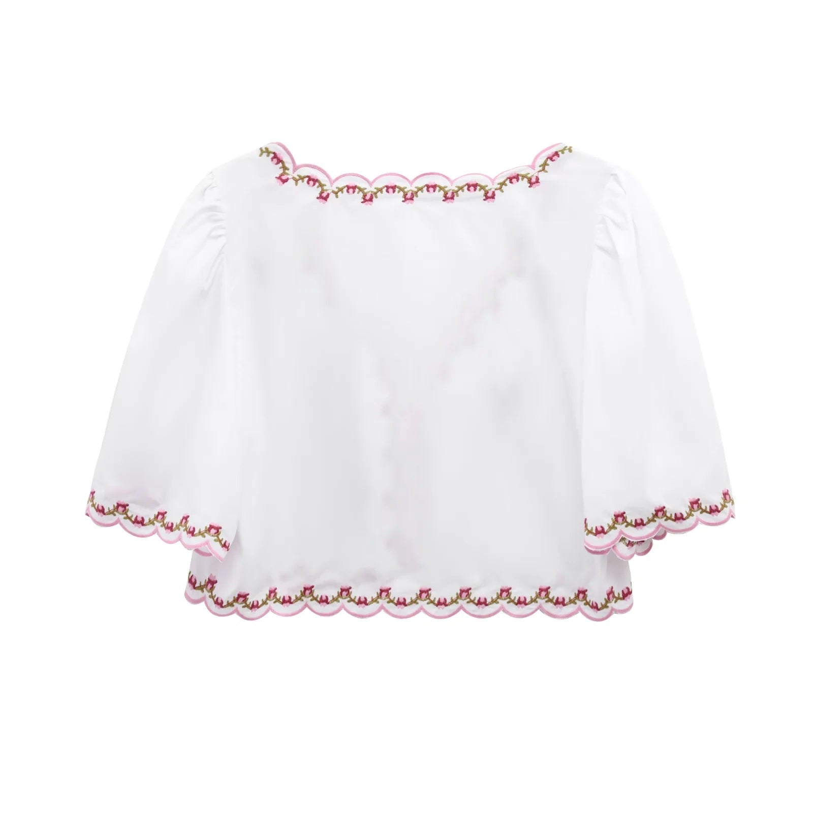 Floral Embroidered Poplin Top Short Sleeve Shirt Top for Women