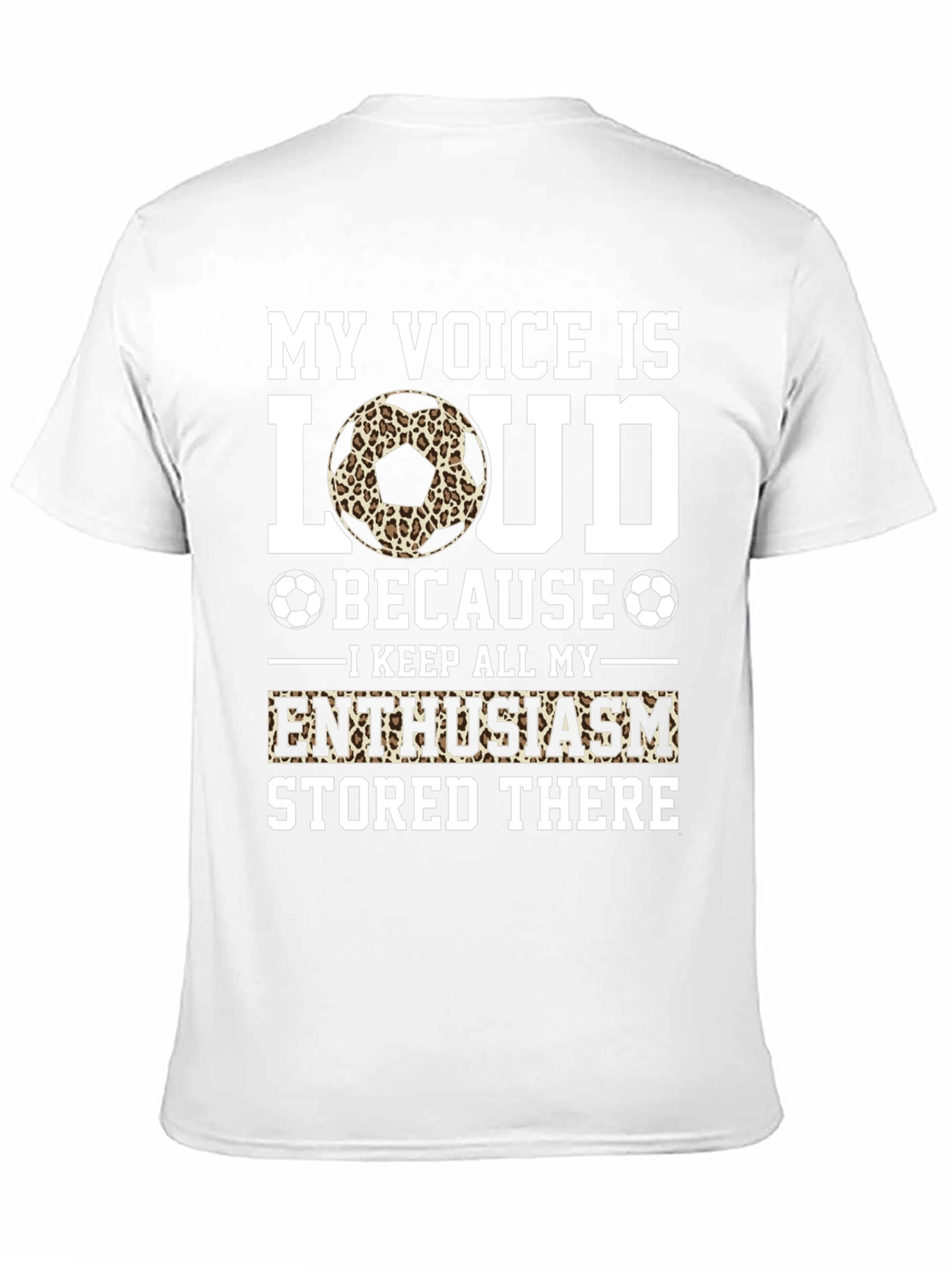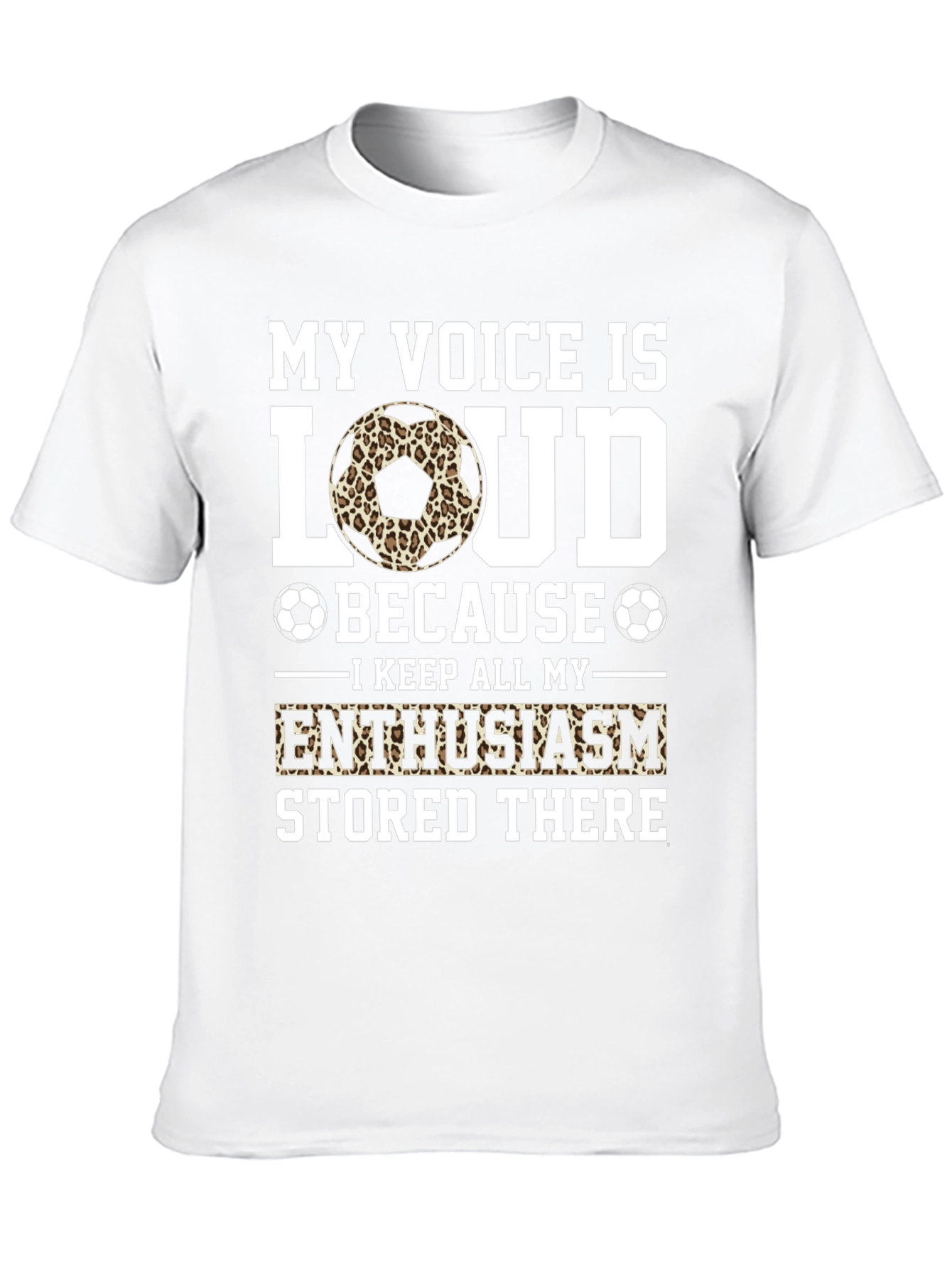 Showcase your love for soccer with this unique black t-shirt. The shirt features the phrase "My Voice Is Loud" with a soccer ball designed with a leopard print pattern. Below the main text are the words "BECAUSE I KEEP ALL MY ENTHUSIASM STORED THERE", which have a leopard print pattern. It's perfect for soccer fans and enthusiasts alike, whether you're on the field or cheering from the sidelines. This tee is sure to make a statement and spark conversations. A great gift idea for soccer moms, players, or anyone with a passion for the sport. The design adds a touch of wild style to your game-day wardrobe.