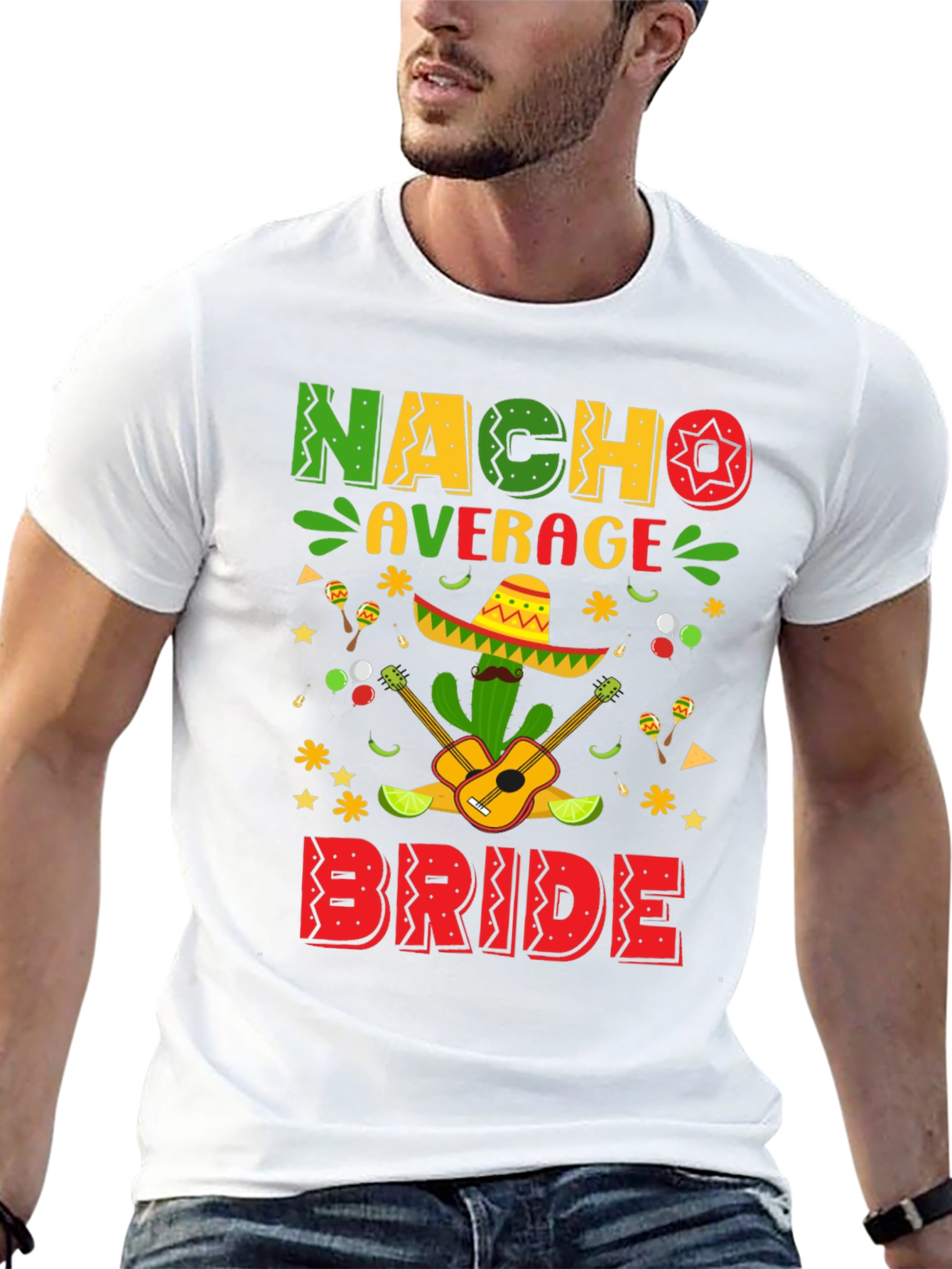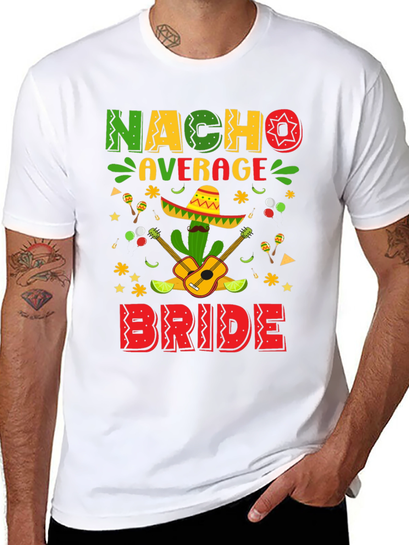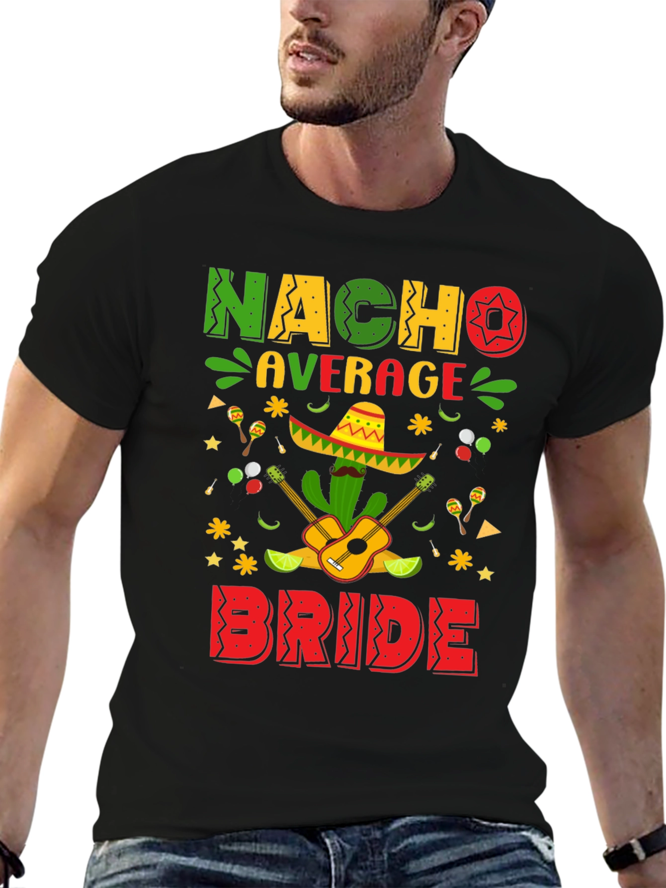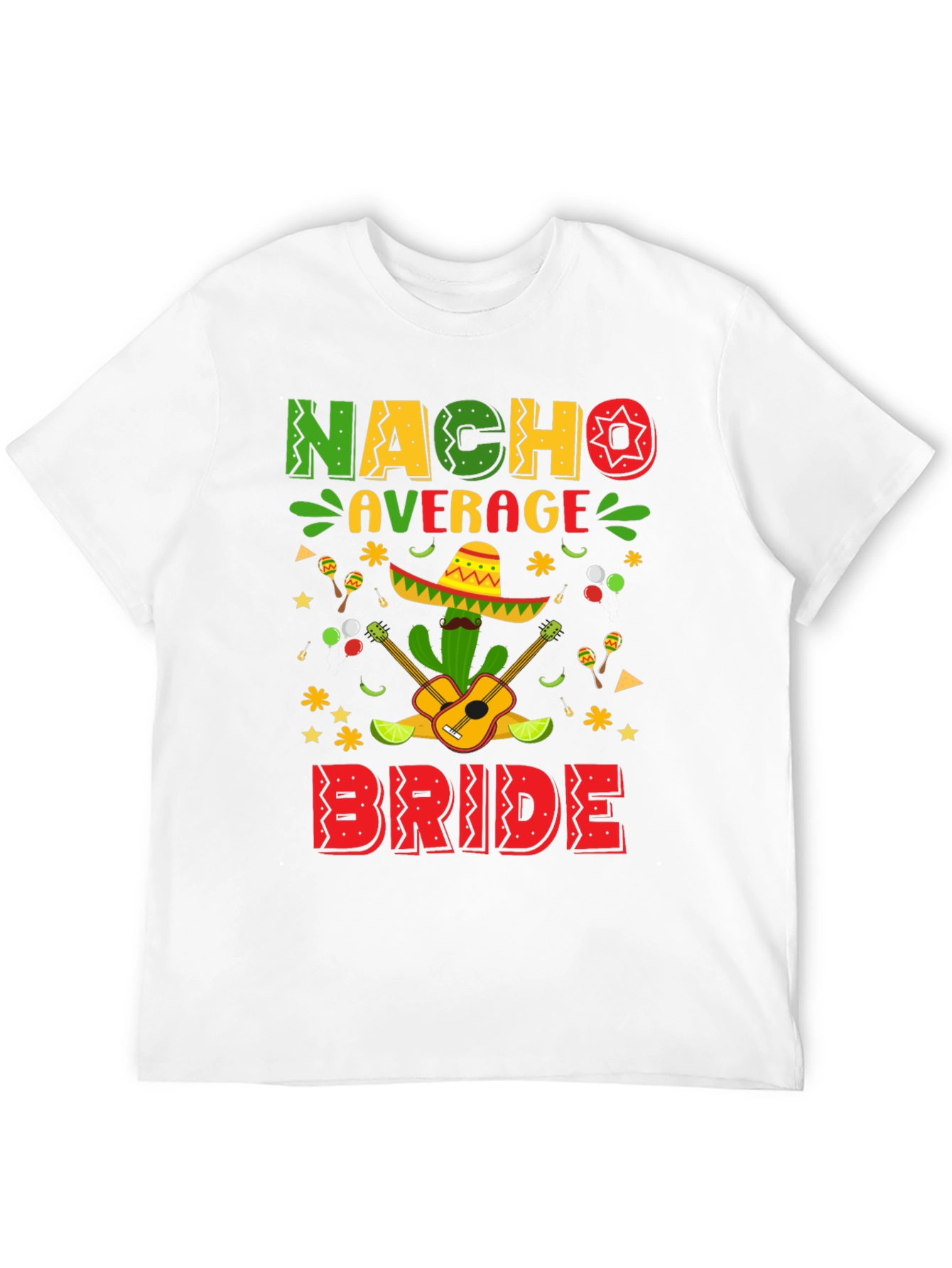 Celebrate the bride-to-be with this fun and festive "Nacho Average Bride" T-shirt! This stylish black tee features a vibrant and colorful graphic design, perfect for bachelorette parties or bridal showers with a Mexican fiesta theme. The design includes playful lettering, a cactus wearing a sombrero, guitars, maracas, limes, and festive star accents. Made from a comfortable and durable fabric, this T-shirt is ideal for a casual day out, party, or just lounging around while celebrating the upcoming wedding. It is guaranteed to bring smiles and laughter to any celebration. Get ready to fiesta in style!