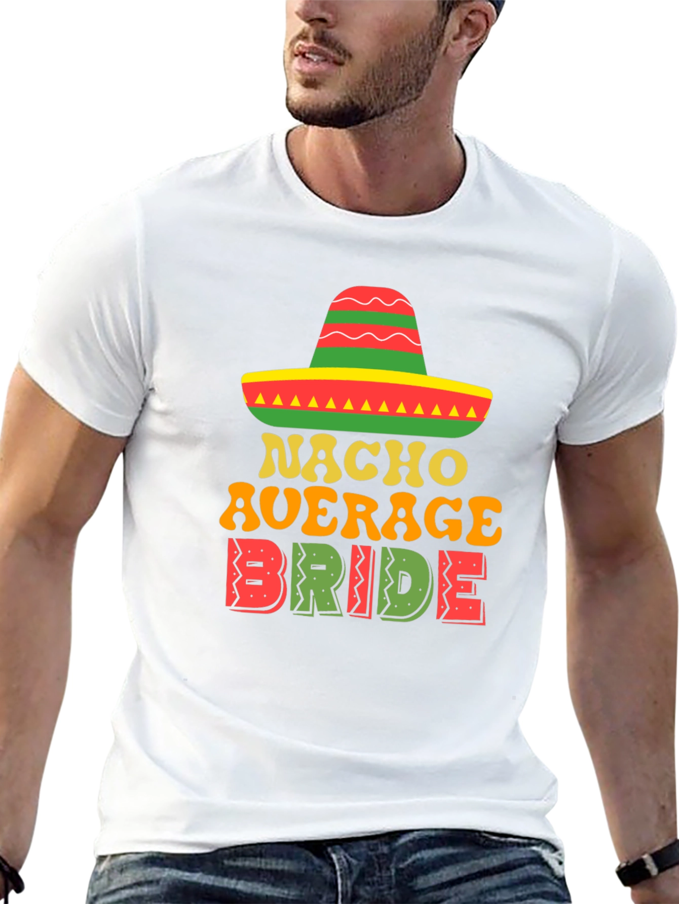 Celebrate your upcoming nuptials with this fun and festive "Nacho Average Bride" T-shirt! This eye-catching black tee features a colorful graphic including a sombrero and playful text in vibrant hues of orange, yellow, red, and green. The shirt's design is perfect for a bachelorette party, bridal shower, or any pre-wedding celebration with a fun, Mexican-inspired theme. Made from a soft, breathable fabric, this shirt will keep you comfortable while you enjoy the festivities. Show off your unique sense of humor and celebrate being a soon-to-be bride with this unforgettable T-shirt!