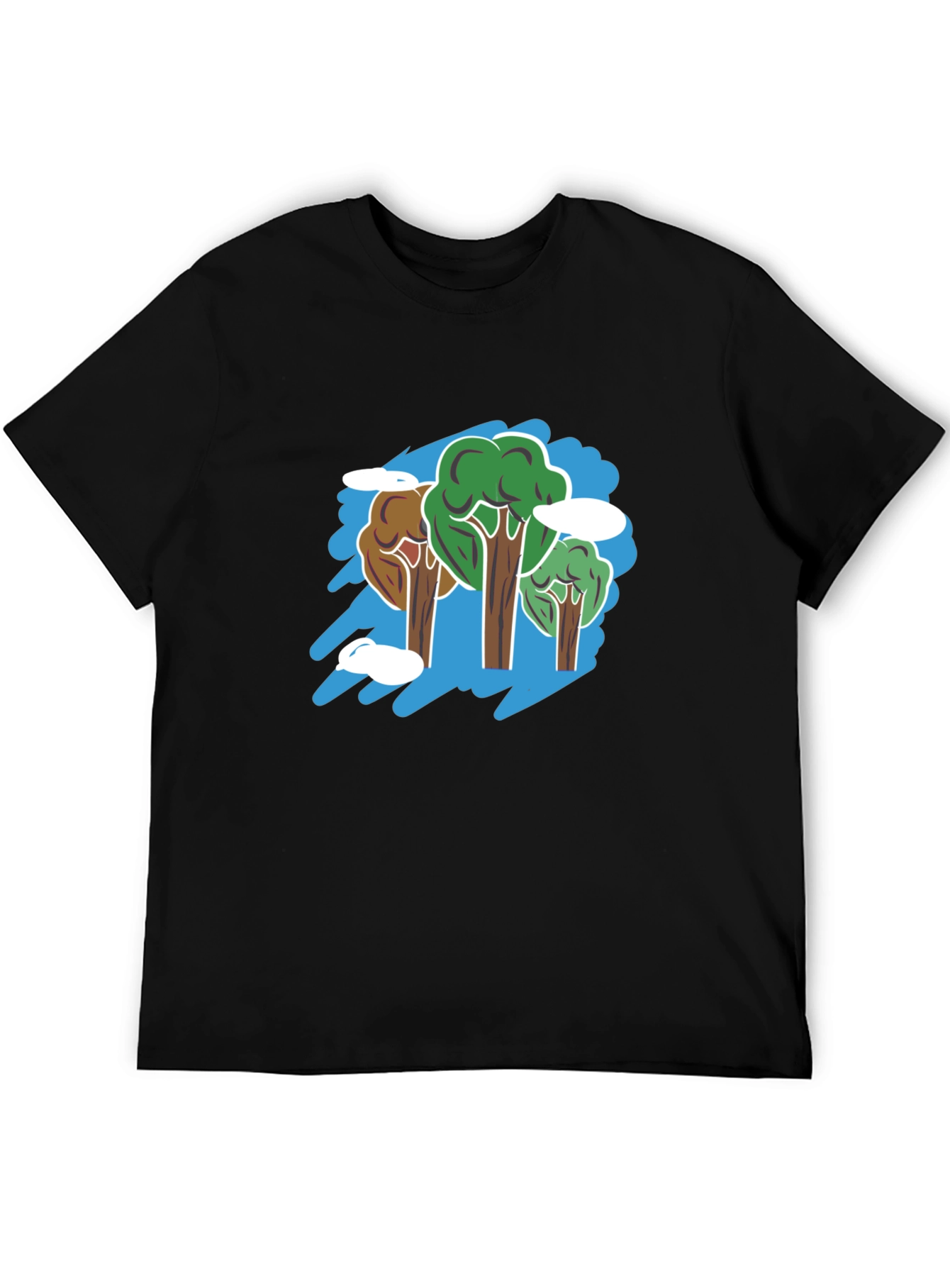 Show off your love for nature with this cool graphic tee. This black t-shirt features a cartoon-style illustration of trees and clouds, set against a blue backdrop, perfect for casual wear. Made from soft, breathable cotton blend, it provides all-day comfort. The classic crew neck and short sleeves offer a relaxed fit. Great for everyday wear, outdoor activities, or just chilling with friends. Express your unique style with this eye-catching tee.