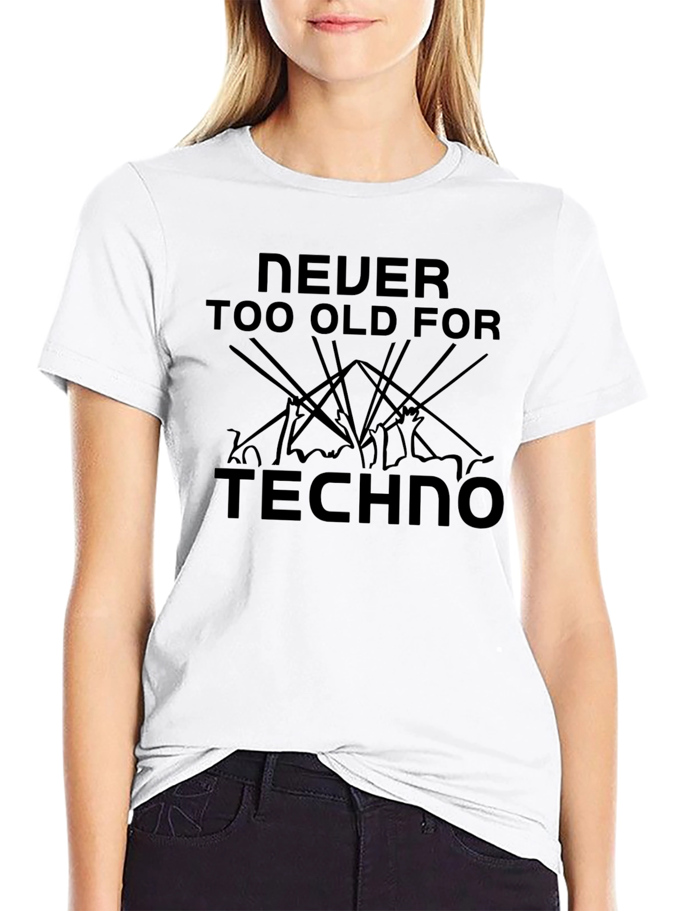 Show off your love for electronic music with this stylish black T-shirt! Featuring the phrase "Never Too Old for Techno" in bold, uppercase lettering, this shirt is perfect for ravers and music enthusiasts of all ages. The design incorporates a graphic of spotlights or lasers, creating a dynamic and energetic vibe. Made from comfortable, breathable fabric, this tee is ideal for casual wear, concerts, or music festivals. Wear it to your next techno event and let everyone know you're ready to dance!
