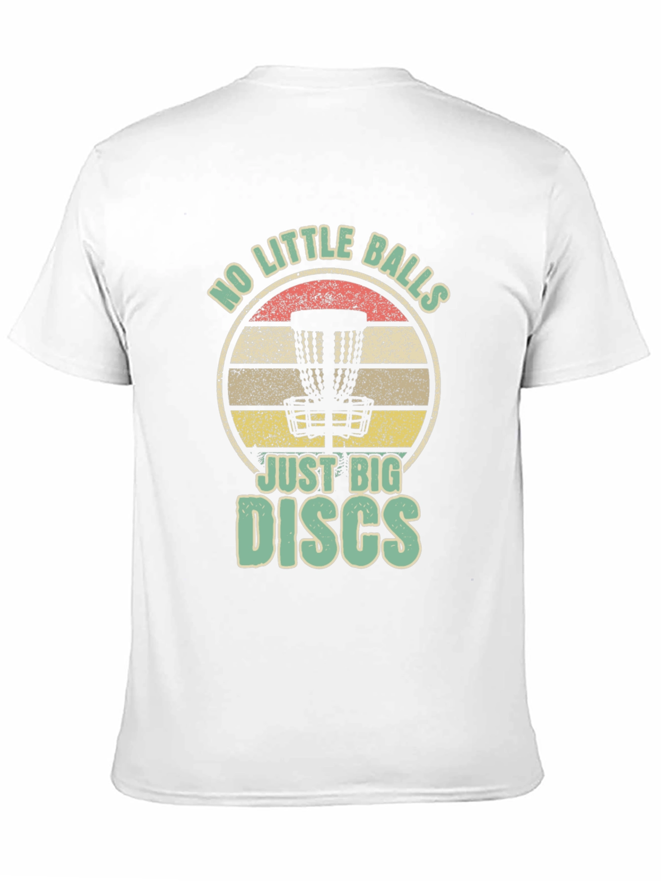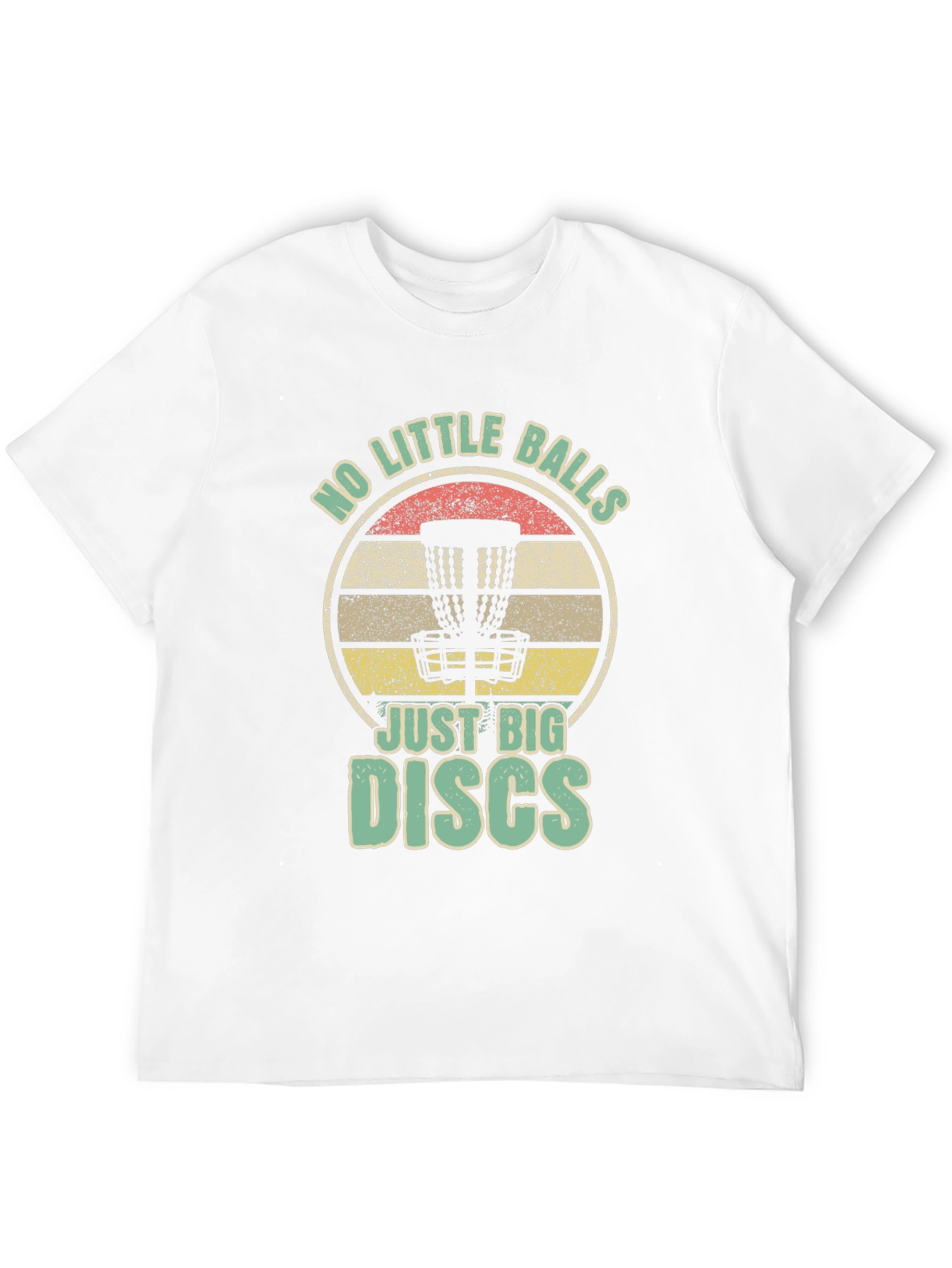Show off your love for disc golf with this unique t-shirt! The black tee features a vintage-style graphic with a disc golf basket inside a retro circle design with 'No Little Balls Just Big Discs' slogan. The faded look gives it a trendy, worn feel. Perfect for casual wear or a day out on the course, this t-shirt is a great way to express your passion for the sport. It's comfortable, stylish, and makes a statement.