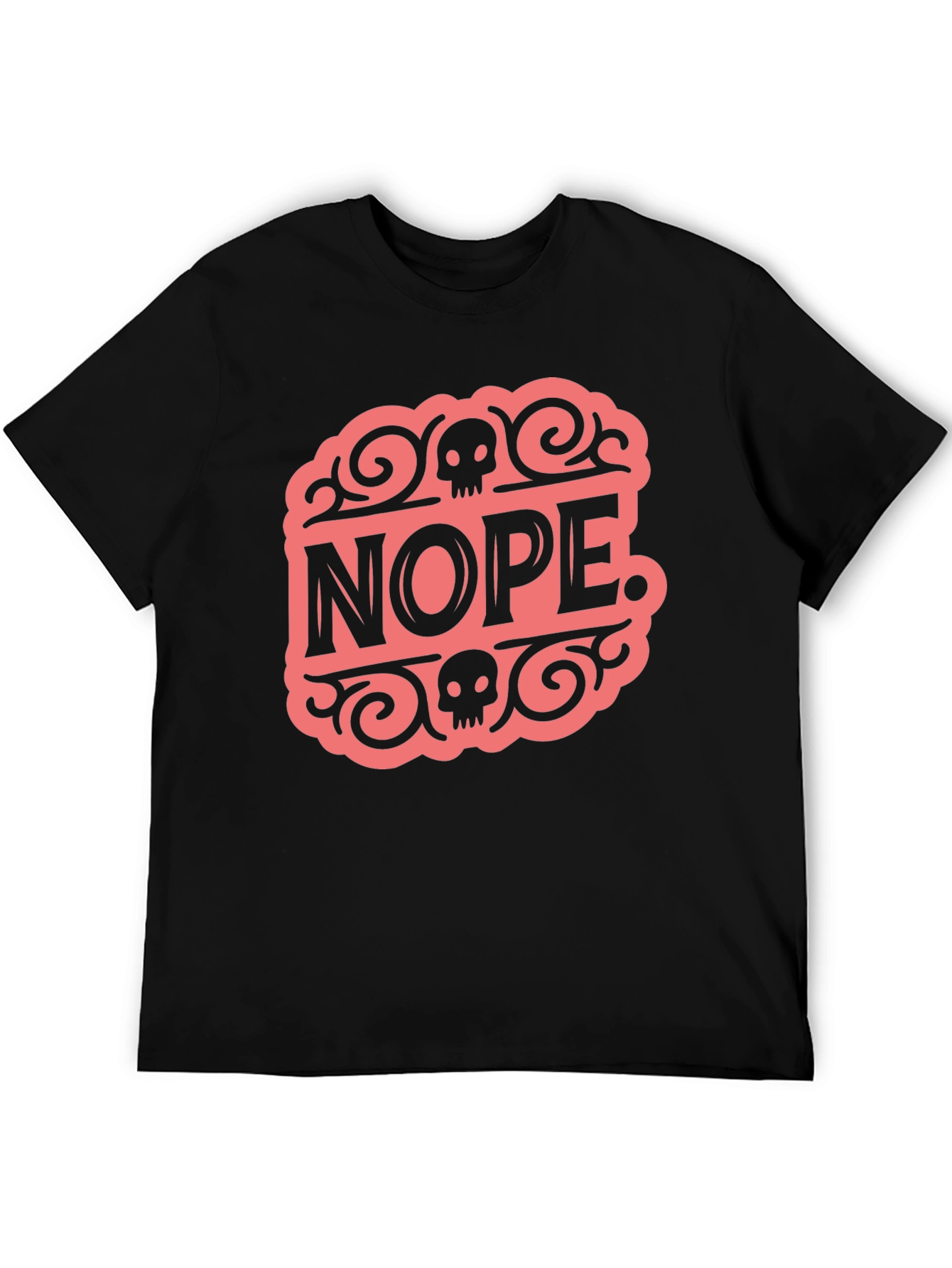 This black t-shirt features a bold and humorous design. The word "Nope." is prominently displayed in a stylized font, surrounded by skull graphics and decorative swirls. The design is printed in a light red color that contrasts sharply with the black of the shirt. Made from what appears to be a soft and breathable cotton blend, this tee offers both comfort and style. Its classic fit makes it versatile for everyday wear, while the eye-catching graphic adds a touch of edgy personality. Perfect for casual outings, lounging at home, or making a statement with your wardrobe. This tee is sure to be a conversation starter!