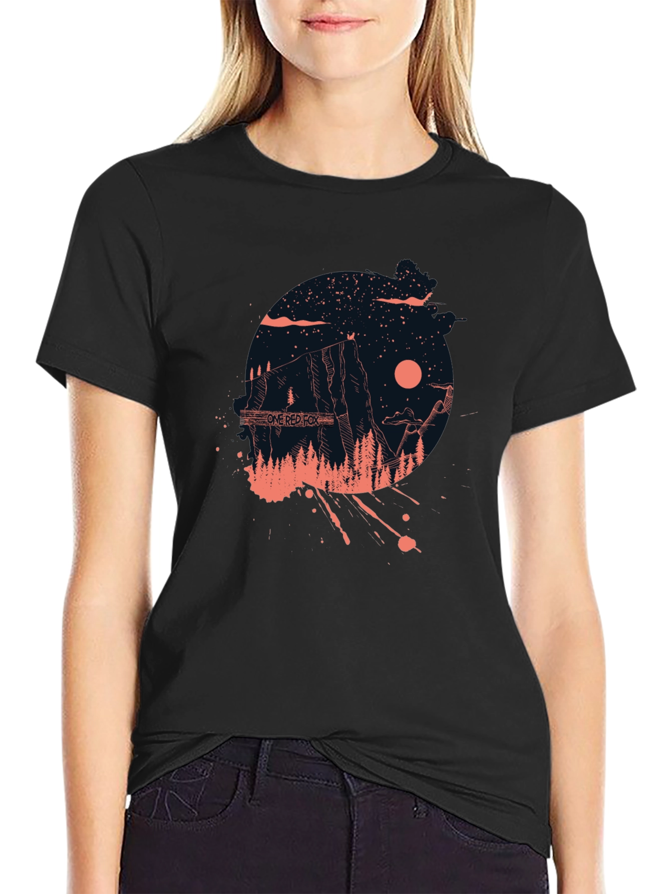 Embrace the call of the wild with this unique black graphic tee. The design features a stylized mountain landscape under a starry sky, complete with a prominent red sun or moon. "ONE RED FOX" is subtly integrated into the scene. The overall aesthetic is slightly distressed with artistic splatter effects, giving it a modern, edgy feel. Perfect for outdoor enthusiasts or anyone who appreciates unique graphic art. Wear it casually with jeans or layer it under a jacket for a cool, relaxed style. Showcase your adventurous spirit with this eye-catching tee.