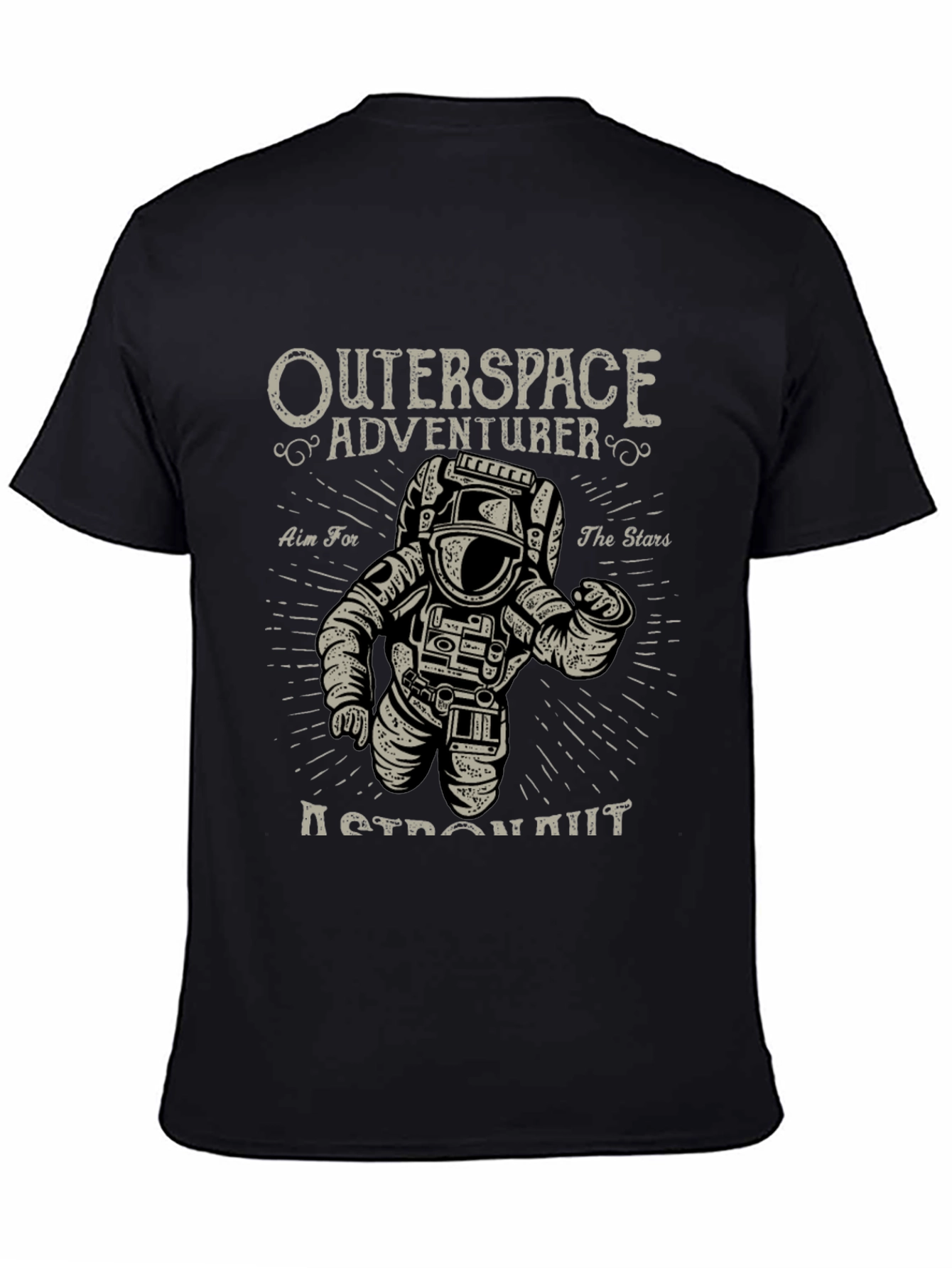 Show off your love for space exploration with this stylish black t-shirt! Featuring a vintage-inspired design, this tee showcases an astronaut graphic with the words "Outerspace Adventurer," "Aim For The Stars," and "Astronaut". The design has a retro aesthetic. Made from soft and breathable fabric, it's perfect for casual wear or layering under a jacket. Whether you're a science enthusiast or simply appreciate unique apparel, this t-shirt is sure to make a statement. Pair it with your favorite jeans or shorts for a relaxed, on-trend look.