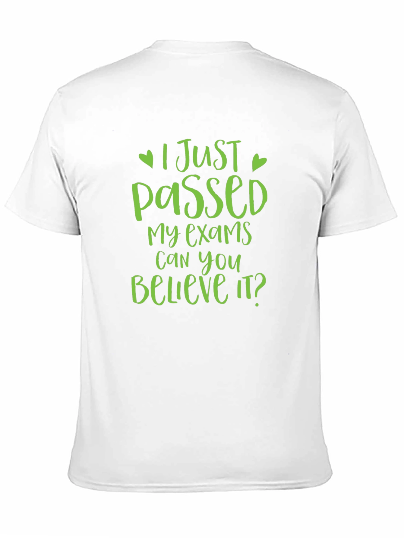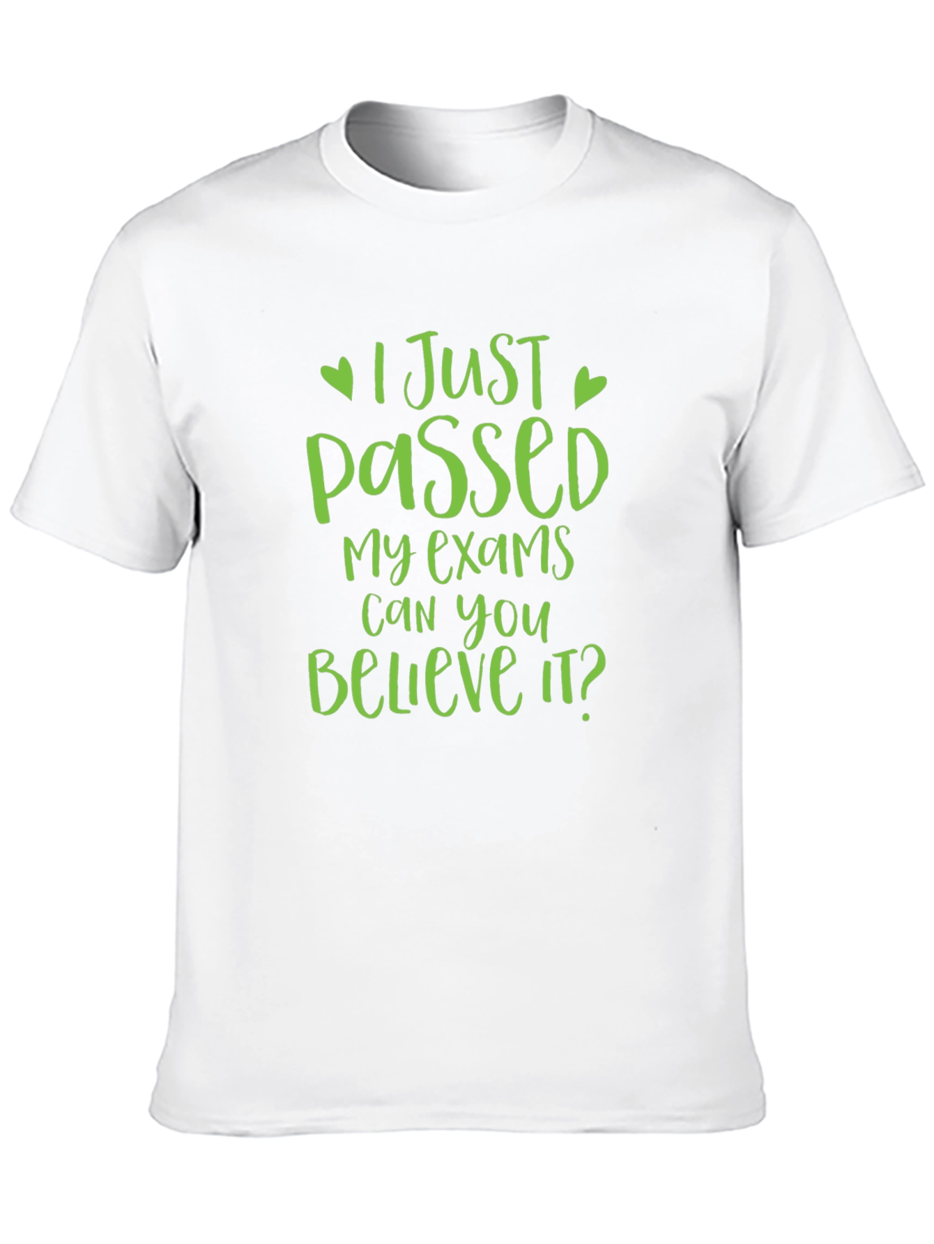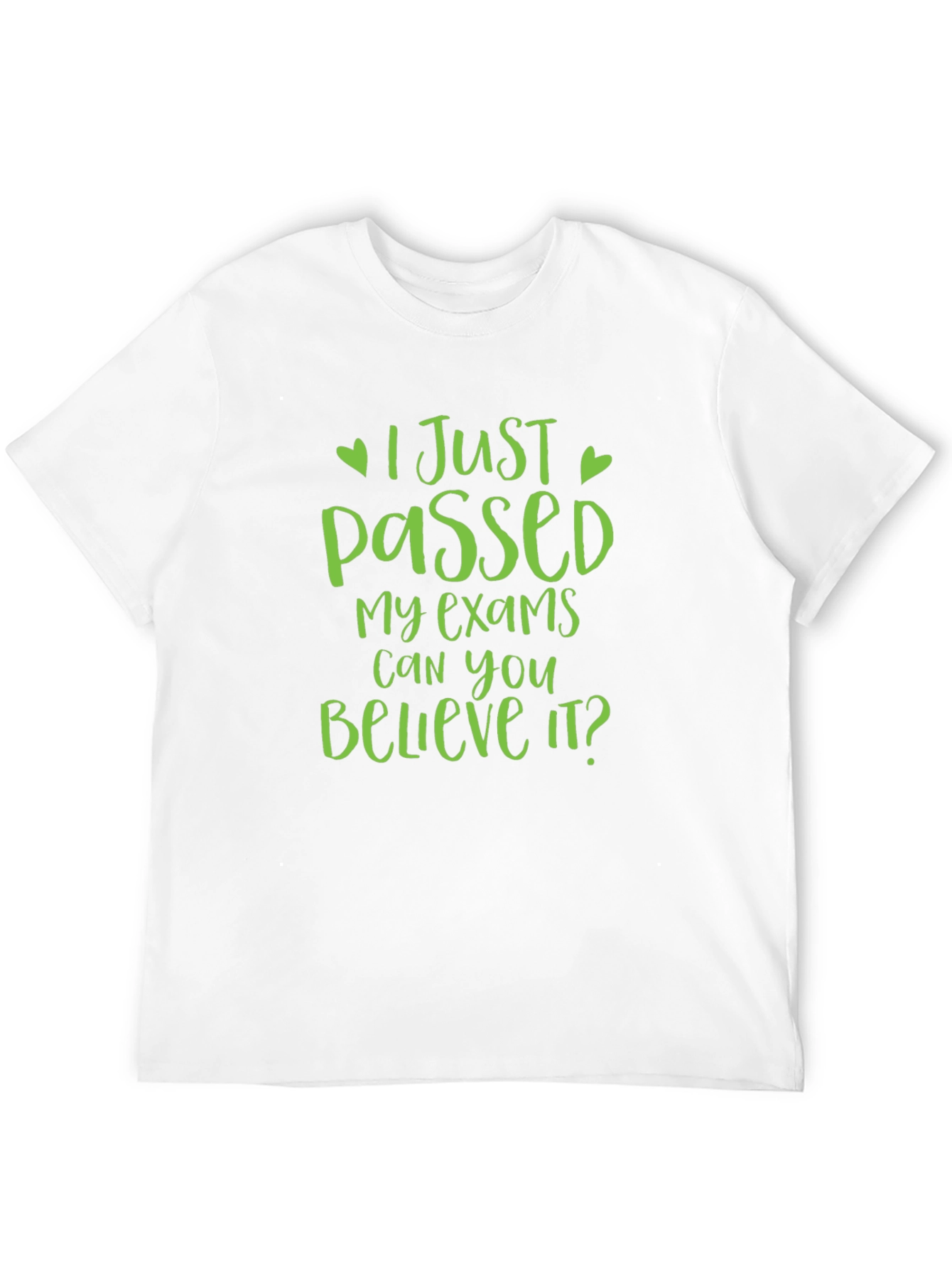 Celebrate academic success with this stylish black t-shirt. The shirt features a vibrant green graphic that reads 'I Just Passed My Exams Can You Believe It?' The playful design incorporates heart accents. Made from comfortable, breathable fabric, this shirt is perfect for casual wear and showing off your achievements. Ideal for students and graduates, it's a fun way to commemorate passing exams. A memorable gift for someone special.