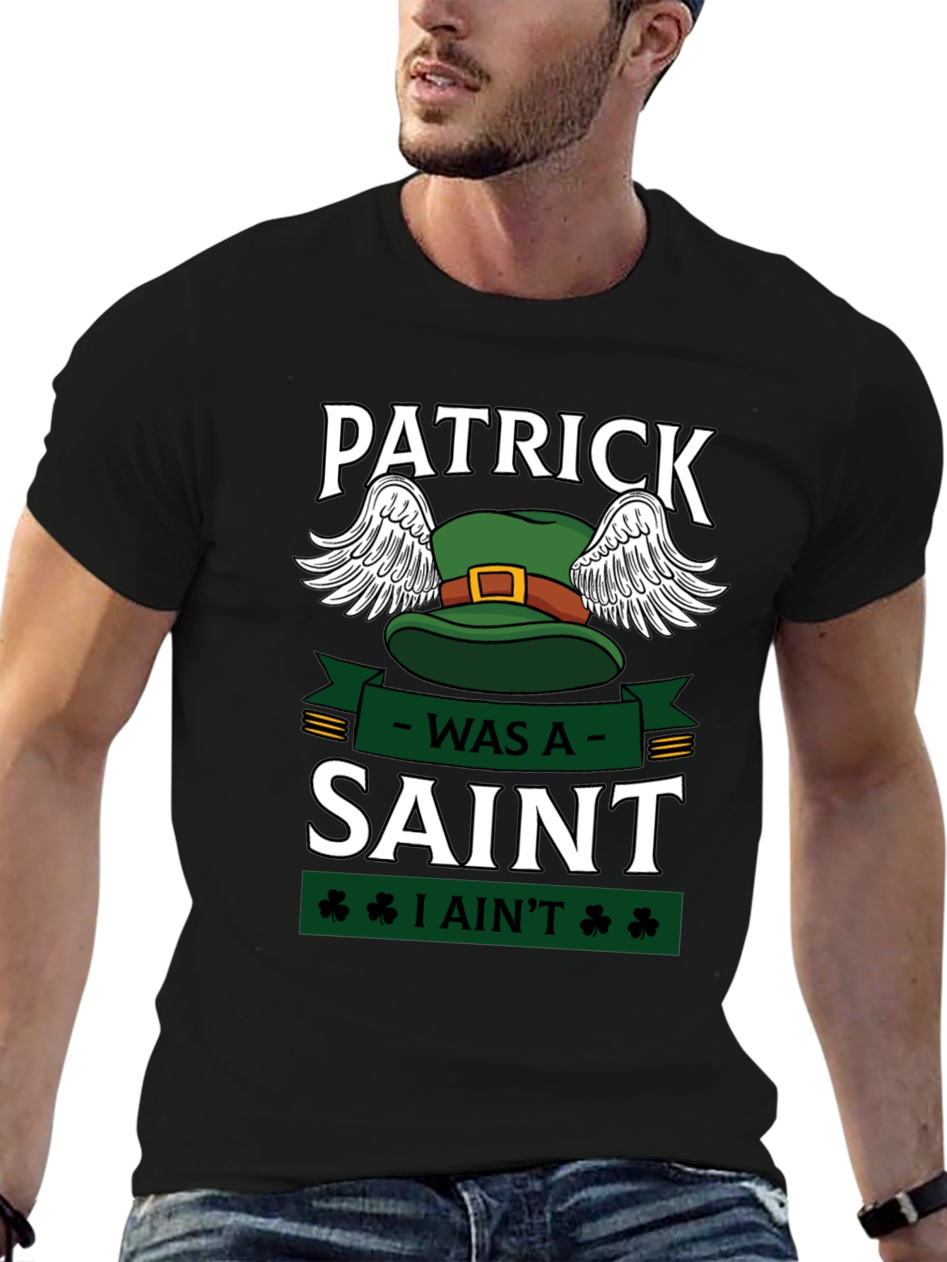 Celebrate St. Patrick's Day with this humorous black t-shirt. The design features the text "PATRICK WAS A SAINT" with a winged leprechaun hat and shamrock accents. The shirt says "I AIN'T". Perfect for a casual party or parade, this tee combines comfort and festive style. Made with soft, breathable fabric, it's ideal for all-day wear. Show off your Irish spirit with this unique and playful shirt. Great for those who love St. Patty's day.