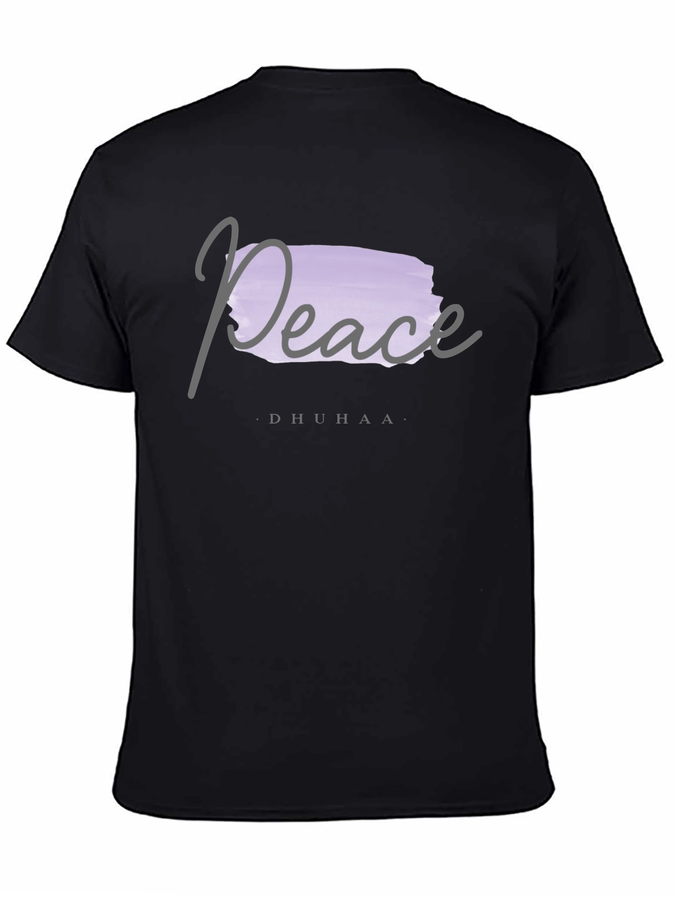 Embrace tranquility with this unique graphic tee. This black t-shirt features the word 'Peace' in elegant cursive script overlaying a soft lilac brushstroke design, complemented by the subtle 'DHUHAA' text. Made from a comfortable-looking fabric, this shirt offers both style and ease. Perfect for casual outings, lounging at home, or expressing your peaceful mindset. Pair it with jeans or shorts for a relaxed yet fashionable look. Add a touch of serenity to your wardrobe with this eye-catching t-shirt!