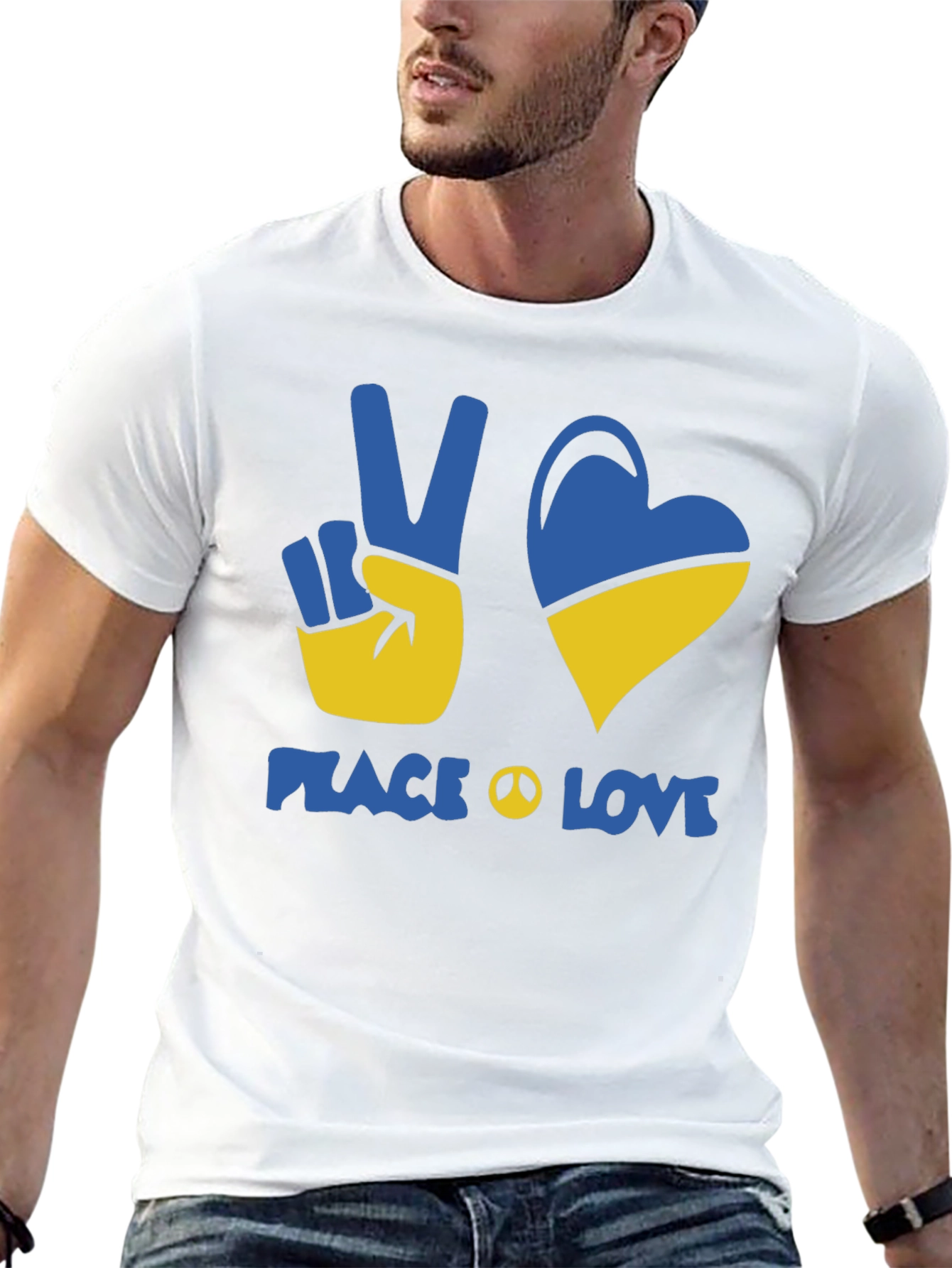 Show your support for Ukraine with this stylish black t-shirt. Featuring a vibrant design incorporating the peace symbol, a love heart, and the colors of the Ukrainian flag (blue and yellow), this shirt makes a statement. The comfortable fabric and classic cut make it perfect for everyday wear or to show your solidarity at rallies and events. This unique t-shirt is a meaningful way to express your support and promote peace.