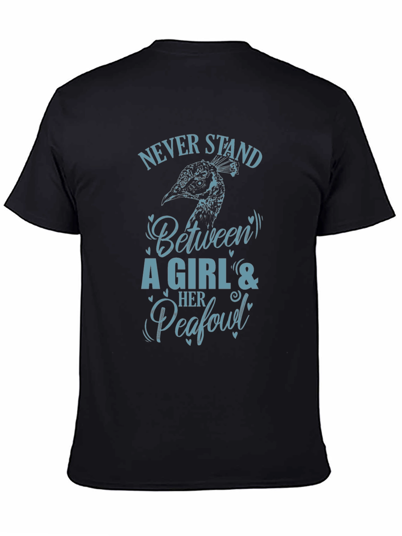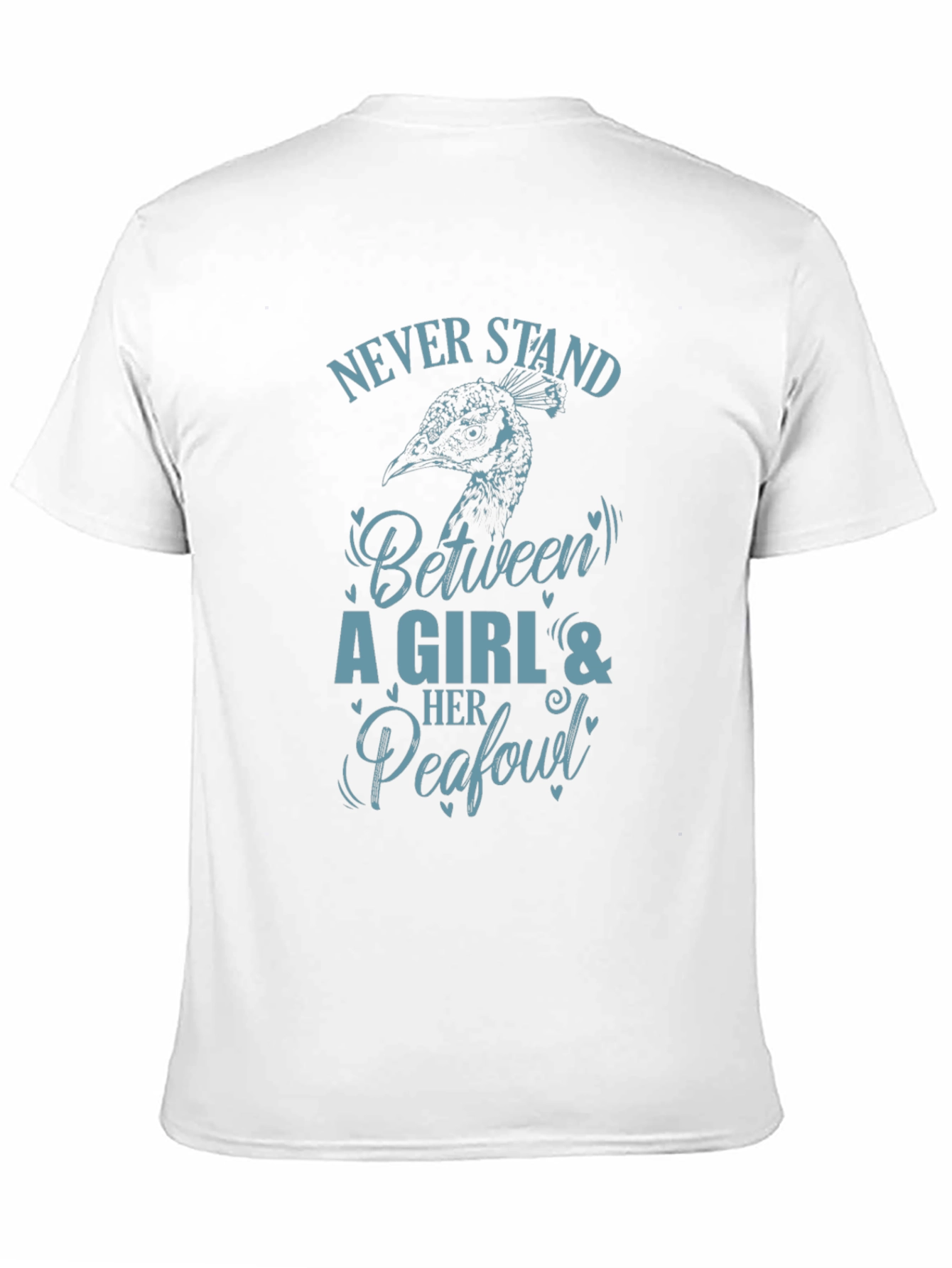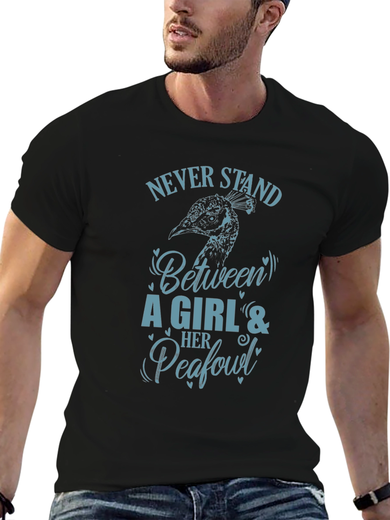 Show off your love for peafowl with this unique unisex t-shirt. The shirt features the phrase "Never Stand Between A Girl & Her Peafowl", surrounded by stylish embellishments. The design is printed in a complementary blue hue, making it a statement piece. The classic crew neck and short sleeves offer a comfortable fit for both men and women. Made from soft, breathable fabric, this t-shirt is perfect for casual wear or as a gift for any peafowl enthusiast. Wear it to the zoo, bird-watching events, or simply as a fun everyday outfit. Get yours now and show your peafowl pride!
