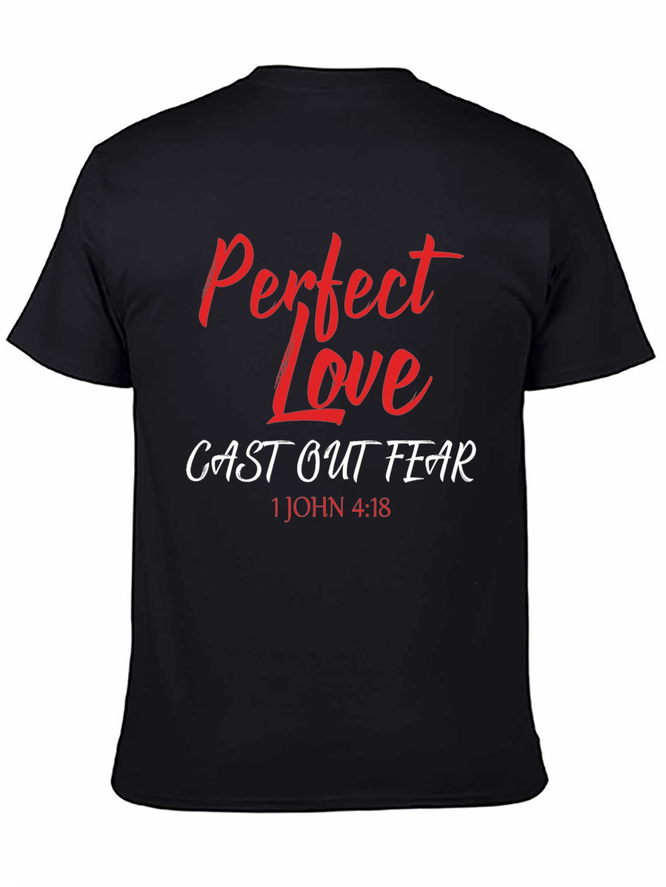 Embrace faith and fashion with this striking black t-shirt featuring the powerful message "Perfect Love CAST OUT FEAR" and the reference "1 JOHN 4:18." The bold red "Perfect Love" stands out against the crisp white text below, creating an eye-catching design. Crafted from a soft and comfortable fabric, this tee is perfect for everyday wear or special occasions. Show your devotion and inspire others with this meaningful graphic tee. Wear it to church, social gatherings, or simply while running errands to spread positivity and faith. This shirt makes a thoughtful gift for loved ones who cherish their beliefs.