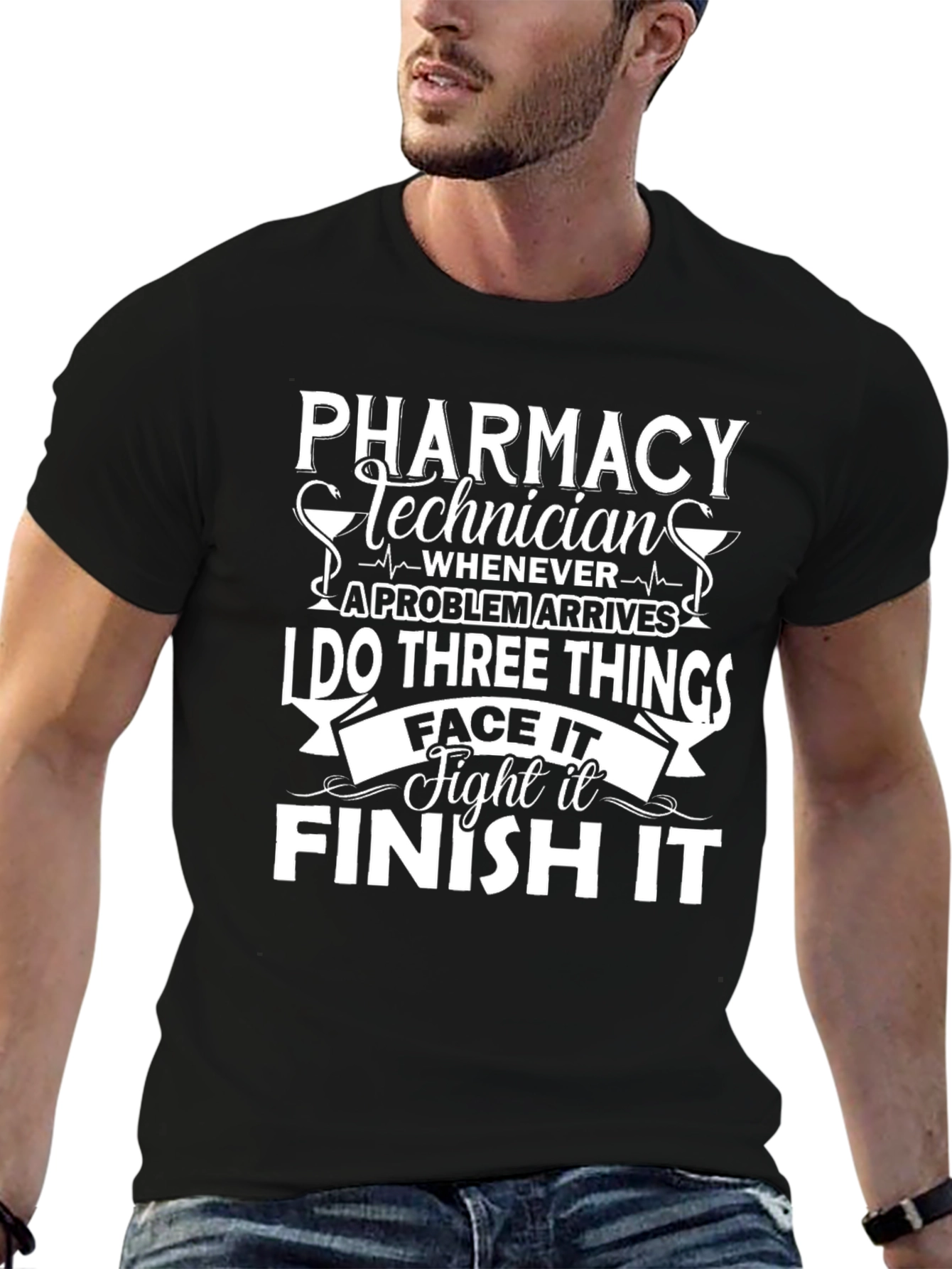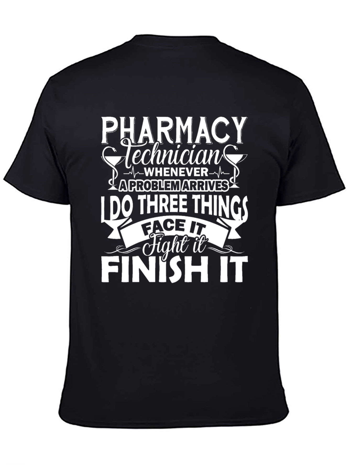 This black t-shirt proudly displays a bold white graphic design that celebrates pharmacy technicians. The design features the words "Pharmacy Technician" in an elegant font, flanked by caduceus symbols. The shirt reads "Whenever a problem arrives I do three things FACE IT, FIGHT IT, FINISH IT" in a clear, bold typeface. Made from what appears to be a soft and comfortable cotton blend, this shirt is perfect for casual wear or as a statement piece for pharmacy professionals. Show off your dedication and resilience in the field with this unique and eye-catching tee. It's a great gift for yourself or a fellow pharmacy tech!