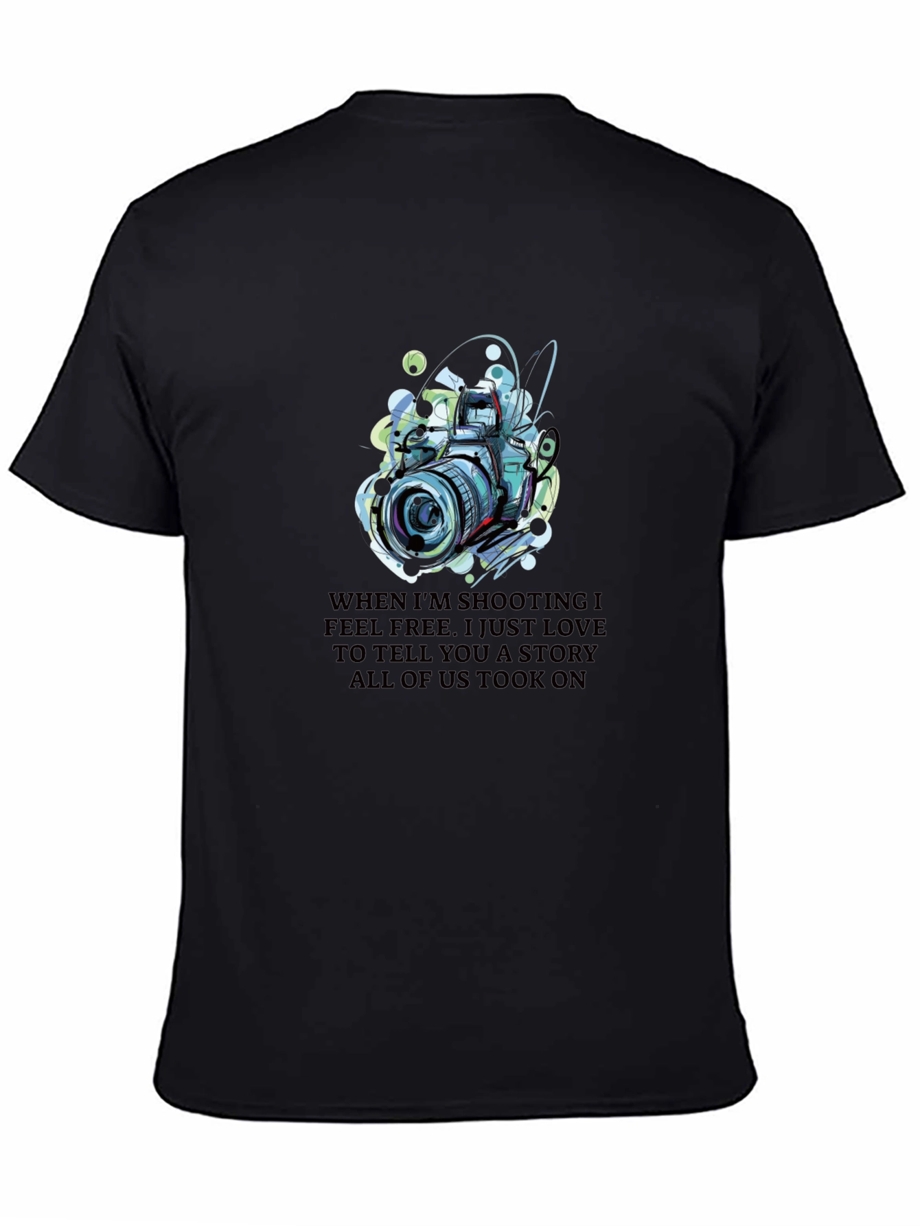 Capture the essence of photography with this unique graphic tee! Featuring a vibrant, artistic rendering of a camera, this black t-shirt is perfect for photographers and art enthusiasts alike. The eye-catching design pops against the dark fabric, making a bold statement. Made from a soft, comfortable fabric, it's ideal for everyday wear, photo shoots, or casual outings. The shirt also features the words "WHEN I'M SHOOTING I FEEL FREE. I JUST LOVE TO TELL YOU A STORY ALL OF US TOOK ON". Show off your passion for photography and artistic flair with this standout piece. A great conversation starter and a must-have for any camera lover's wardrobe!