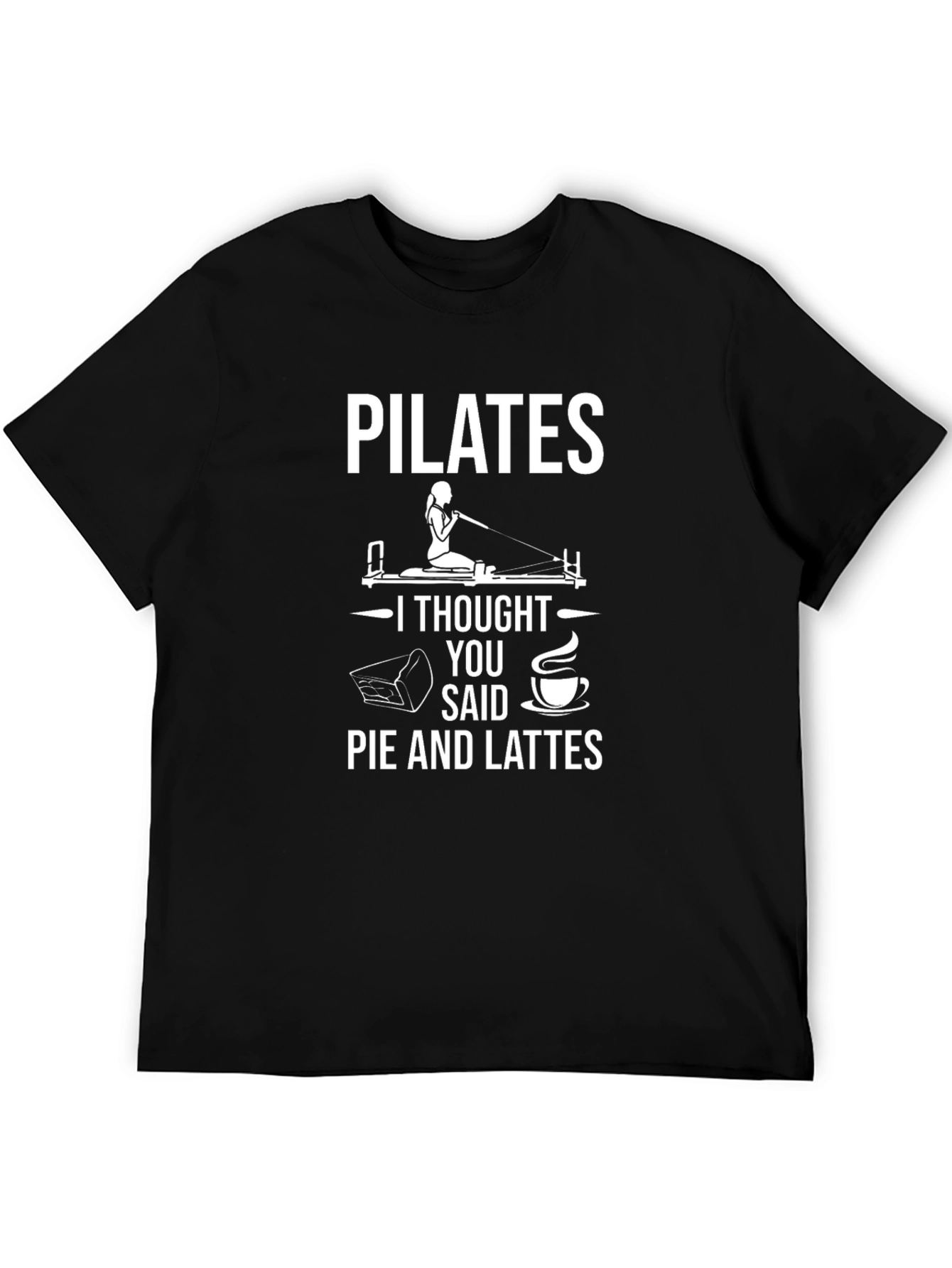 This black t-shirt features a humorous design for Pilates enthusiasts. The shirt boldly states "PILATES" at the top, followed by a graphic of a woman on a Pilates reformer machine. Below, it reads, "I THOUGHT YOU SAID PIE AND LATTES", accompanied by an illustration of a slice of pie and a cup of coffee. This playful design is perfect for those who enjoy Pilates but also have a sweet tooth and love their lattes. Made from comfortable material, it is great for workouts or casual wear. Makes a fun gift for Pilates lovers with a sense of humor.