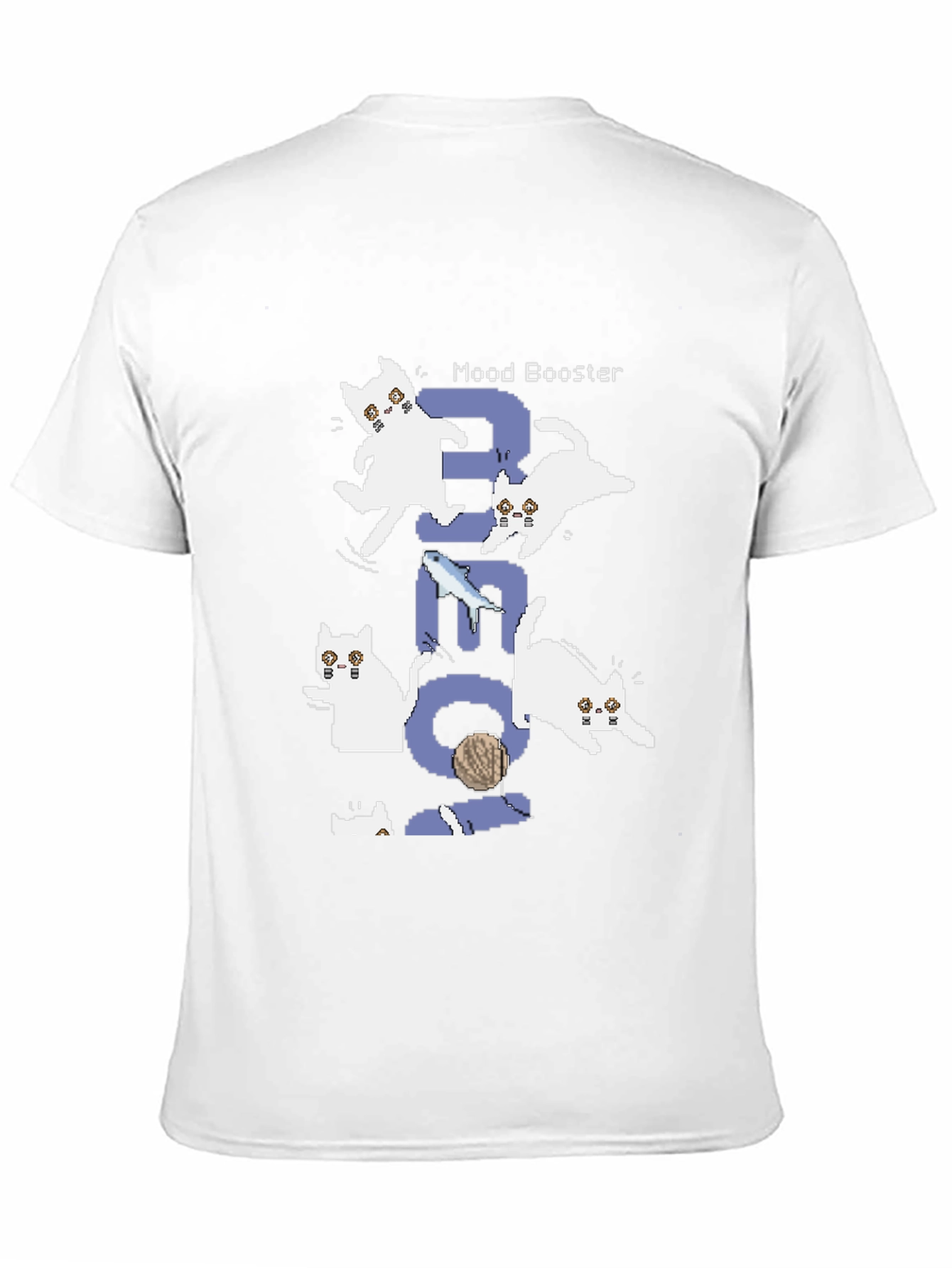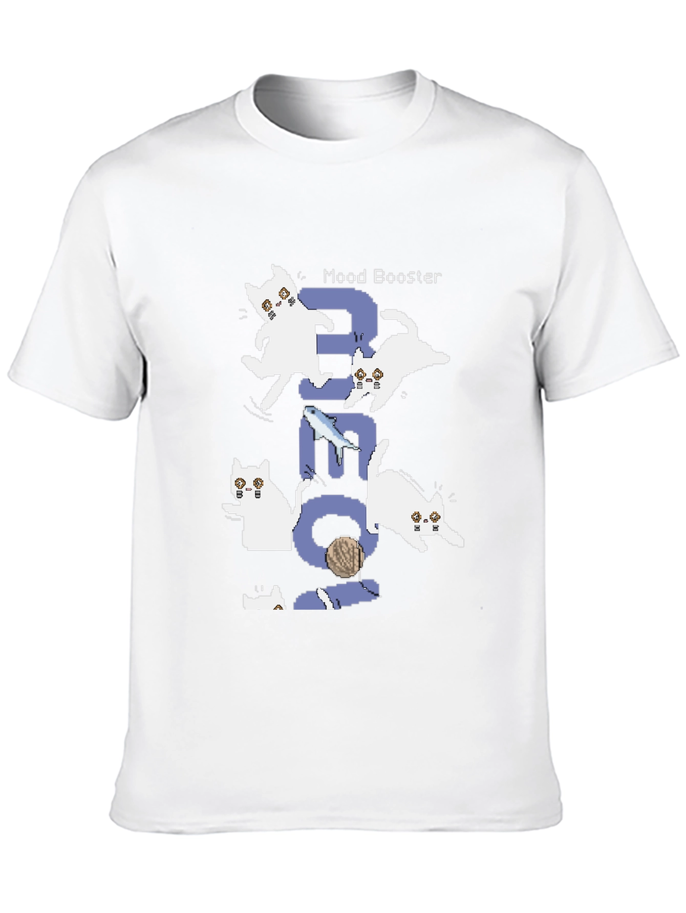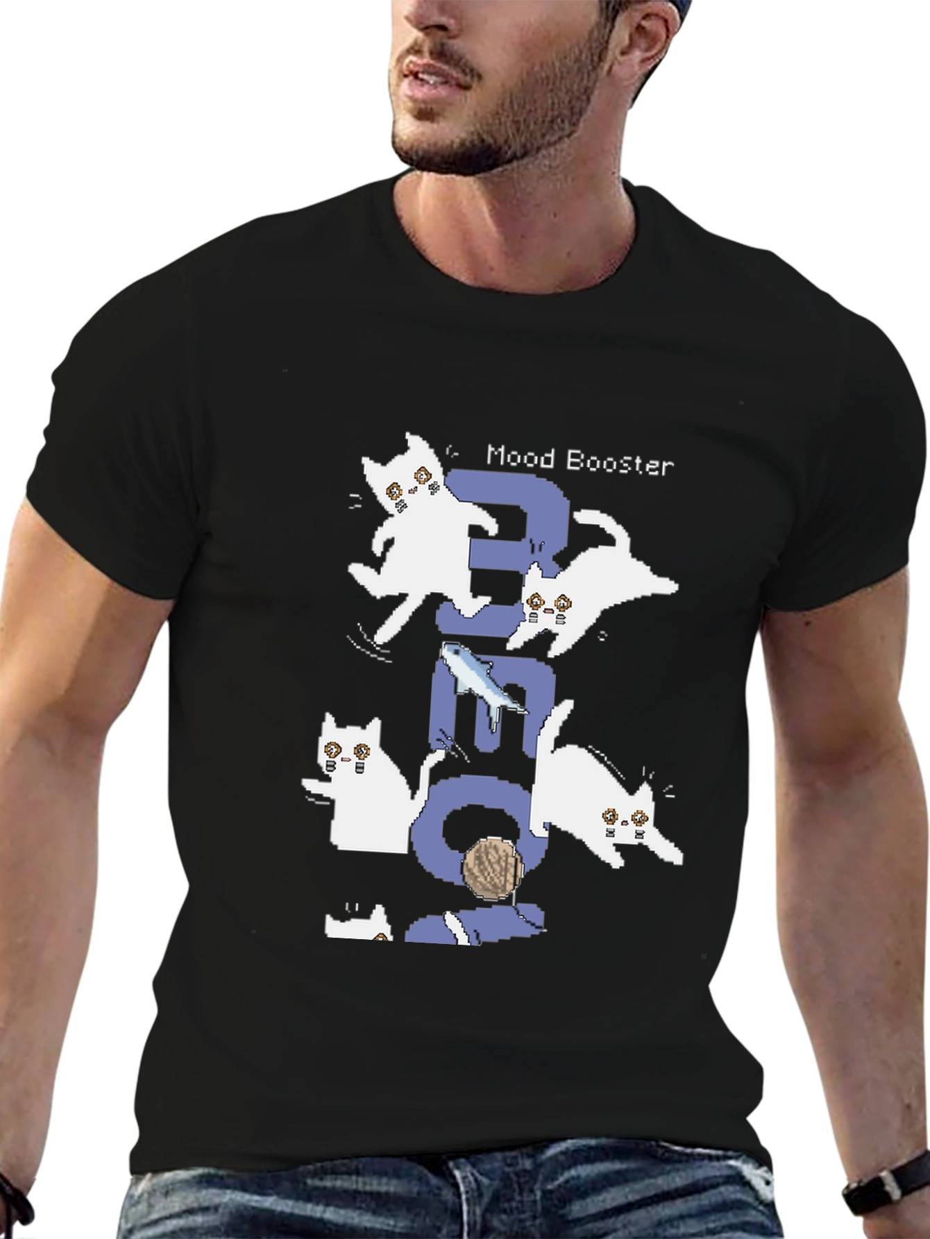This unique black t-shirt features a playful, pixelated design that's sure to turn heads and spark conversations. The graphic showcases white cats with a retro 8-bit aesthetic. Above the cats, "Mood Booster" is printed in a complementary pixel font. The design blends nostalgia with modern fashion, making it a standout piece for any casual wardrobe. Made from soft, breathable fabric, this tee offers both comfort and style. Whether you're a gamer, cat lover, or simply appreciate eye-catching designs, this t-shirt is the perfect way to express your personality. It���s ideal for everyday wear, social events, or as a fun gift for someone special.
