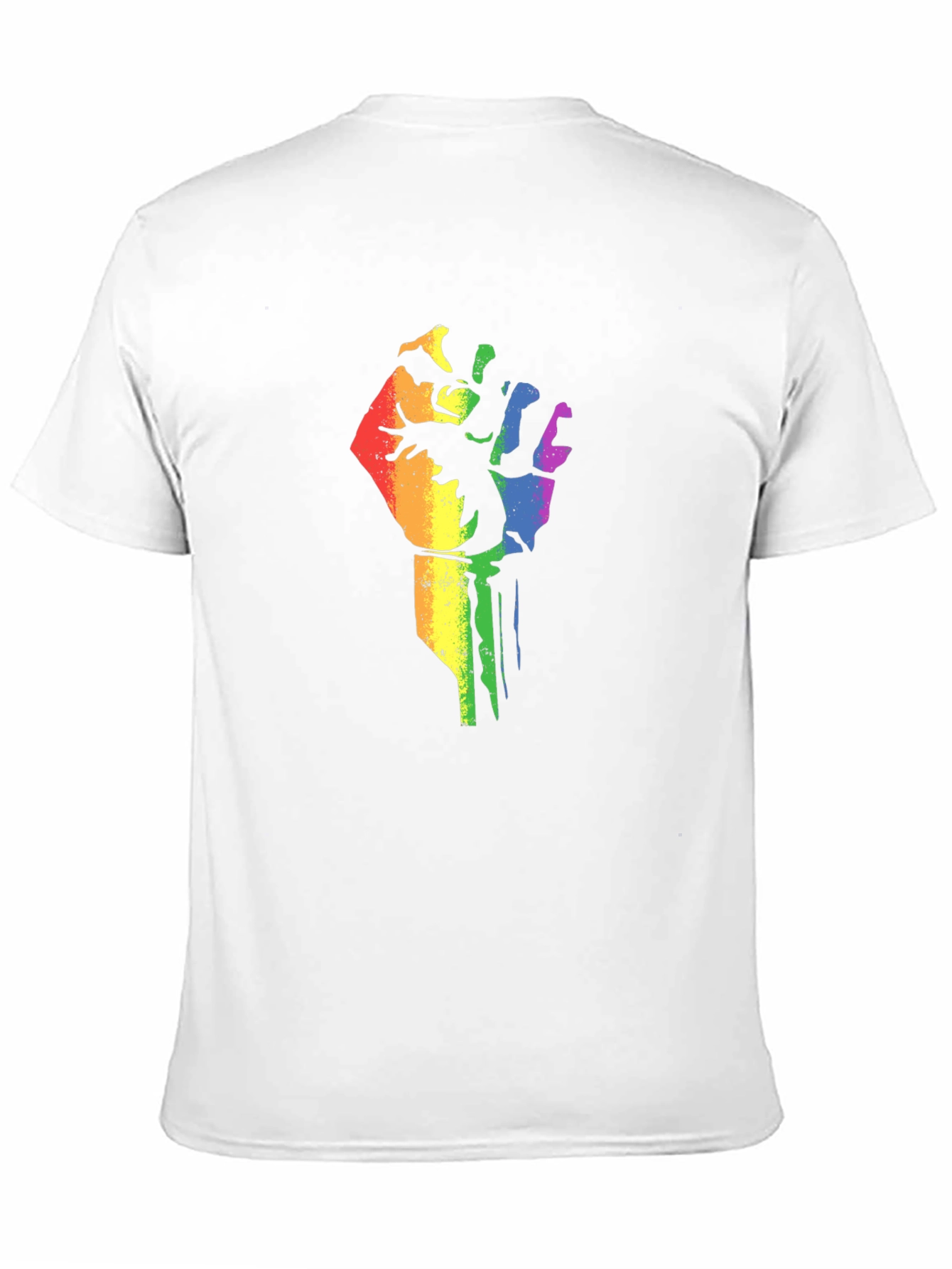 Show your support with this bold black t-shirt featuring a vibrant, rainbow-colored raised fist graphic. Made from a comfortable cotton blend, this tee is perfect for casual wear, pride events, or making a statement. The vivid fist design symbolizes solidarity and empowerment. Its classic fit and soft fabric ensure all-day comfort, while the striking graphic adds a touch of individuality. This tee is more than just clothing, it's a conversation starter, so make a statement with style and comfort. Perfect for everyday wear, rallies, and showing your true colors. Get yours today and wear your pride!