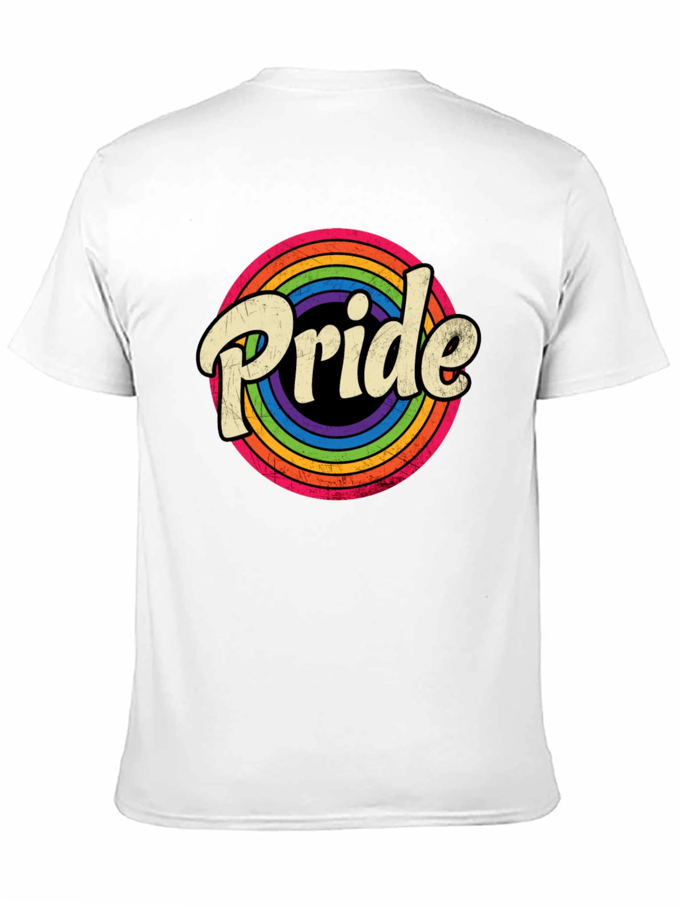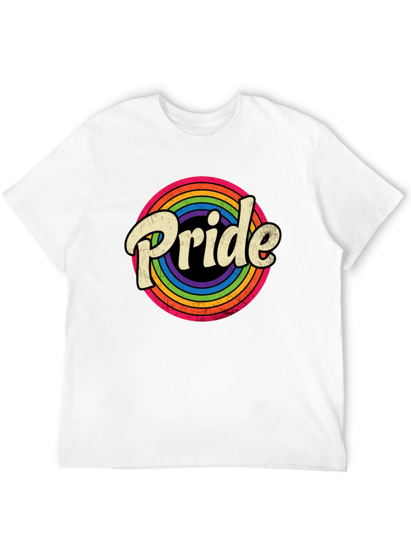 Show your pride with this vintage-style graphic t-shirt. This black tee features a vibrant rainbow circle design with the word "Pride" in a distressed, off-white font. The retro look gives it a cool, worn-in feel. Made from what appears to be a soft and breathable fabric, this unisex shirt is perfect for everyday wear, pride events, or casual outings. Express yourself in style and make a statement with this eye-catching and comfortable pride t-shirt. A must-have for those who celebrate love, equality, and inclusivity!