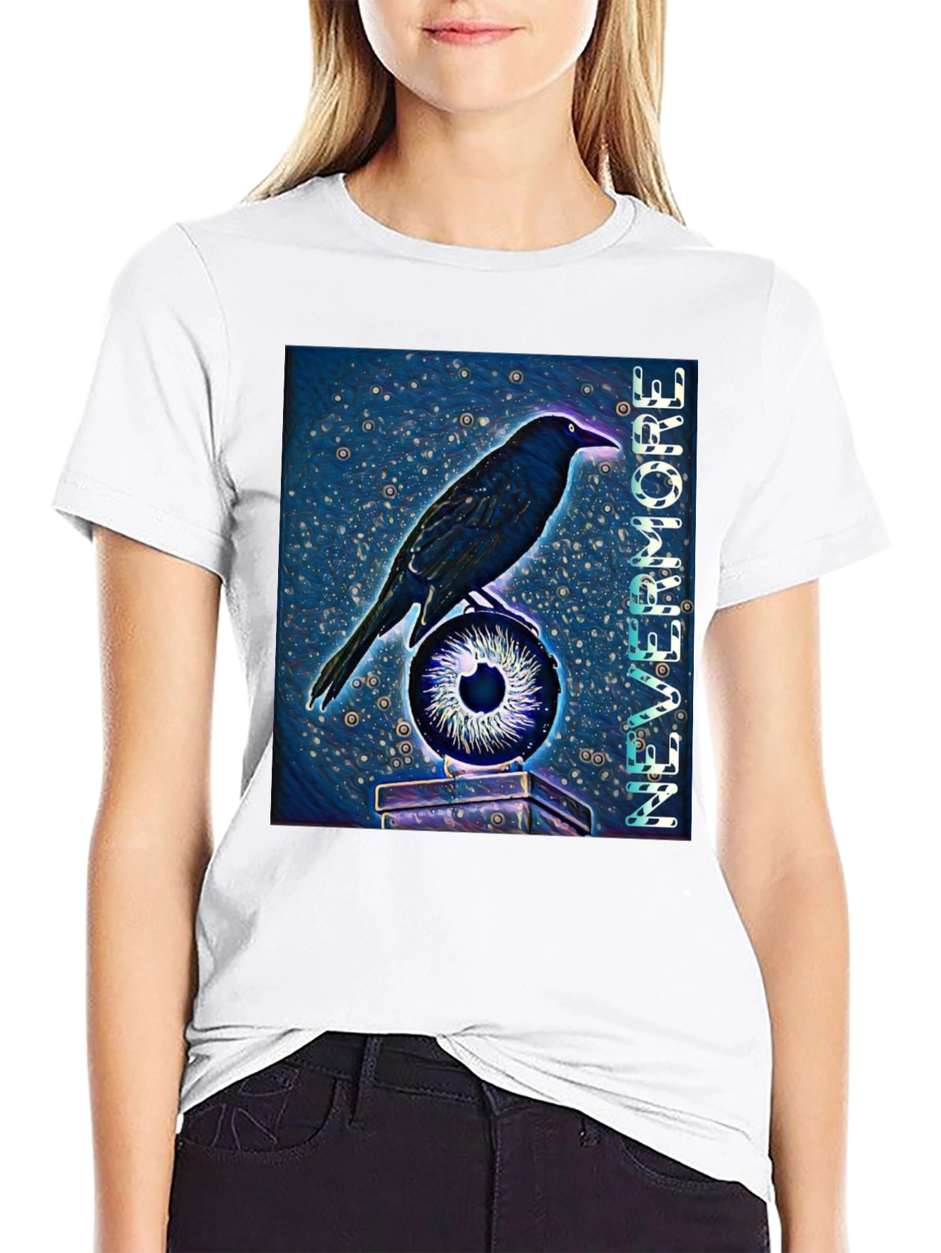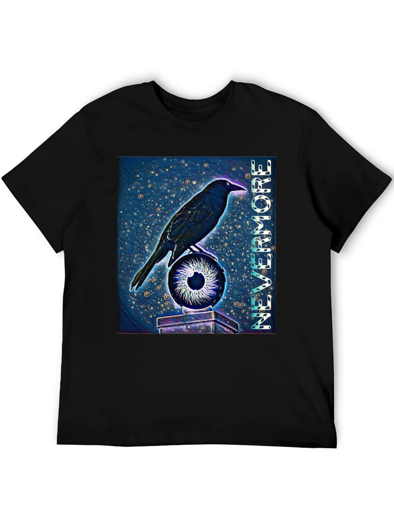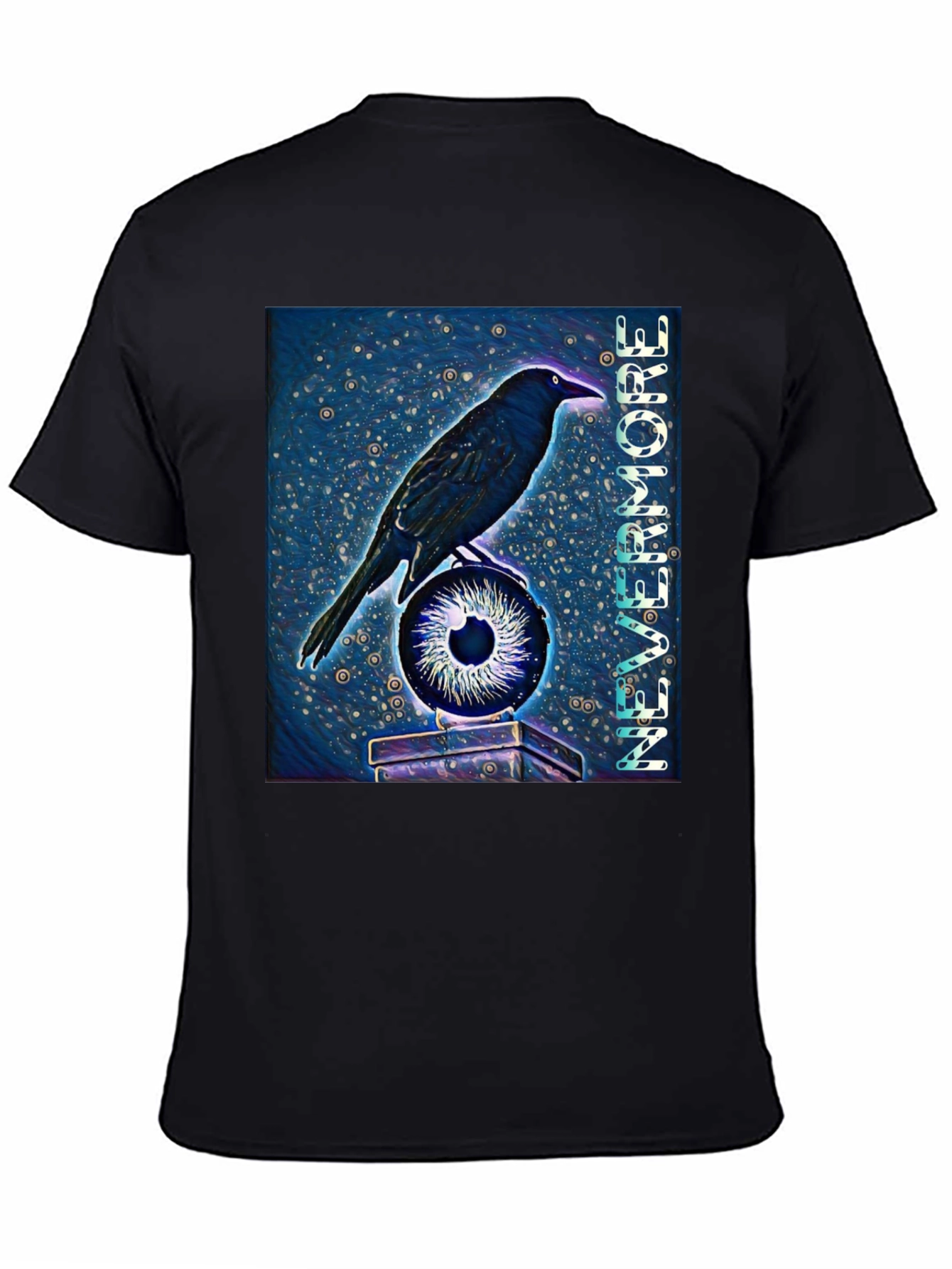 This unique black t-shirt features a striking graphic print. A majestic raven sits perched atop a captivating eye design, set against a starry, ethereal backdrop. The word "NEVERMORE" is emblazoned vertically beside the bird, lending a touch of gothic mystique. Perfect for those who appreciate bold designs and literary references. Made from a soft, comfortable material, this tee is ideal for casual wear, concerts, or making a statement. Show off your unique style with this eye-catching piece. This shirt can be worn for parties, hanging out, or any setting where you want to show off your style. A must-have for fans of Edgar Allan Poe!