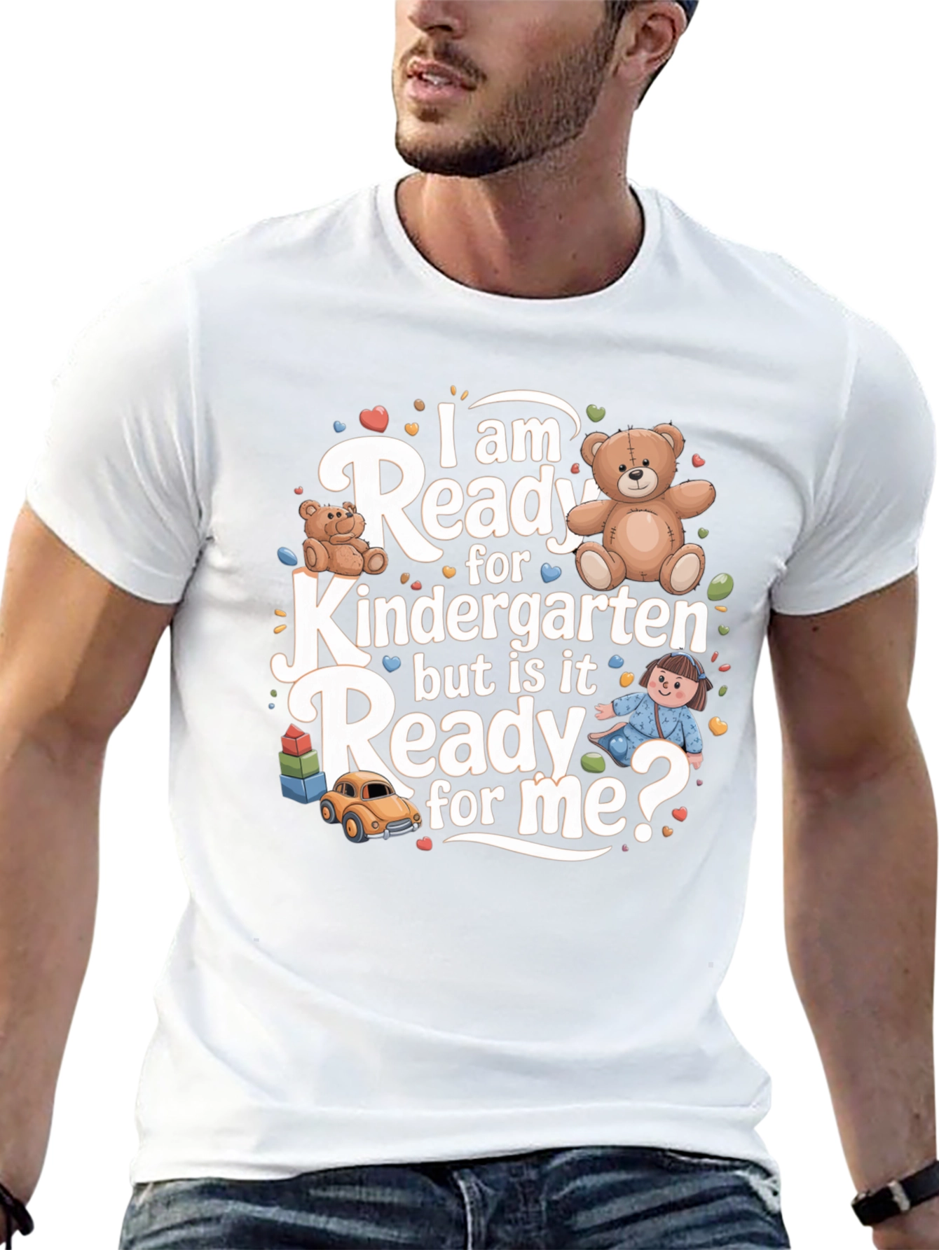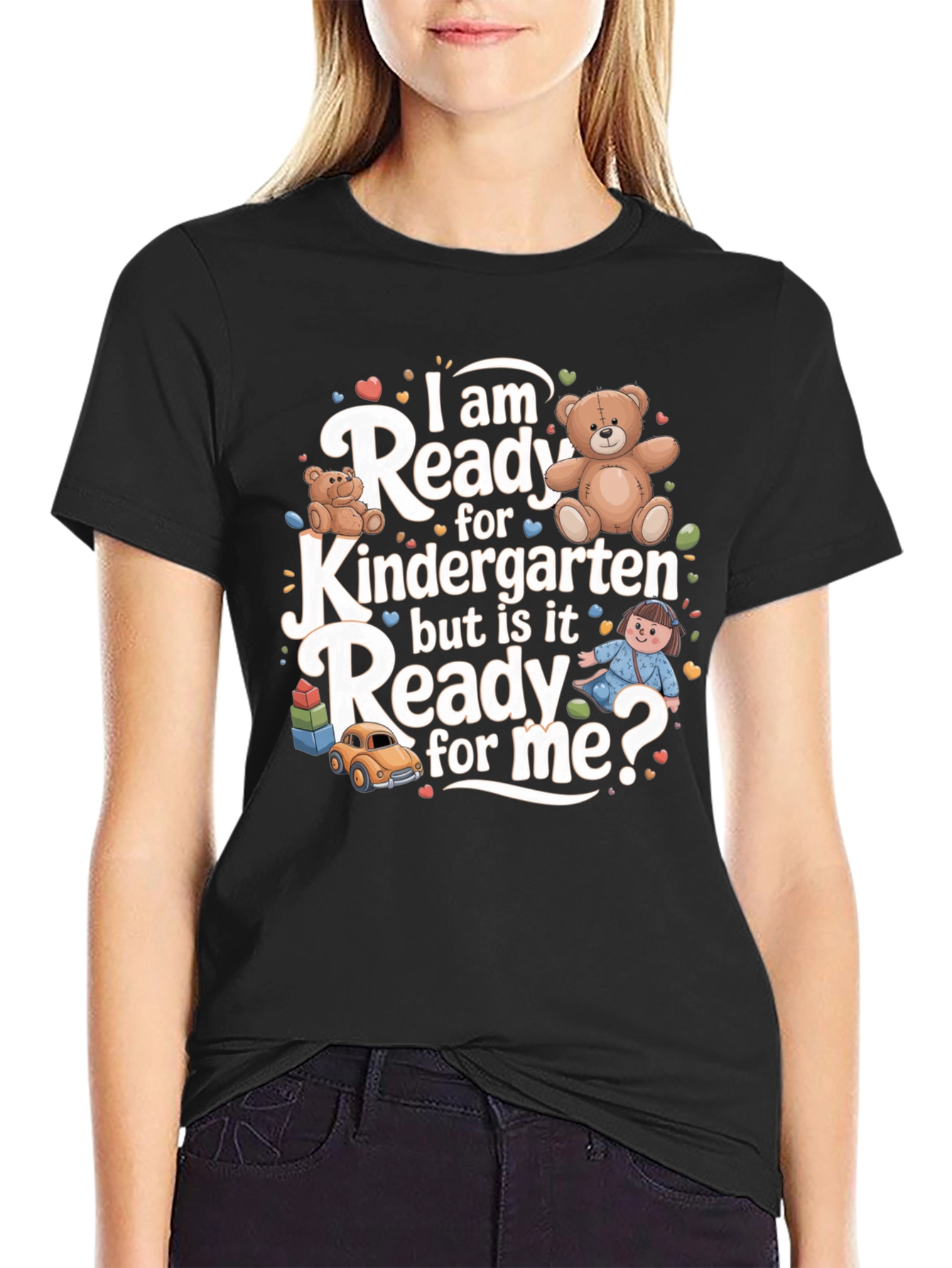 Get your little one ready for kindergarten with this adorable graphic tee! This black t-shirt features a playful design with teddy bears, a toy car, and a little girl, along with the phrase "I am Ready for Kindergarten but is it Ready for me?". The colorful graphic is perfect for back-to-school or everyday wear. Made from a soft, comfortable fabric, this tee is perfect for active kids. Let your child express their excitement for starting kindergarten with this cute and stylish t-shirt. Makes a great gift for any kindergartener!