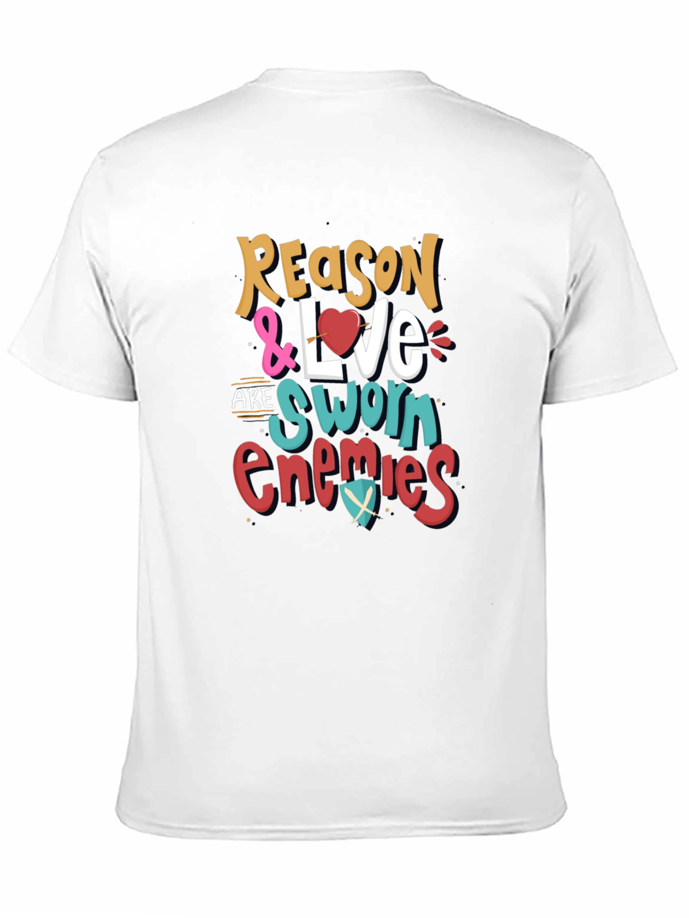Show your playful side with this eye-catching black graphic tee! The shirt features a vibrant and fun design that reads "Reason & Love are Sworn Enemies" in a mix of lively colors and playful fonts. A heart pierced with an arrow and a shield add whimsical touches. This tee is perfect for casual wear, adding a pop of personality to your everyday style. Made from a comfortable-looking fabric, it's ideal for expressing your unique outlook. Wear it out with friends, to a casual date, or simply while lounging at home for a relaxed, stylish look.