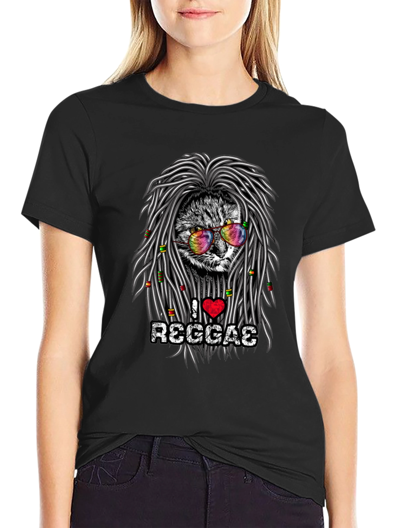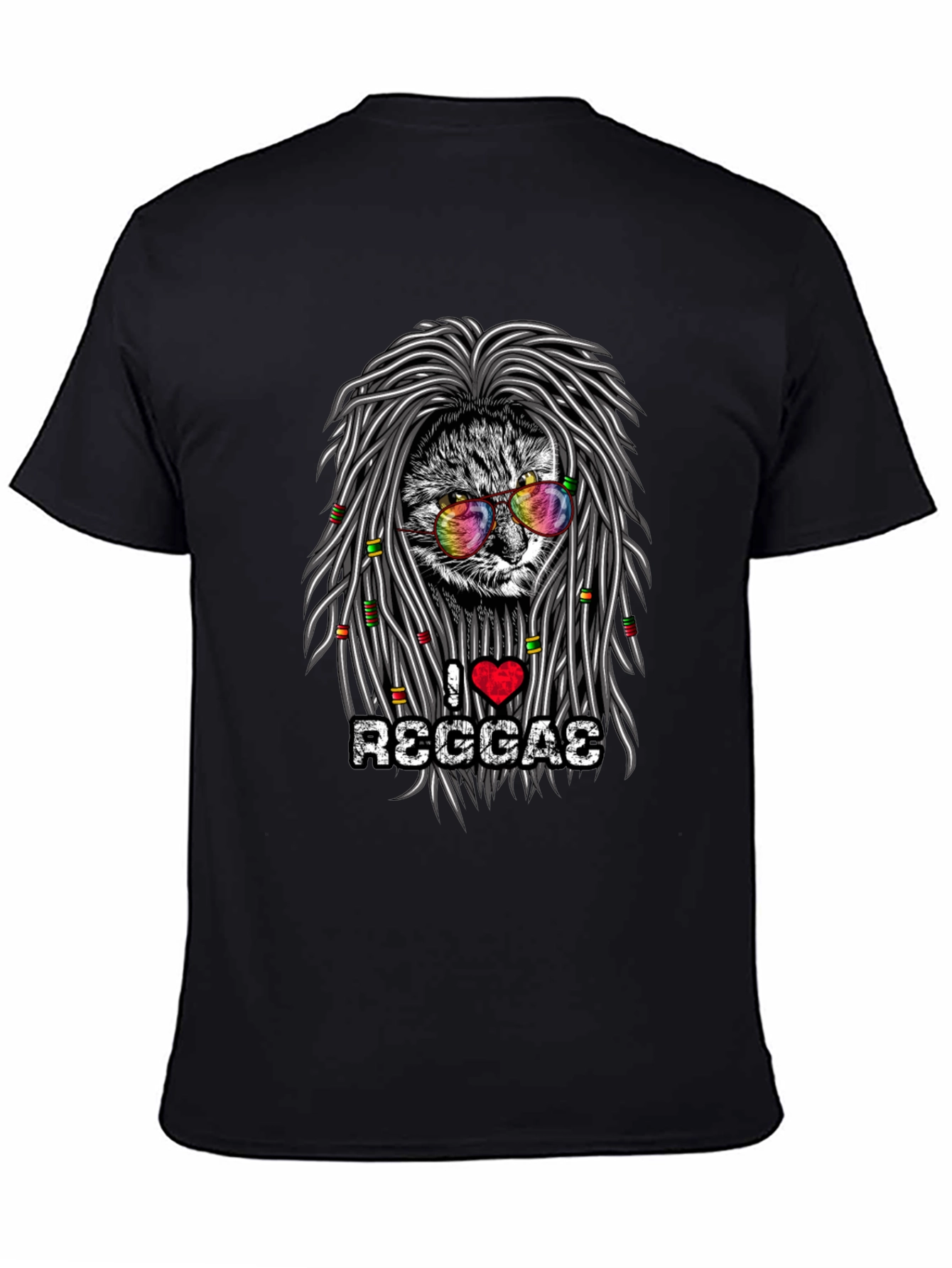 Show your love for reggae with this unique t-shirt! The design features a cool cat sporting dreadlocks and rainbow glasses, adorned with classic reggae colors. Below, the phrase "I [heart] Reggae" boldly proclaims your musical passion. Made from a comfortable, breathable fabric, this black t-shirt is perfect for casual wear, music festivals, or adding a touch of Jamaican vibe to your everyday style. The striking graphic print is sure to turn heads and spark conversations. Get ready to spread positive vibes and represent your favorite music genre with this eye-catching reggae cat t-shirt!