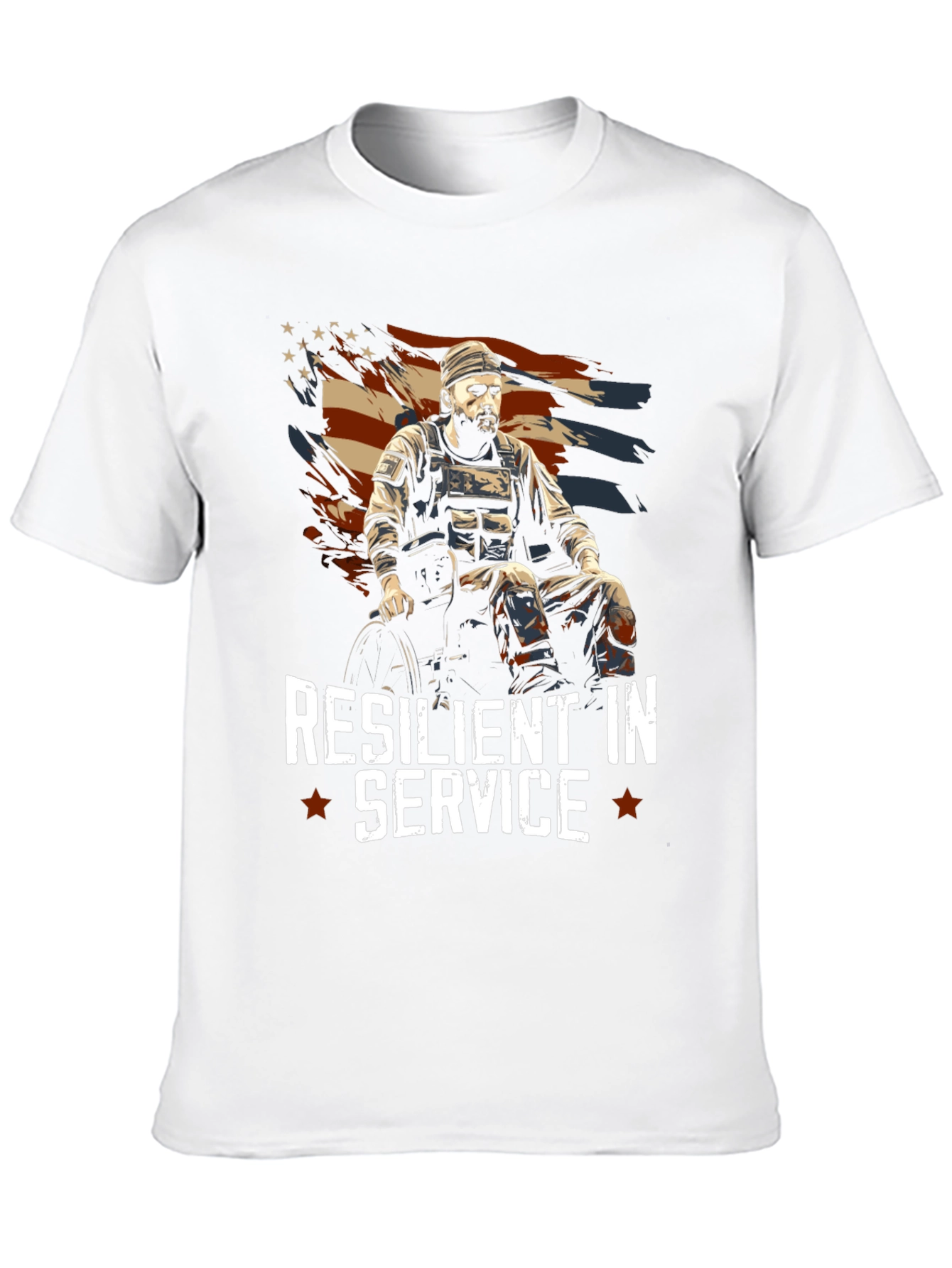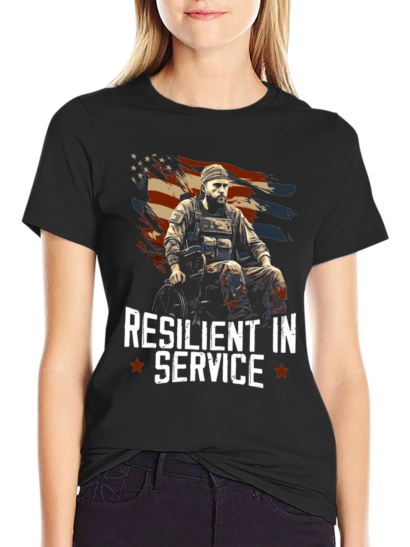 Show your support for our veterans with this bold graphic tee. The design features a striking image of a veteran in uniform, set against an American flag backdrop. The powerful text "Resilient In Service" is displayed prominently, emphasizing the strength and dedication of our armed forces. Made from a comfortable, breathable fabric, this t-shirt is perfect for everyday wear or patriotic events. A meaningful way to honor and remember those who have served, this tee is a must-have for any proud American. Wear it to show your appreciation and spark conversations about the importance of veteran support.