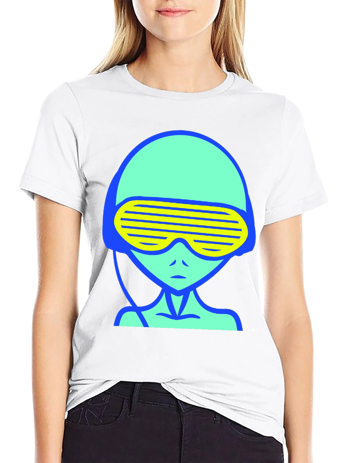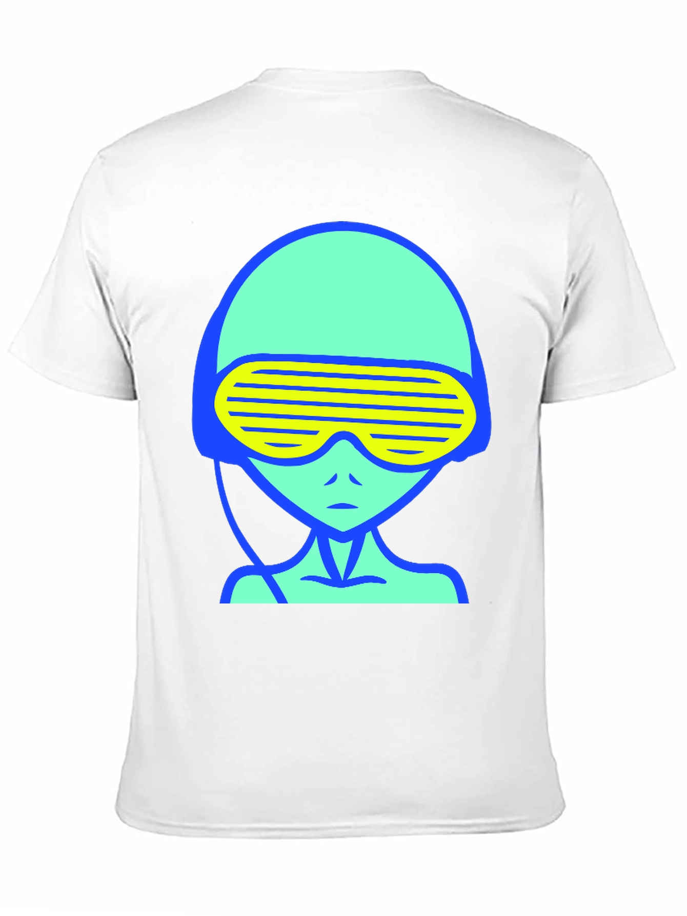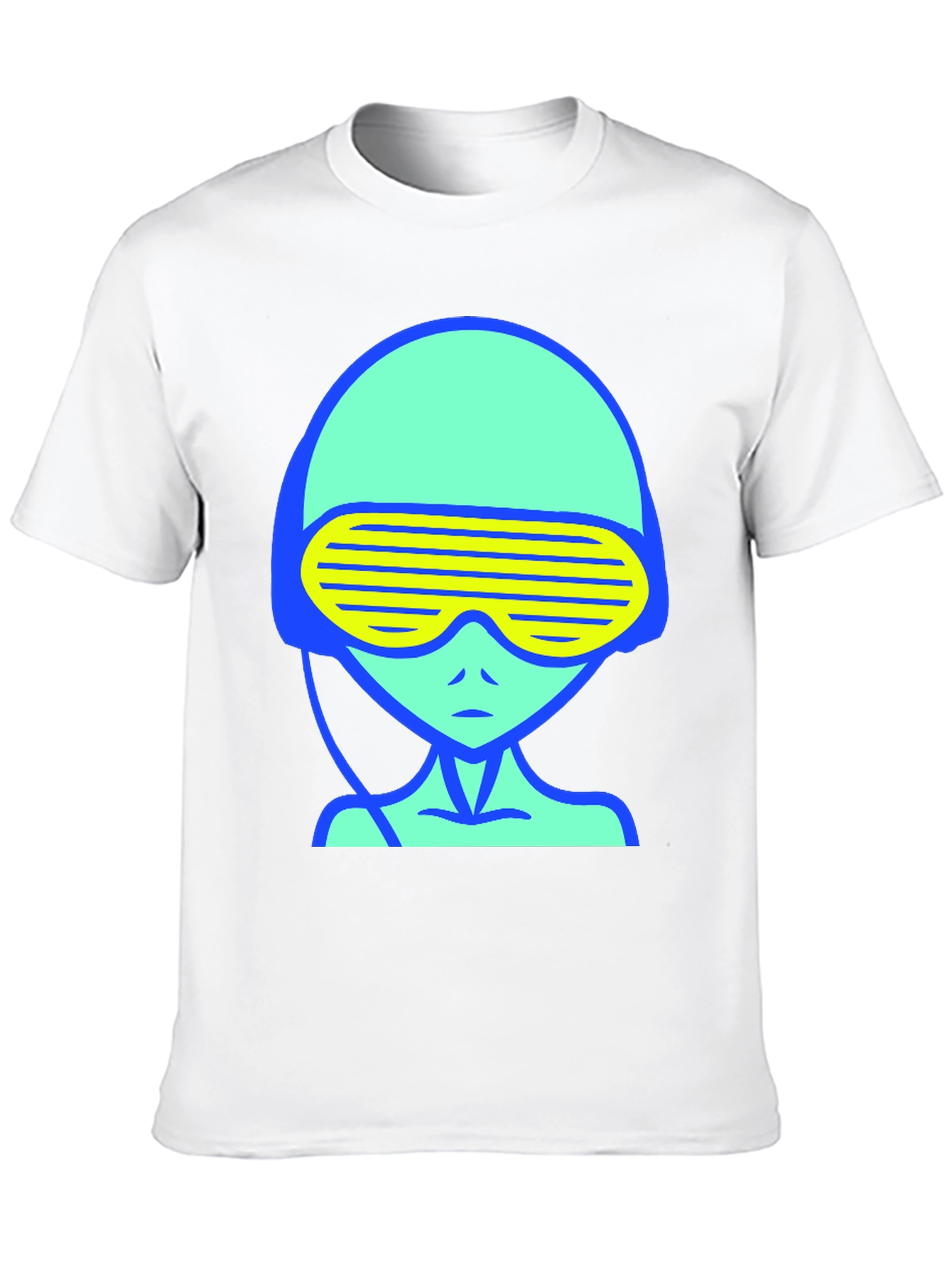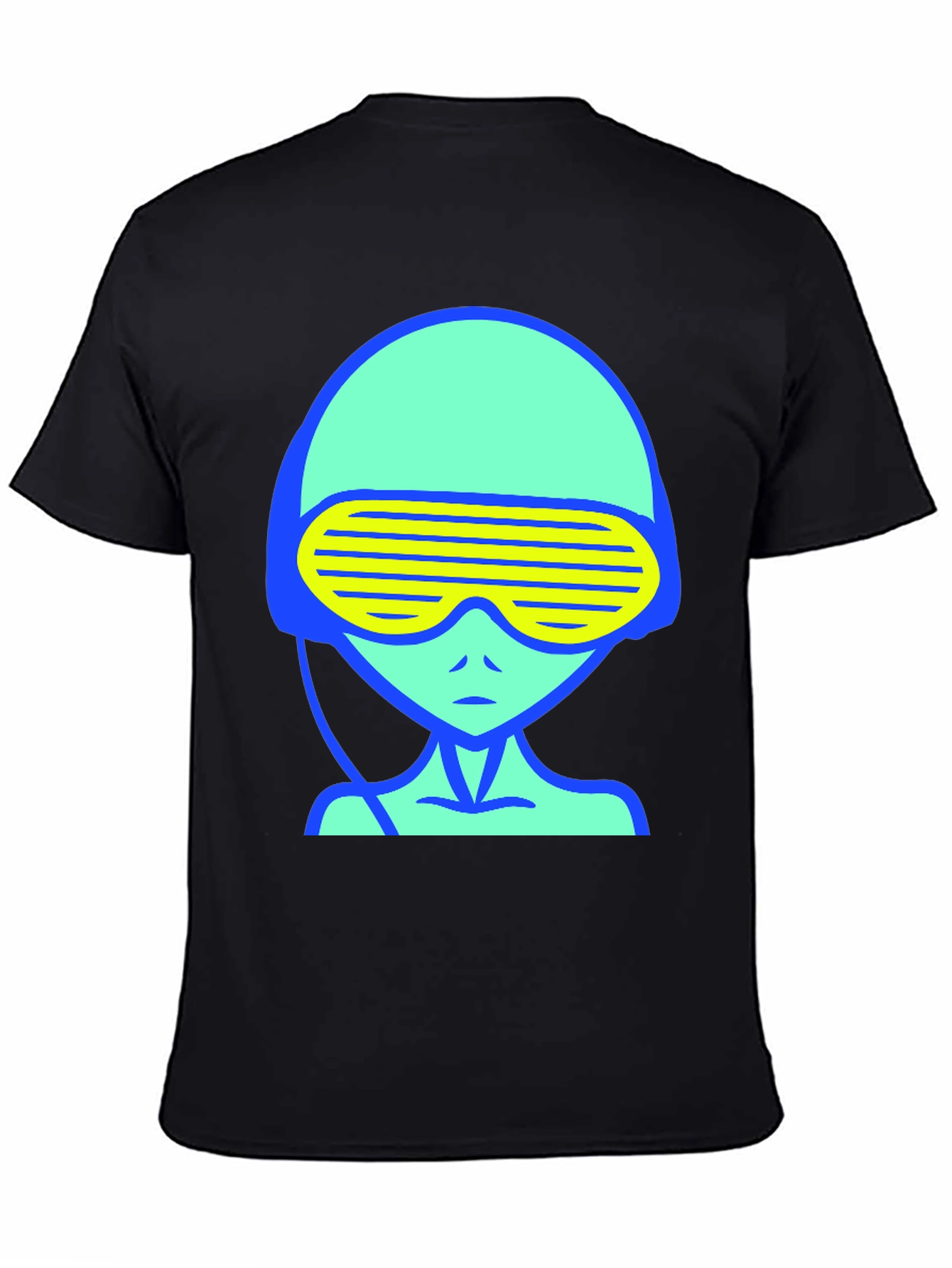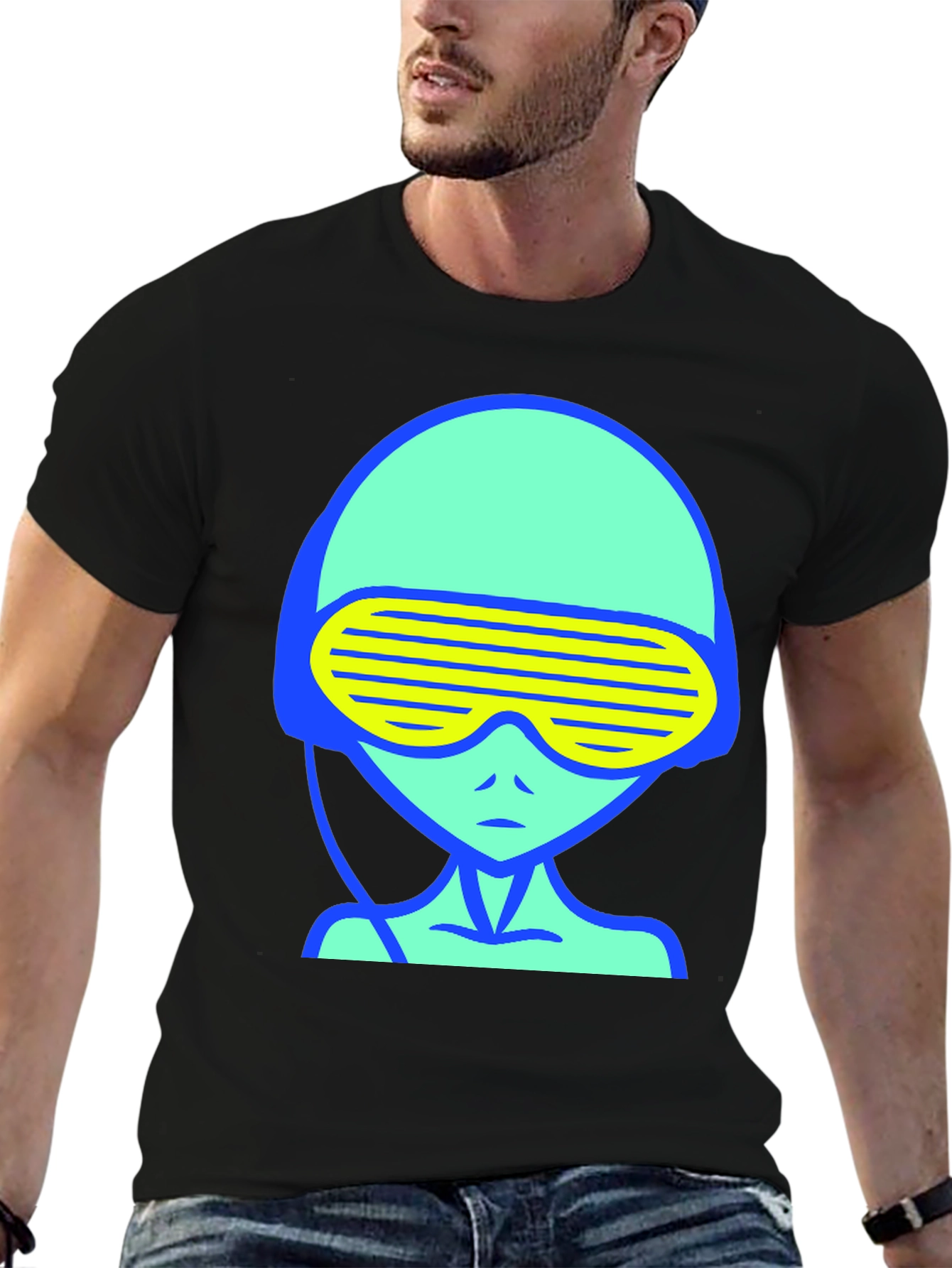 Stand out with this unique black cotton t-shirt featuring a retro-futuristic alien graphic. The design showcases a mint green alien head with bold blue outlines and striking yellow, horizontal-striped visor-style glasses. This eye-catching tee is perfect for casual wear, concerts, or making a statement. Made from comfortable cotton, it's breathable and easy to care for. Add a touch of quirky style to your wardrobe with this conversation-starting t-shirt. Pair it with your favorite jeans or shorts for a relaxed, individual look. Great for sci-fi fans and those who appreciate retro aesthetics.