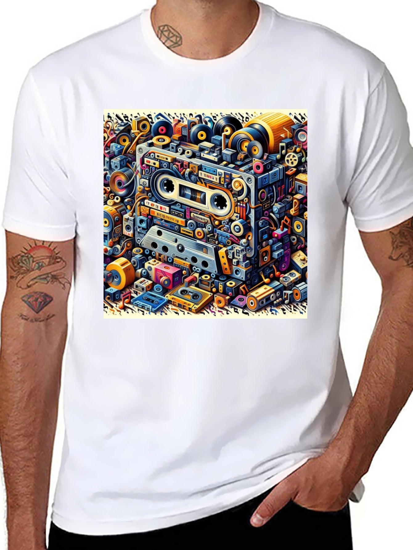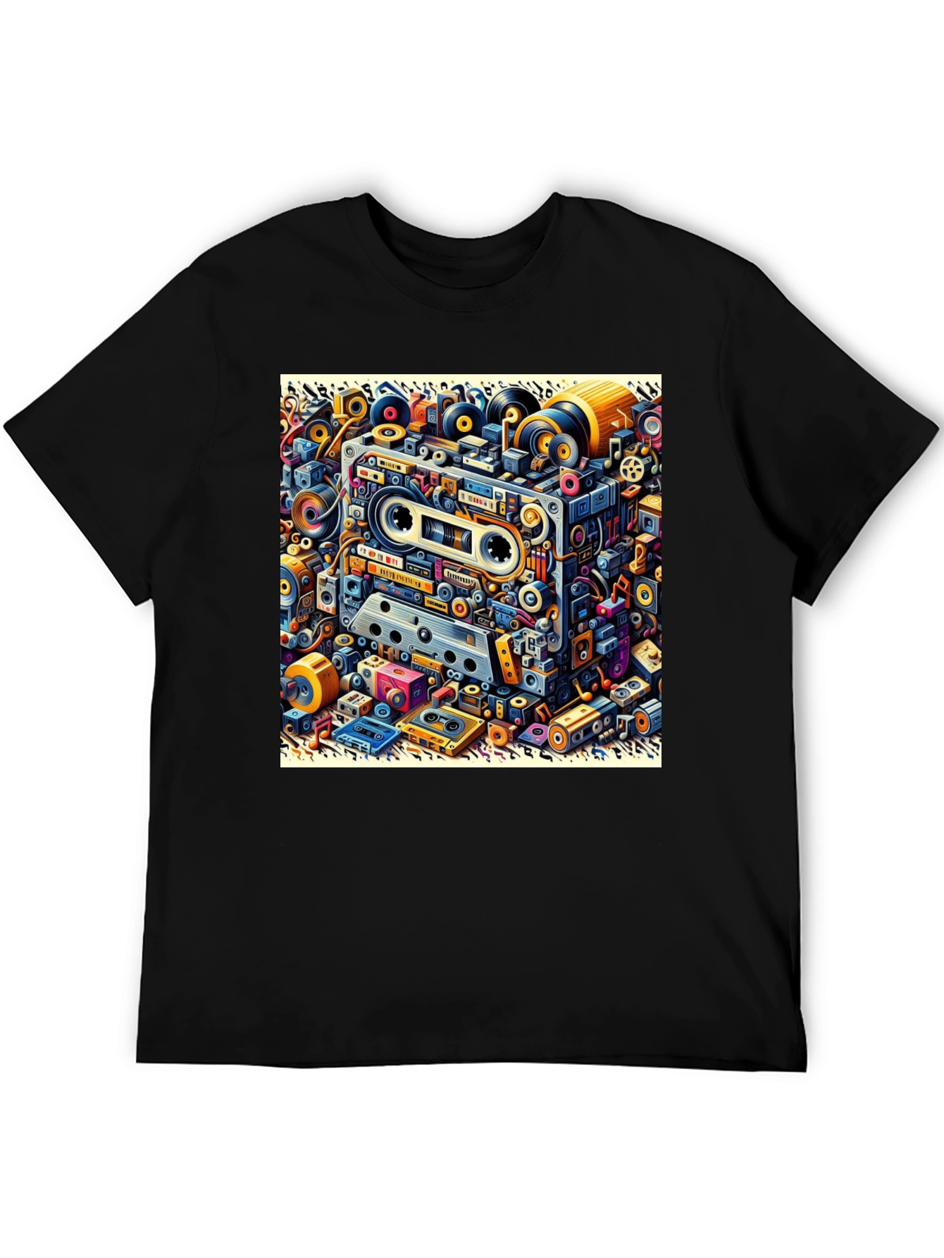 Step back in time with this eye-catching t-shirt featuring a vibrant, cartoonish illustration of a retro cassette tape player. The intricate design combines classic audio elements with a modern artistic flair. Made from soft, breathable cotton, this black tee offers both style and comfort. Its unique graphic makes it a great conversation starter and a must-have for music lovers and vintage enthusiasts. Pair it with your favorite jeans for a casual look, or dress it up with a blazer for a night out. Perfect for expressing your love of music and retro aesthetics!