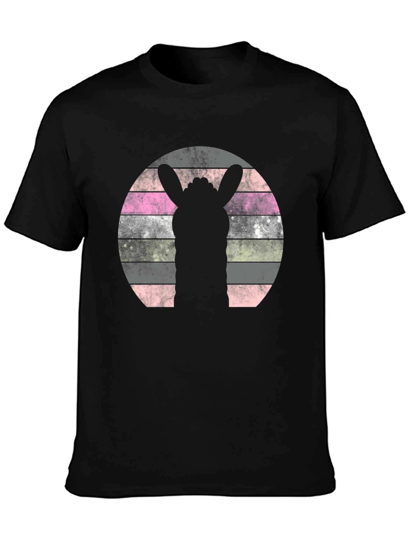 Show off your quirky style with this vintage-inspired graphic tee. This t-shirt features a bold llama silhouette in a round striped background. The design has a distressed, retro aesthetic. Made from a soft, comfortable fabric. The t-shirt has a classic fit with short sleeves and a crew neck. It's perfect for casual wear, making a statement, or adding a touch of whimsy to your wardrobe. Great for llama lovers or anyone who enjoys unique graphic tees. Pair it with jeans, shorts, or your favorite bottoms for an effortlessly cool look.