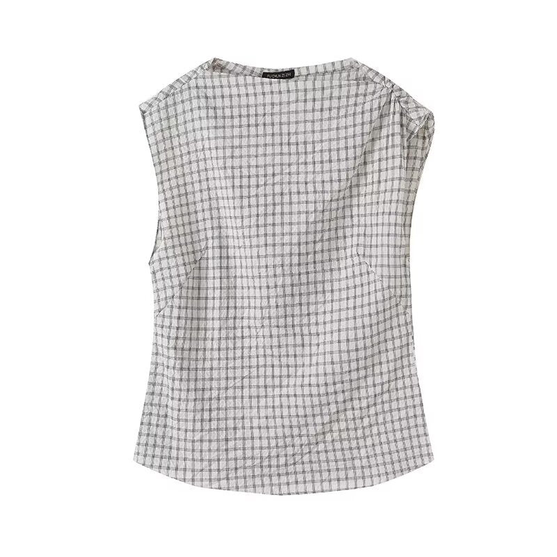 Round neck sleeveless plaid pleated versatile shirt top for women