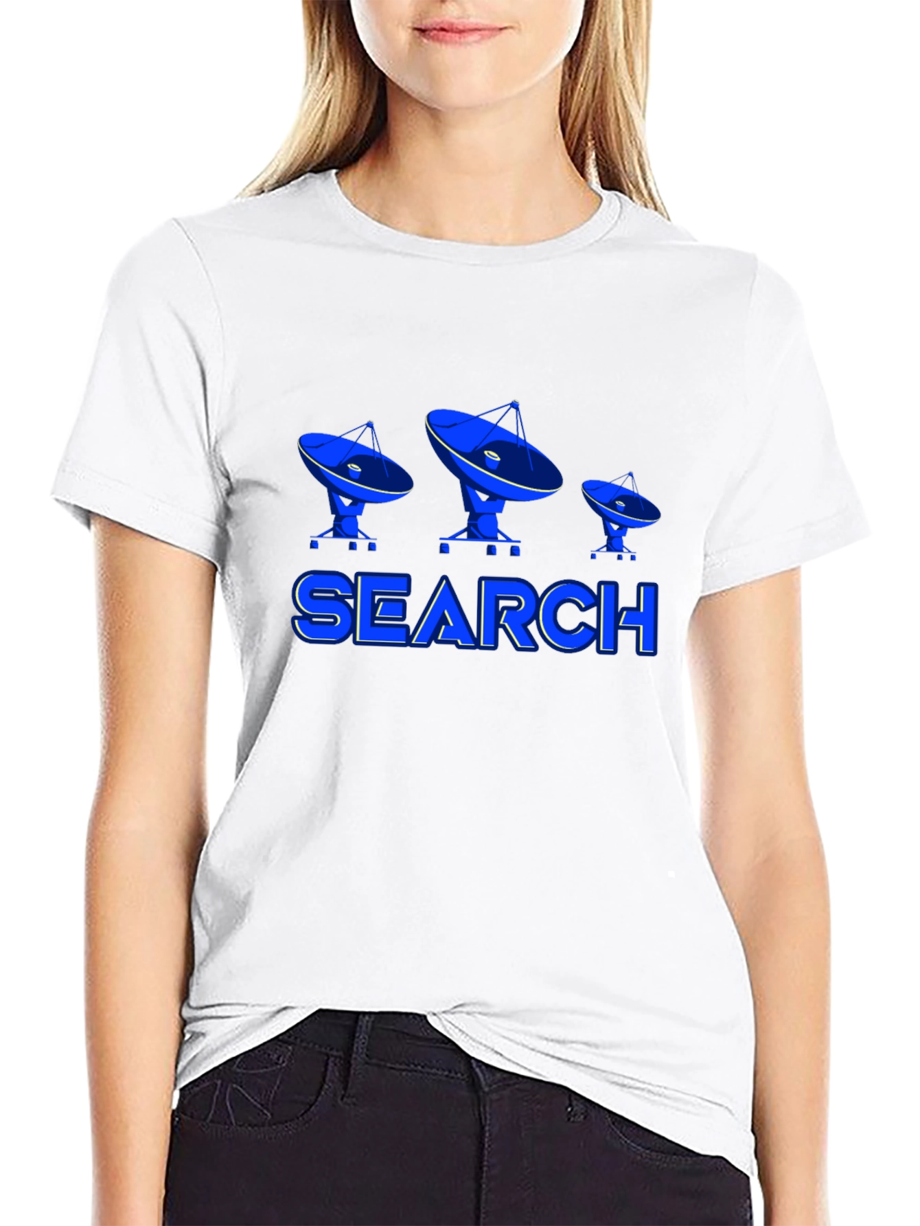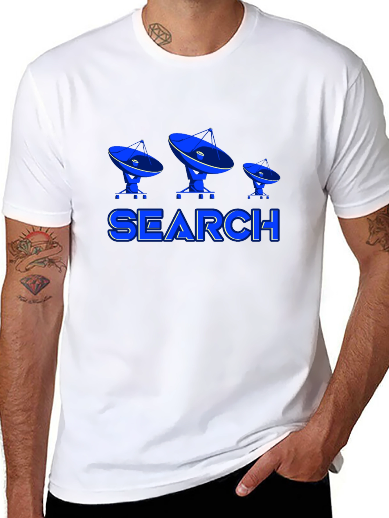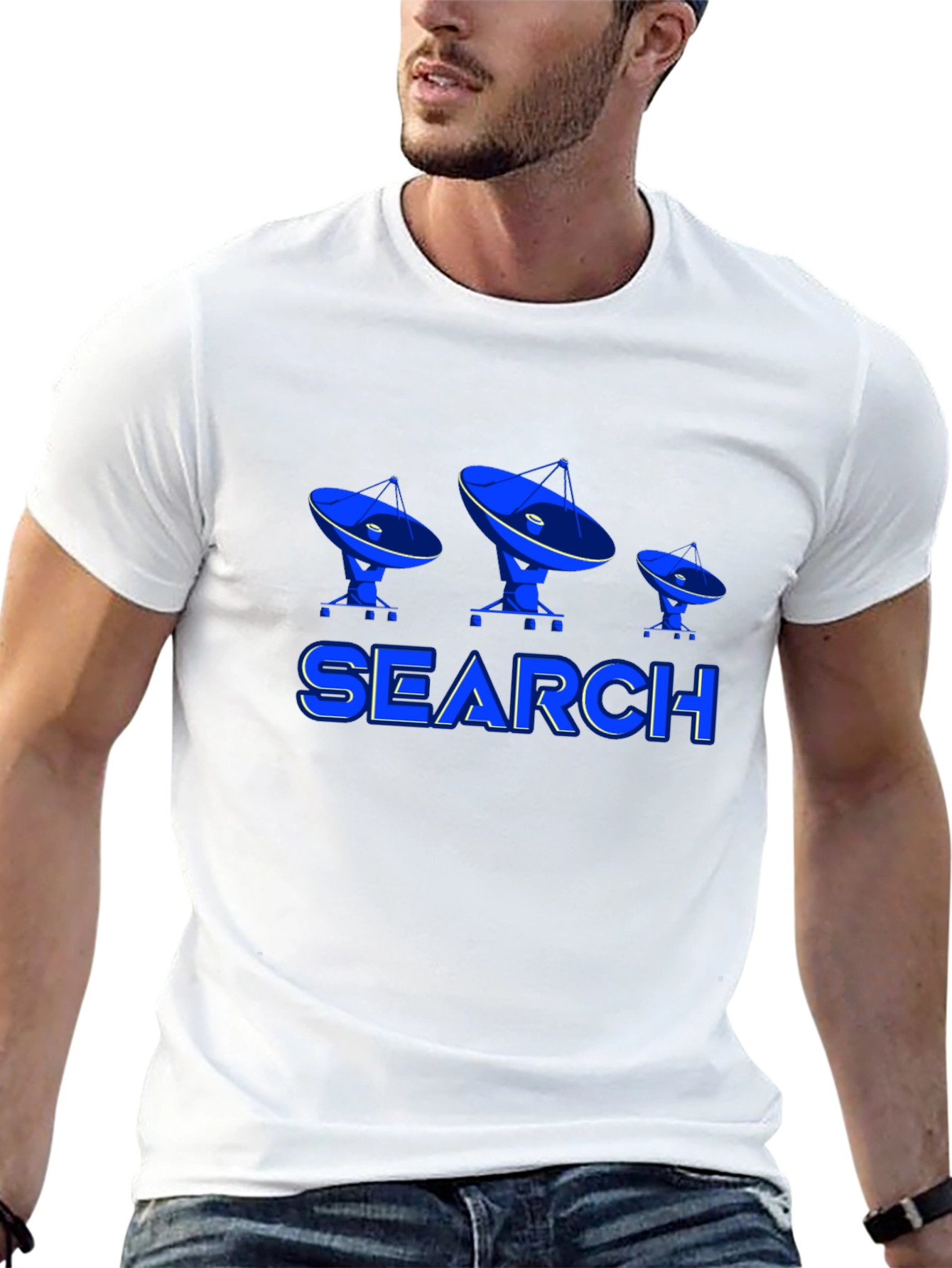 This eye-catching black T-shirt features a vibrant blue design with stylized satellite dishes and the word "SEARCH." The design suggests a connection to astronomy, exploration, or the search for extraterrestrial life. Made from a comfortable-looking fabric, this tee is perfect for casual wear, science enthusiasts, or anyone with a sense of adventure. Pair it with jeans or shorts for a relaxed yet stylish look. Show off your passion for the cosmos with this unique and conversation-starting T-shirt.