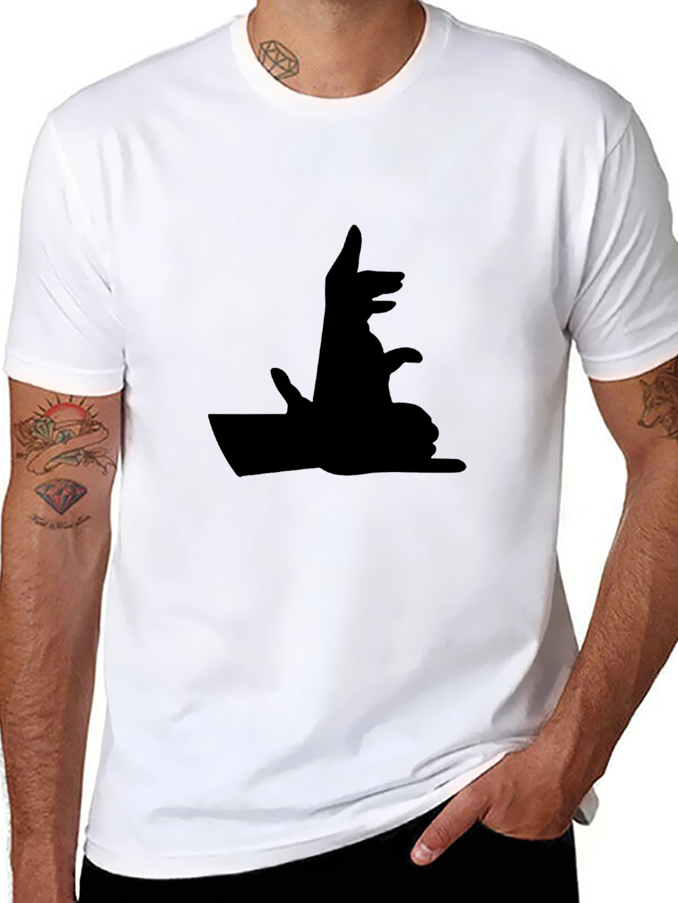 Showcase your love for shadow puppets with this unique black t-shirt. The shirt features a stylized silhouette of a hand making a dog puppet, adding a touch of whimsy to your everyday style. Made from a soft, comfortable fabric, this shirt is ideal for casual wear. The minimalist design makes it easy to pair with jeans, shorts, or even dress pants, offering versatility for any occasion. This playful and eye-catching t-shirt is perfect for those who appreciate art and a touch of nostalgia. Wear your creativity and make a statement with this exclusive design.