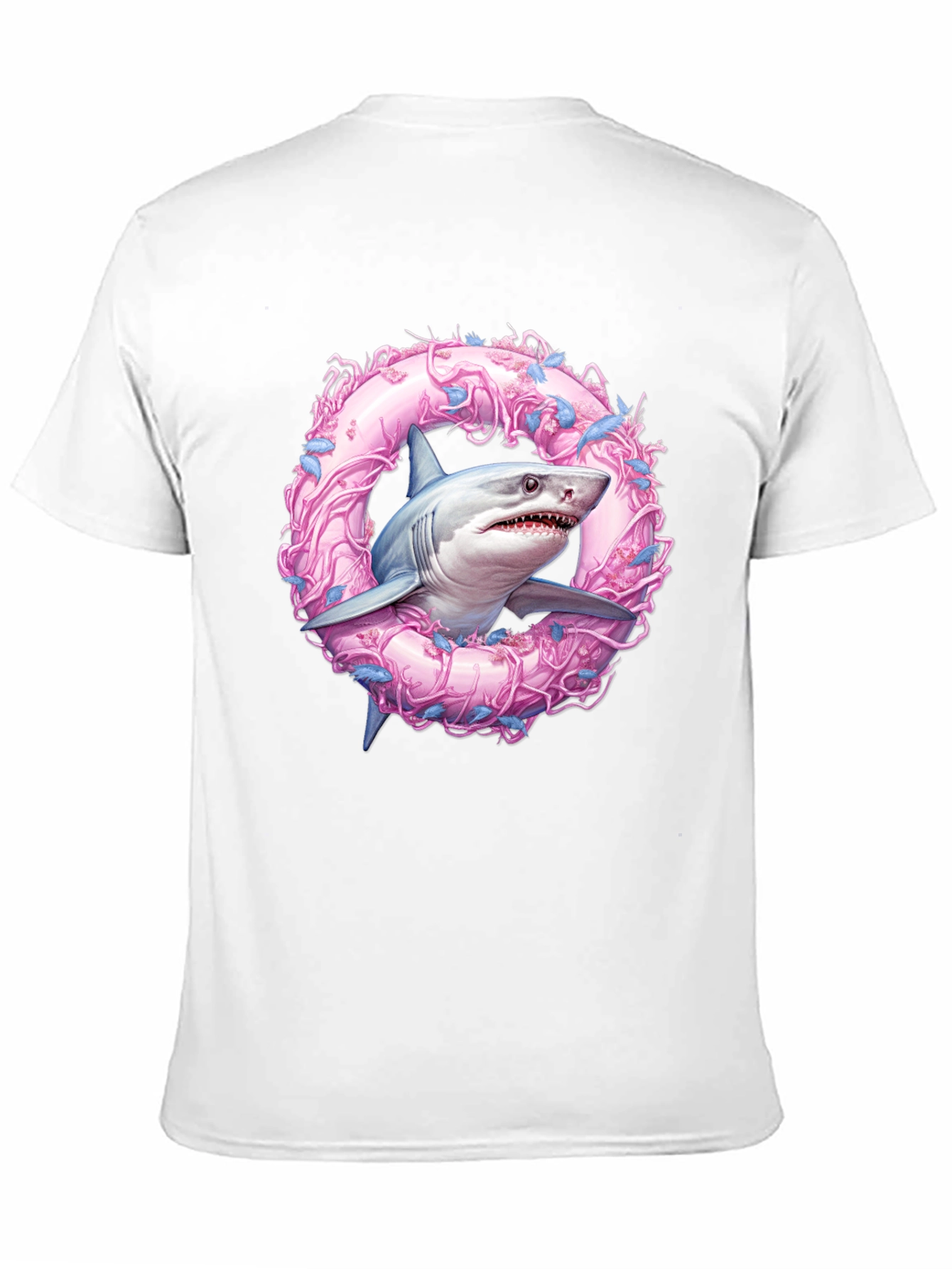 Dive into style with this unique black t-shirt! Featuring a striking graphic of a shark emerging from a whimsical pink wreath adorned with blue accents. The eye-catching design is printed on a comfortable, soft cotton material. Perfect for ocean lovers and those who want to make a statement, this tee is sure to turn heads. Pair it with your favorite jeans or shorts for a casual, cool look. Add a touch of sea-inspired fun to your wardrobe today!
