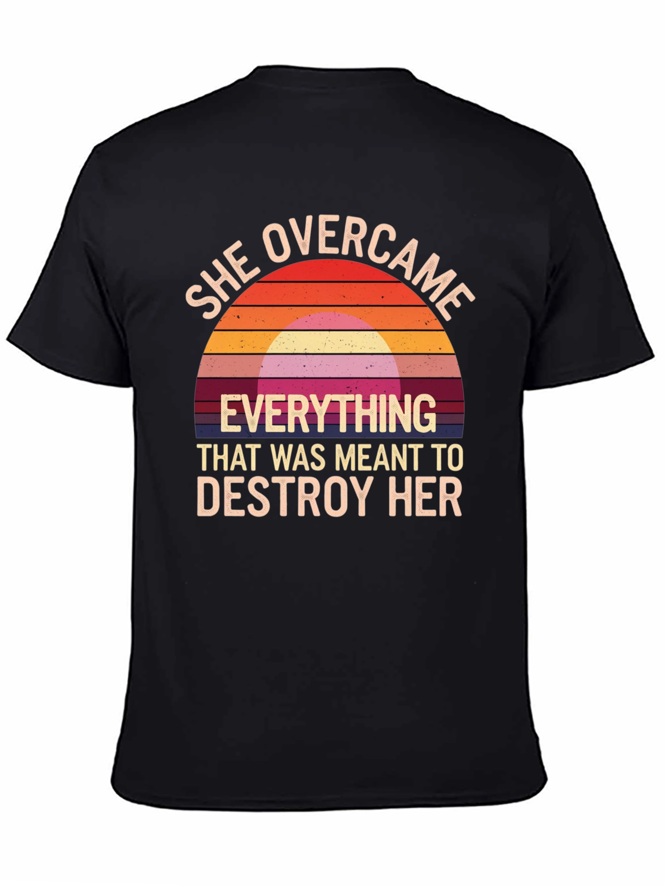 Empower yourself with this bold black t-shirt featuring a retro-style sunset graphic. The design includes a stacked text that reads "SHE OVERCAME EVERYTHING THAT WAS MEANT TO DESTROY HER." in an easy-to-read font. The graphic is a multi-colored semi-circle. This motivational t-shirt is perfect for casual wear and makes a powerful statement. Made from comfortable fabric, it's ideal for everyday use or as a thoughtful gift. Express your strength and resilience with this eye-catching tee.