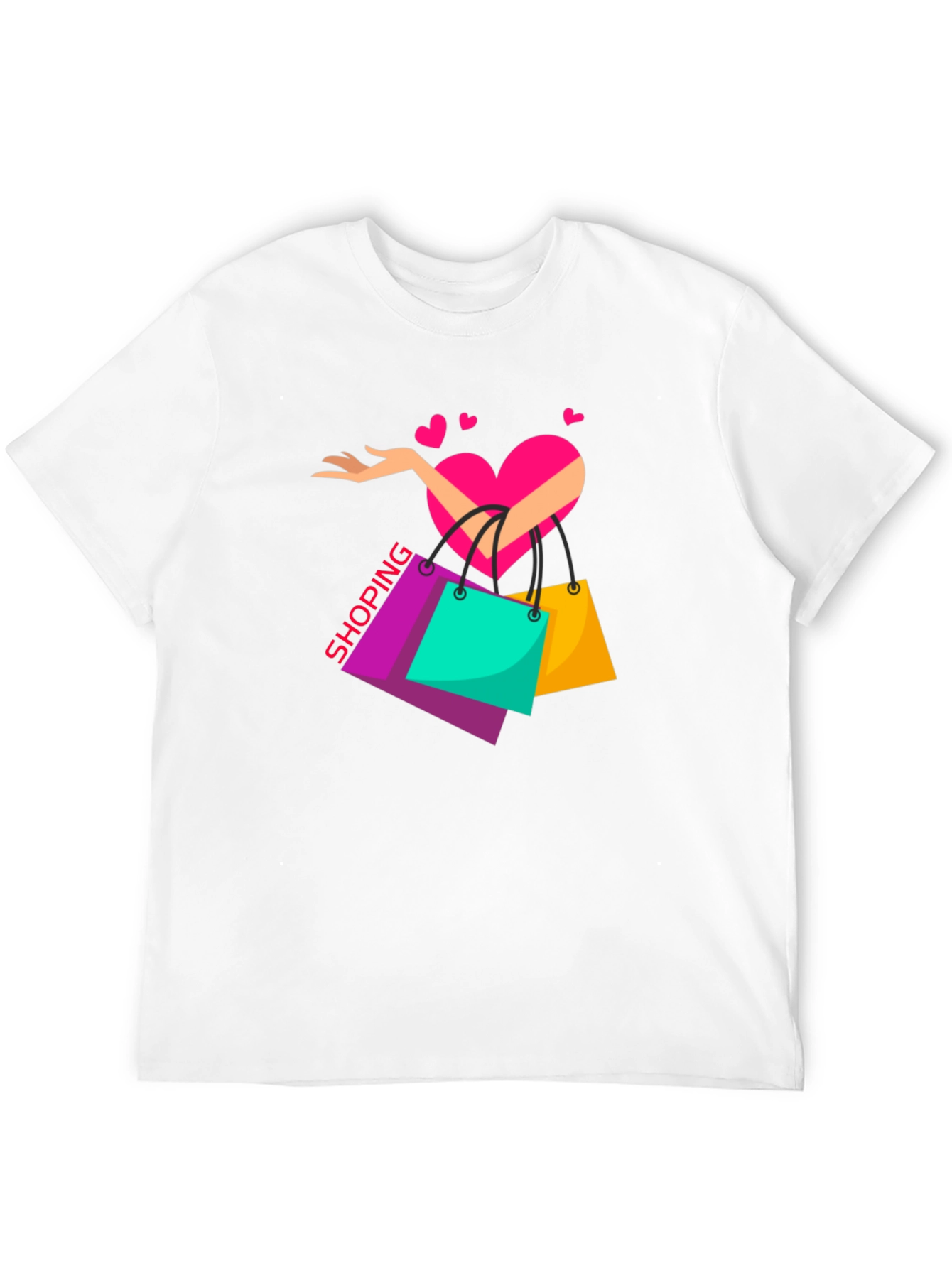 Express your love for shopping with this stylish black t-shirt. Featuring a vibrant graphic of shopping bags held by a hand emerging from a heart, it's perfect for fashion enthusiasts. The design includes the word "SHOPING", adding a playful touch. Made from comfortable fabric, this tee offers a great fit for everyday wear. Ideal for casual outings, shopping trips, or simply showing off your passion for retail therapy. A unique addition to any wardrobe, combining comfort, style, and a love for shopping!