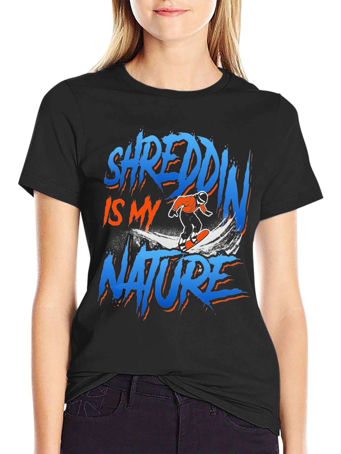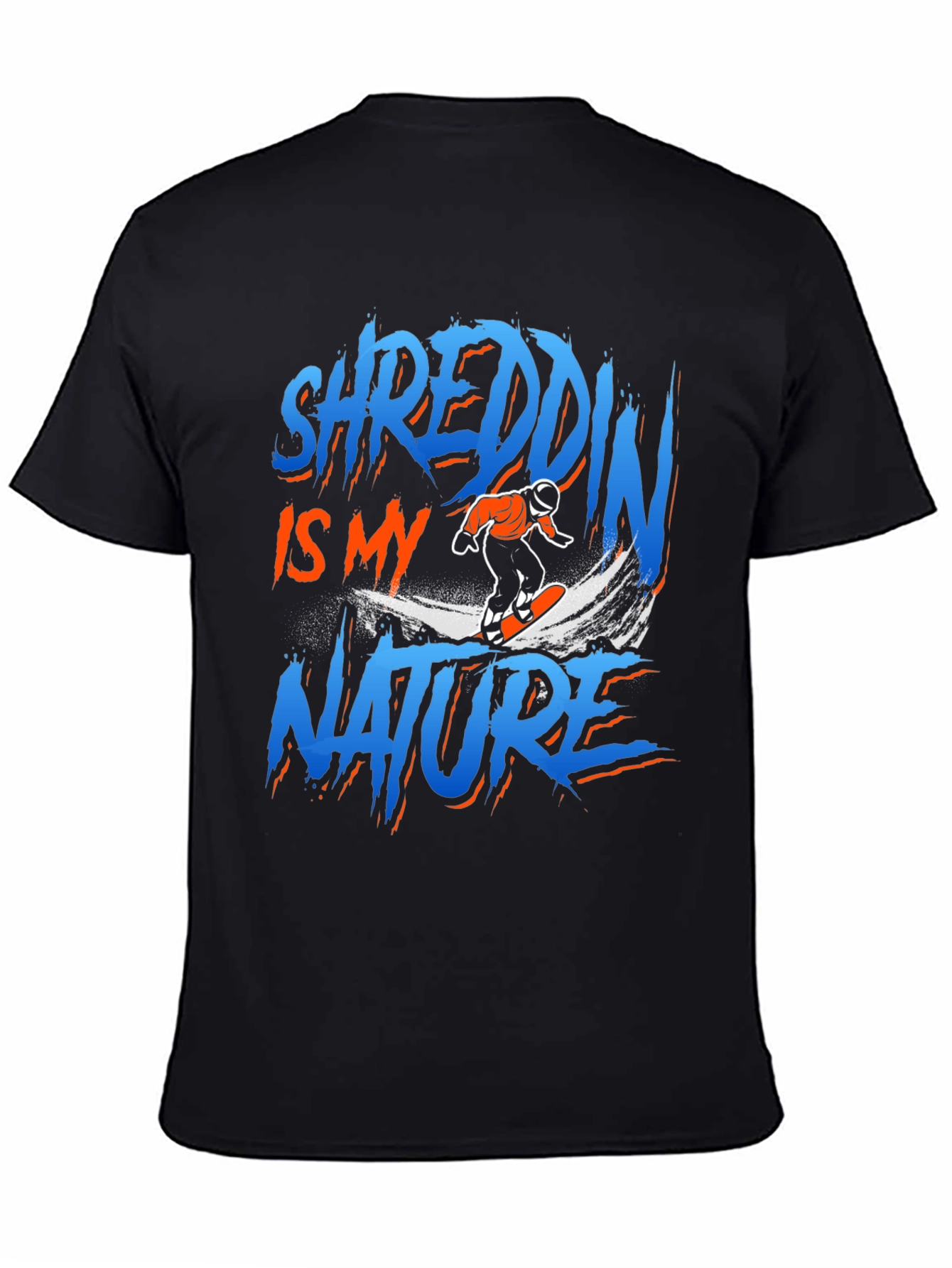 Show off your love for the slopes with this 'Shreddin' Is My Nature' graphic t-shirt. Made from a comfortable fabric, this black tee features a vibrant design with the words 'Shreddin' Is My Nature' in a striking blue and orange color scheme, alongside a cool snowboarding graphic. Perfect for everyday wear, hitting the slopes, or casual hangouts, this shirt lets you express your passion for snowboarding in style. A must-have addition to any snowboarder's wardrobe!