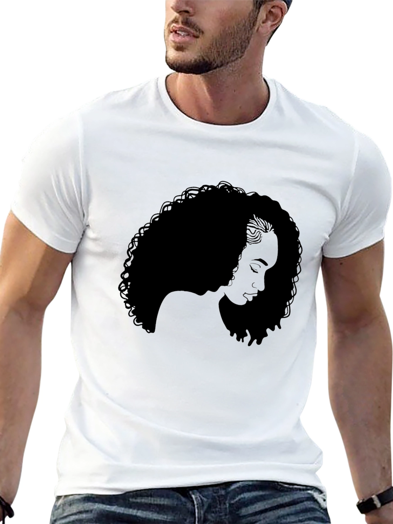 This stylish unisex t-shirt features a striking silhouette of a woman with a beautiful afro hairstyle. The design is printed in black, offering a sleek and modern look. Made from comfortable, breathable fabric, this tee is perfect for everyday wear. The classic cut makes it suitable for all body types. Whether you're heading to a casual outing or just relaxing at home, this t-shirt offers a unique way to express your style and celebrate feminine beauty. Pair it with jeans, shorts, or a skirt for a versatile and fashionable look. A must-have addition to any wardrobe!