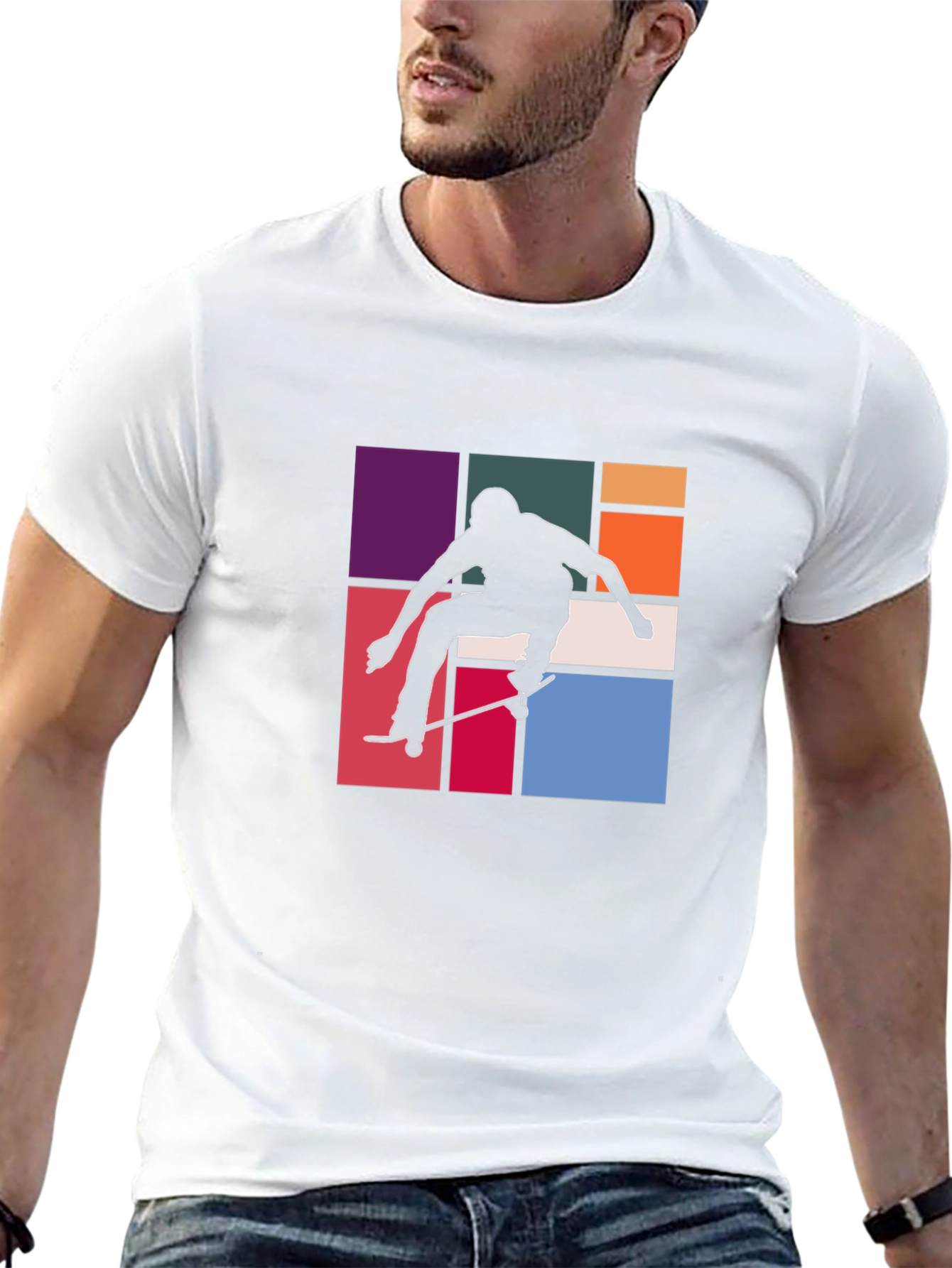 Show off your love for skateboarding with this stylish black tee! It features a bold, colorful graphic of a skateboarder in action, silhouetted against a retro geometric background. The vibrant square pattern includes shades of purple, orange, red, and blue, making it a visually striking piece. Made from a soft, comfortable fabric, this t-shirt is perfect for everyday wear, whether you're hitting the skate park or just hanging out with friends. Express your individuality and passion for skateboarding with this eye-catching tee.