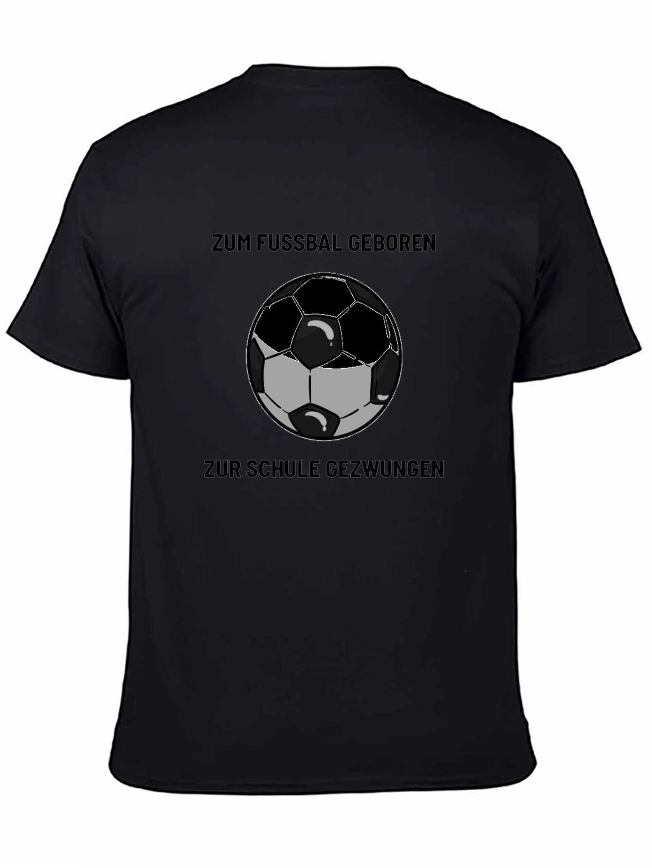 Show your love for soccer with this cool black t-shirt! Featuring a stylish soccer ball graphic and the German phrase "Zum Fussbal Geboren, Zur Schule Gezwungen" (Born to play soccer, Forced to go to school), this shirt is perfect for passionate players and fans alike. Made from a comfortable material, this tee is great for everyday wear, casual outings, or cheering on your favorite team. Express your dedication to the beautiful game with this unique and eye-catching design!