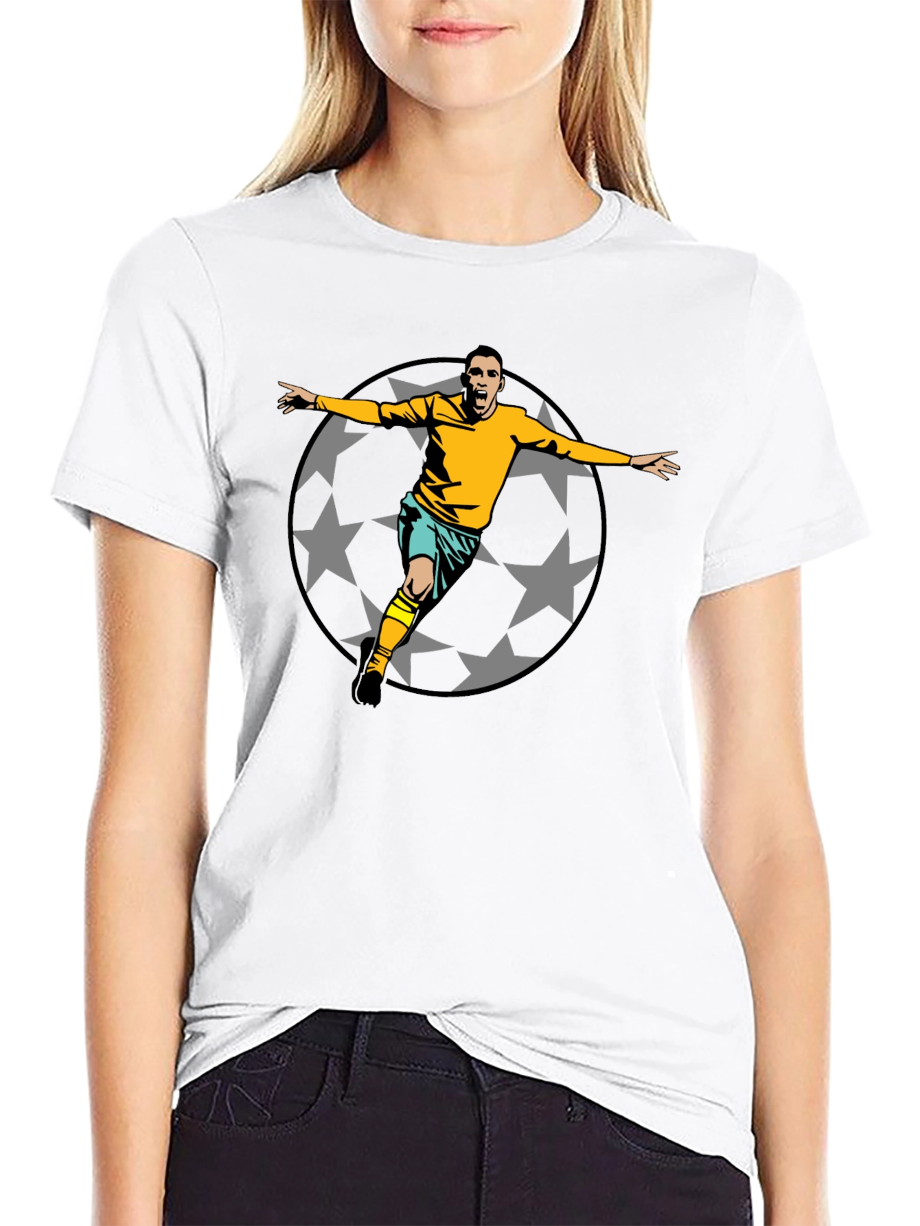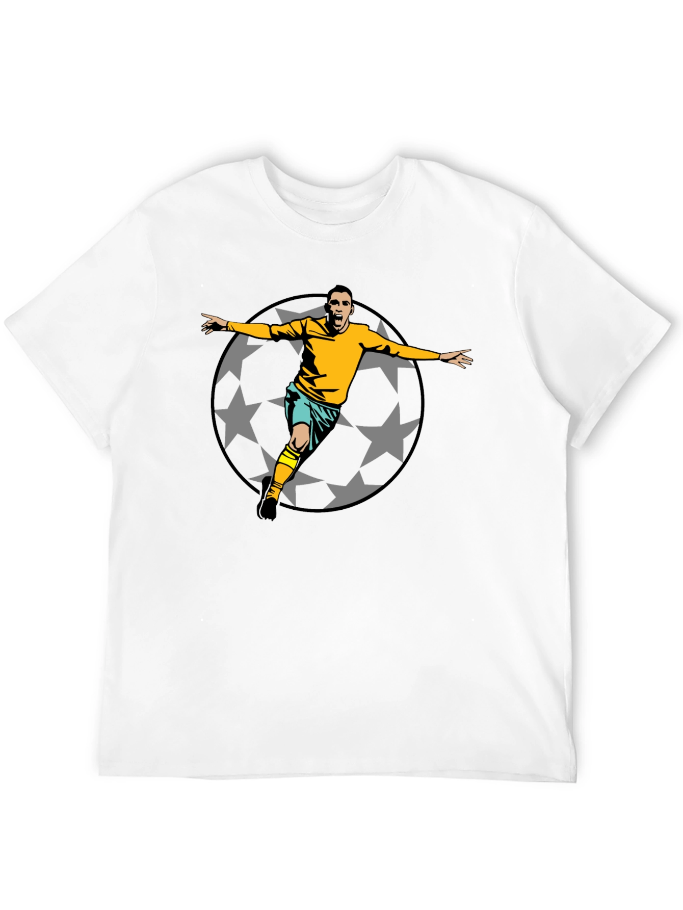 Show your love for the beautiful game with this striking black cotton t-shirt. The tee features a bold graphic print of a soccer player celebrating a goal against a backdrop of stars. Made from comfortable, breathable cotton, this t-shirt is perfect for casual wear, sports events, or simply expressing your passion for soccer. The vibrant colors and detailed design make this a standout piece in any wardrobe. Comfortable to wear. Ideal for fans and players alike, this t-shirt is a must-have addition to any soccer enthusiast's collection. Get yours today and celebrate the spirit of the game!