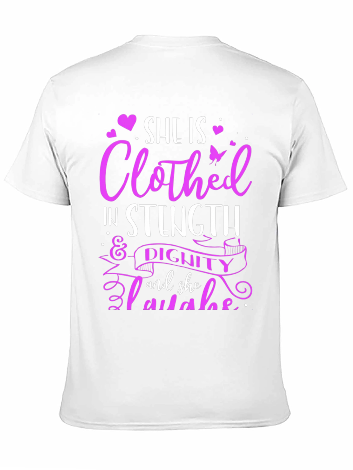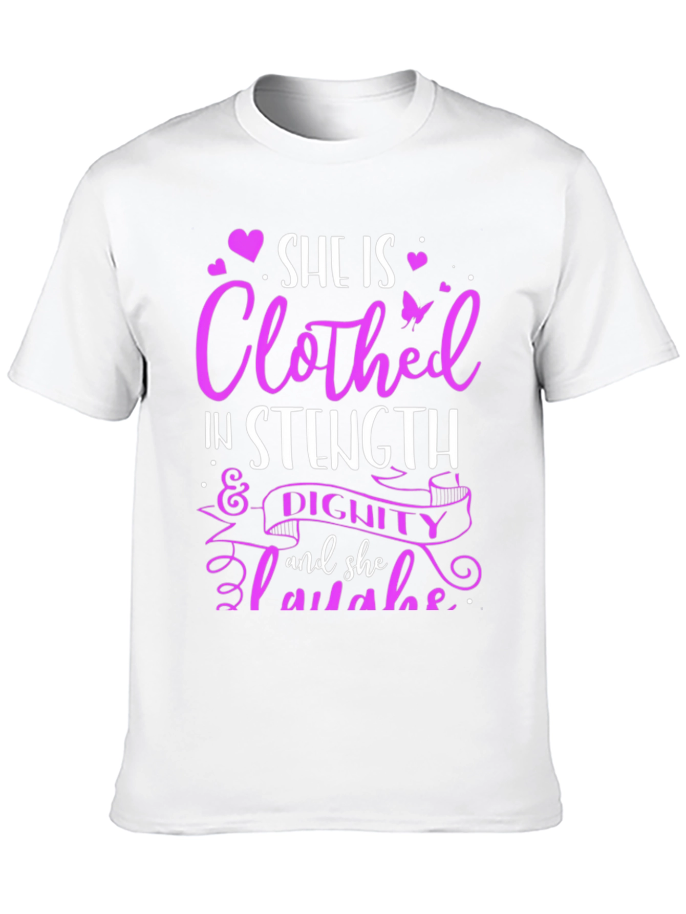 Display your inner strength with this stylish black T-shirt. The bold, eye-catching graphic features the inspiring message, "She is clothed in strength & dignity and she laughs..." adorned with hearts and delicate flourishes in a vibrant pink hue. Crafted from soft, breathable fabric, this tee offers both comfort and a powerful statement. Perfect for everyday wear, this motivational piece pairs effortlessly with jeans, leggings, or shorts. Let your confidence shine and inspire others with this unique and meaningful addition to your wardrobe.