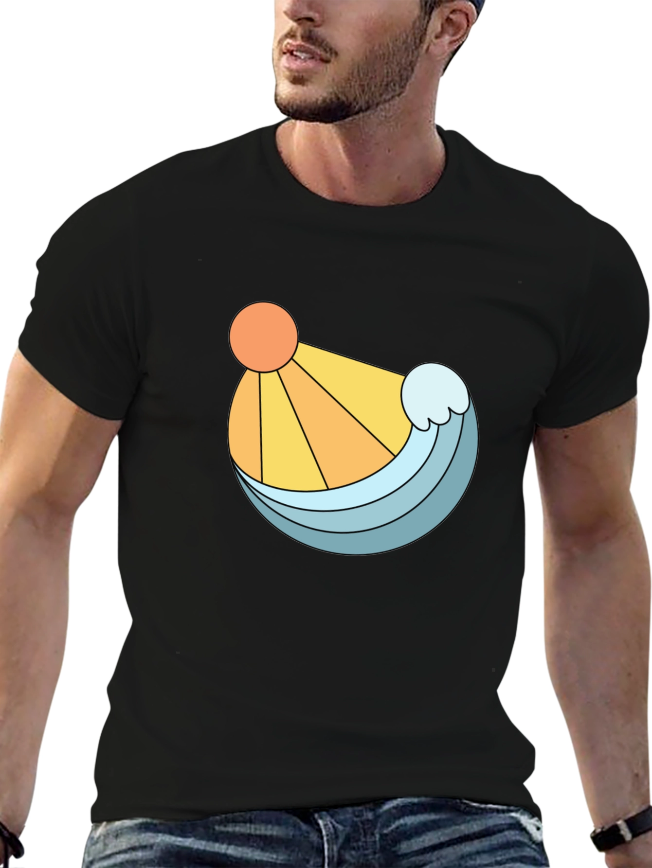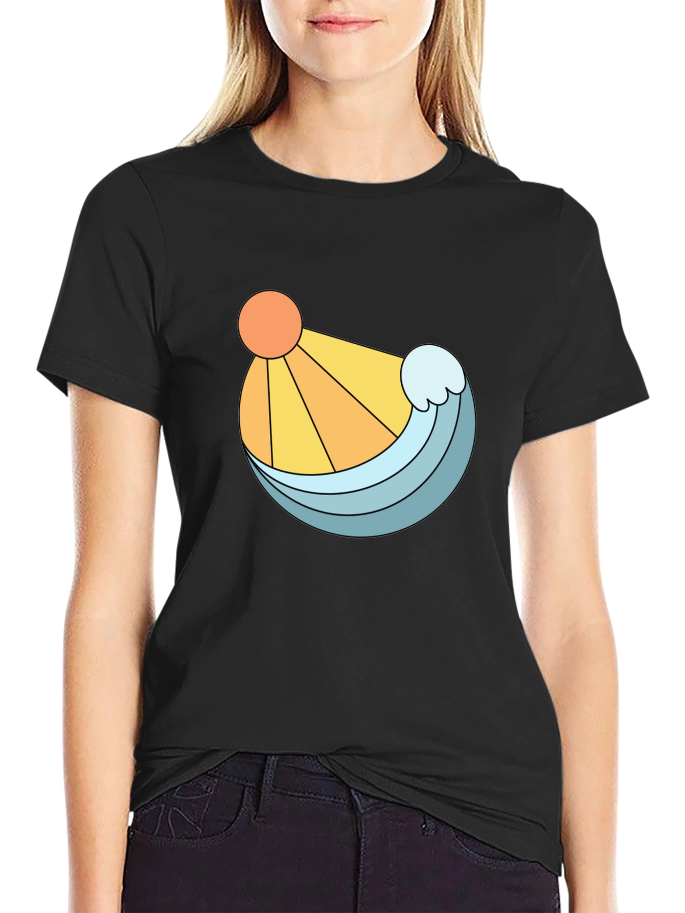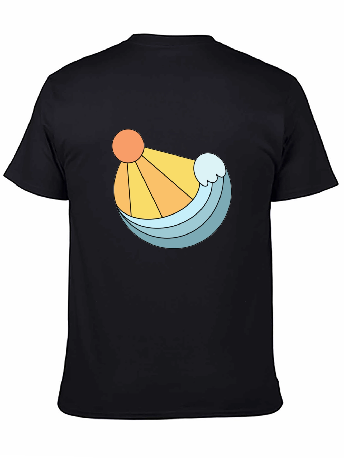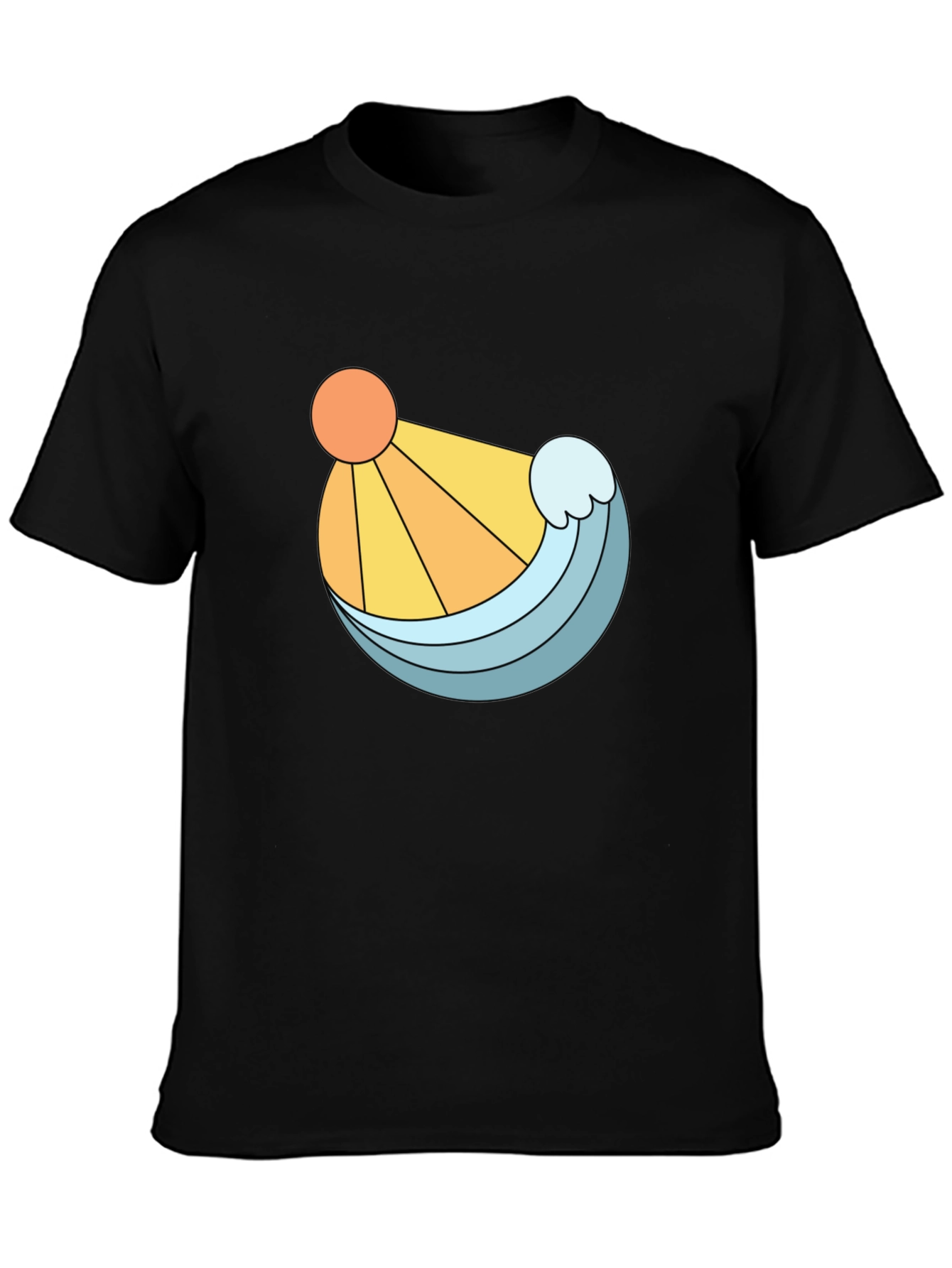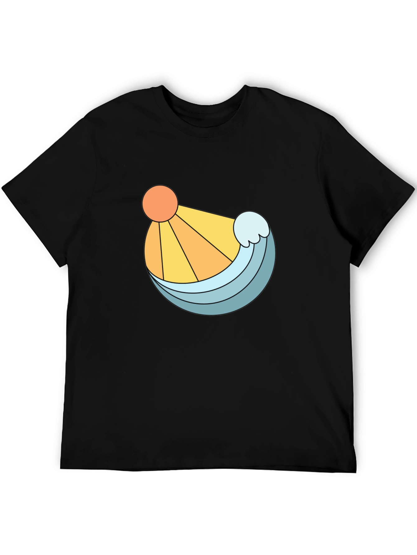 Embrace a sunny, beachy vibe with this stylish black t-shirt. Featuring a unique graphic design of a bright orange sun and a refreshing blue wave, this tee is perfect for adding a pop of color to your casual wardrobe. The clean lines and bold illustration make it a standout piece, while the classic black backdrop ensures it pairs effortlessly with jeans, shorts, or joggers. Made from a comfortable-looking fabric, this t-shirt offers both style and ease. Whether you're strolling along the beach, hanging out with friends, or simply relaxing at home, this shirt is a great choice.